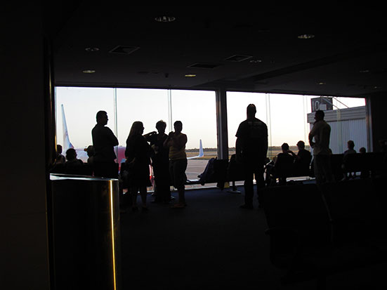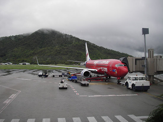 Ich bestelle bei Taxifon eine Karre und war mit dem Van ein paar Minuten später schon wieder auf Cairns International. So langsam bekomme ich Routine. Kann gut oder schlecht sein. Einchecken mit Gepäck, Extragewischt = AU$10 extra. Hatte ich in Münzen.