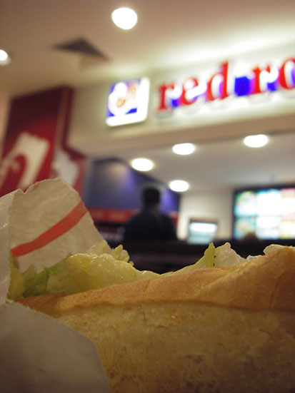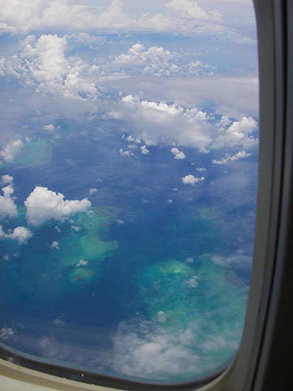 Bei Red Rooster ein Sandwich. Am Gate setzte ich mich auf den Boden, das Kapuzenshirt an schlief ich schnell ein. Eine Stimme wie im Traum: „Excuse me, Excuse me“. Eine Oma sah mich da herumliegen und weckte mich. Im Flugzeug der Thai hatte ich 2 Sitze für mich allein. Der ganze Flug war zu vielleicht 1/3 ausgebucht. Fast jeder hatte da eine eigene Reihe. Besonders effizient war die Getränkeverteilung. Alle Drinks schon in Bechern, brauchte man Saft oder Cola nur vom Tablett zu nehmen.
