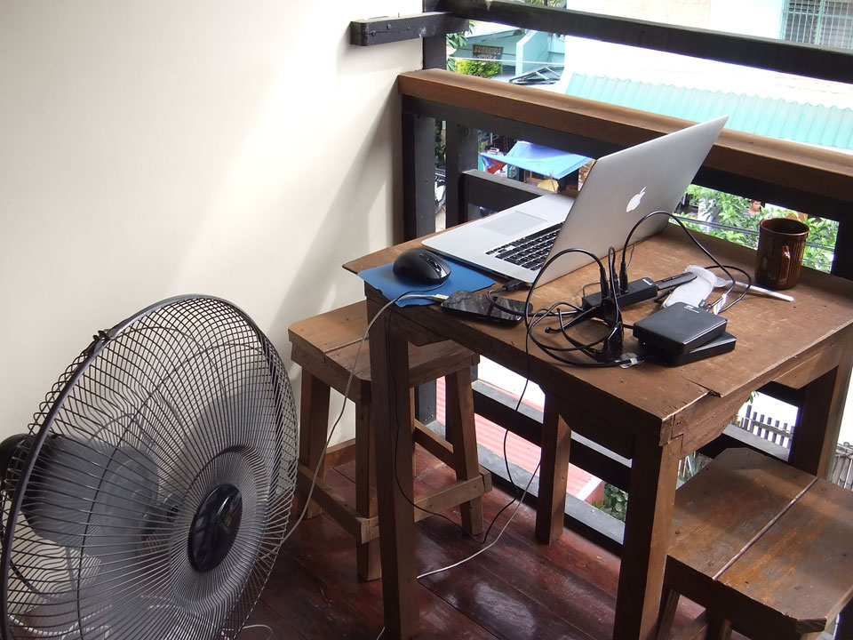 Burger zum Frühstück, dann Kaffee und Kuchen am Computer. Heute war’s extrem schwül. Es gewitterte und die Hitze danach war irre. Ich saß draußen am Mac, sortierte endlich mal ein paar Photos.