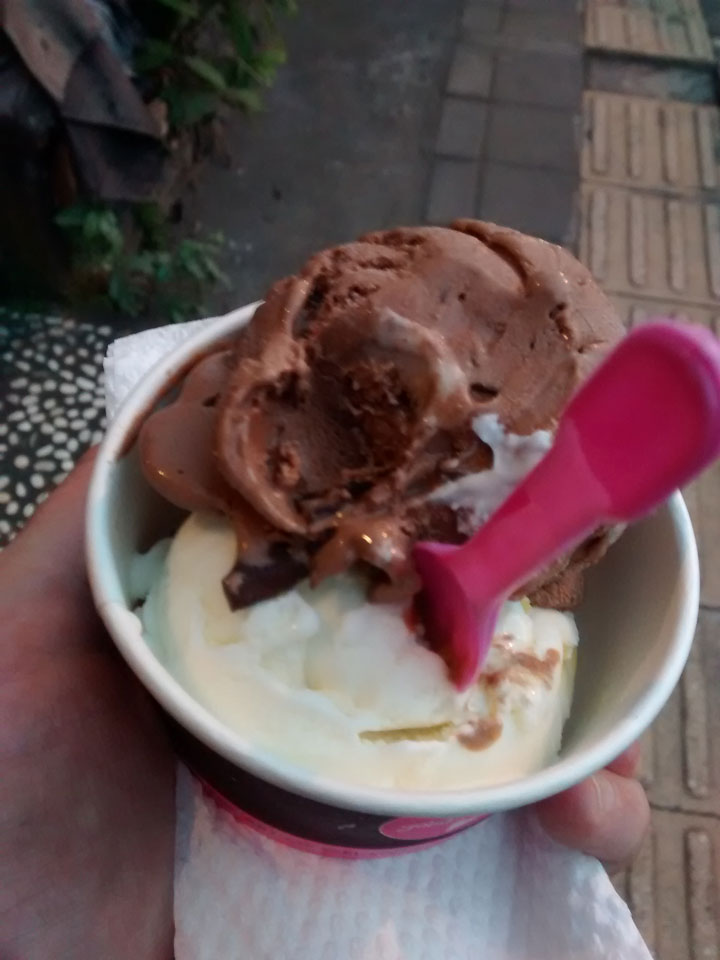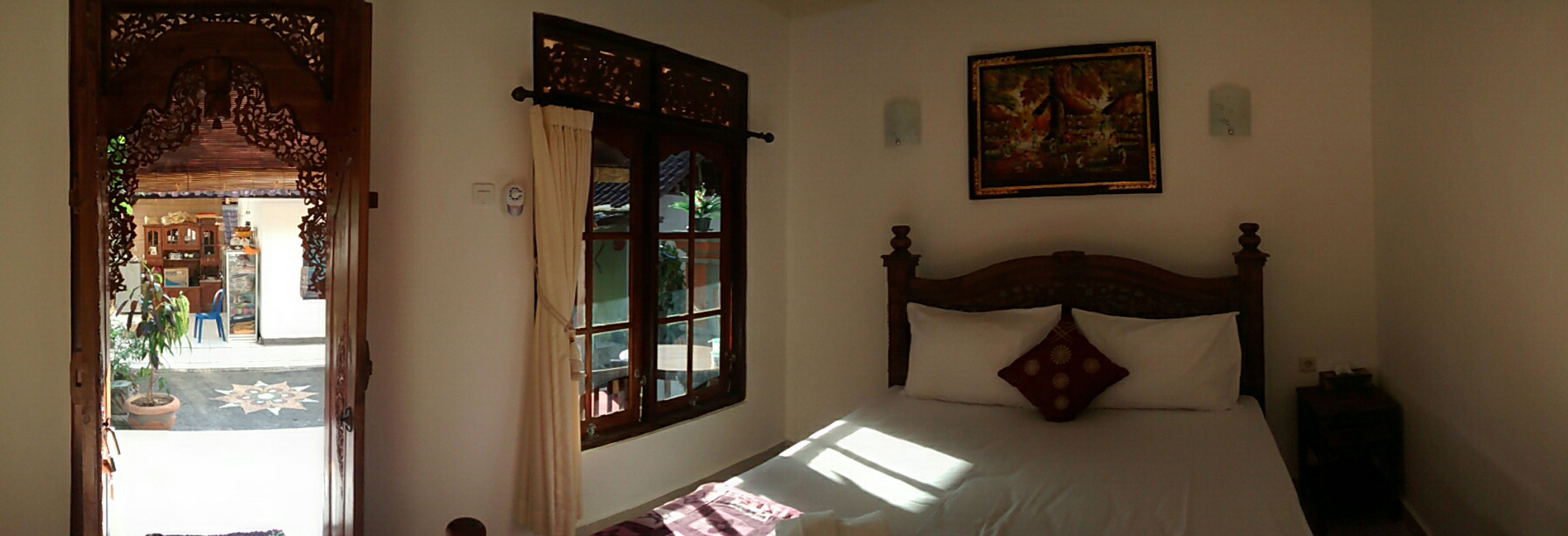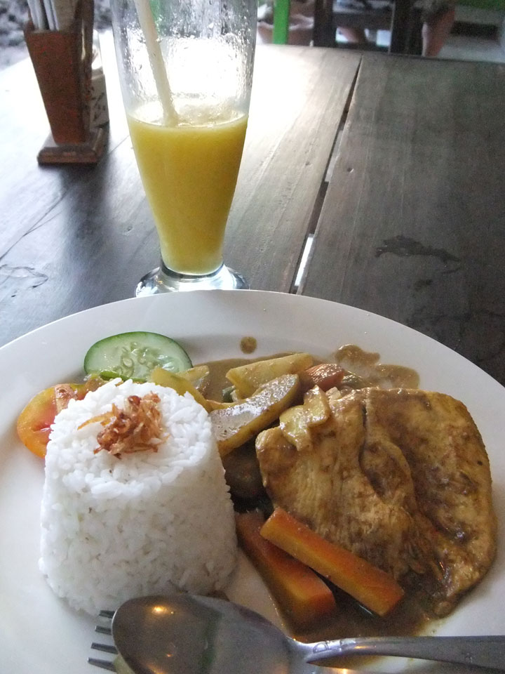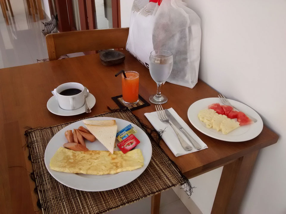 Mein Hotel fand ich auch – gute Lage, wenn auch am Ende der Straße. Das Karma House liegt an einem Bach und ich bekam Kaffee, ein paar Kokosfladen und Obst. Sehr nett, auch das Zimmr – ich war voll zufrieden.