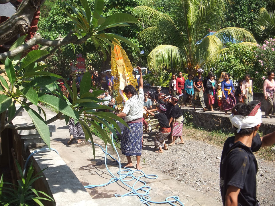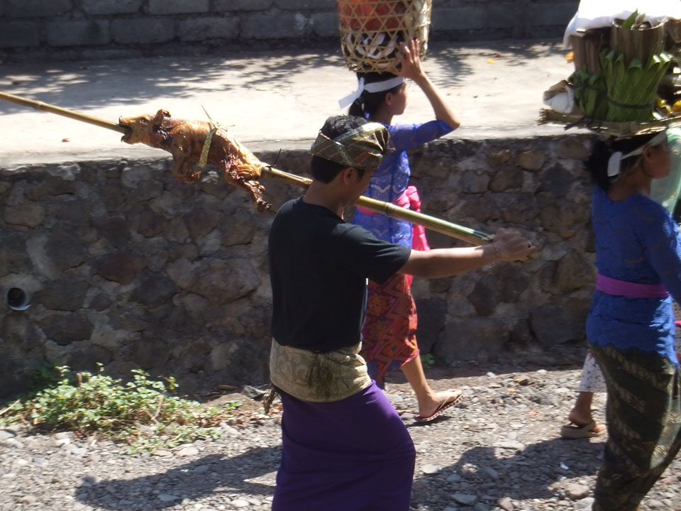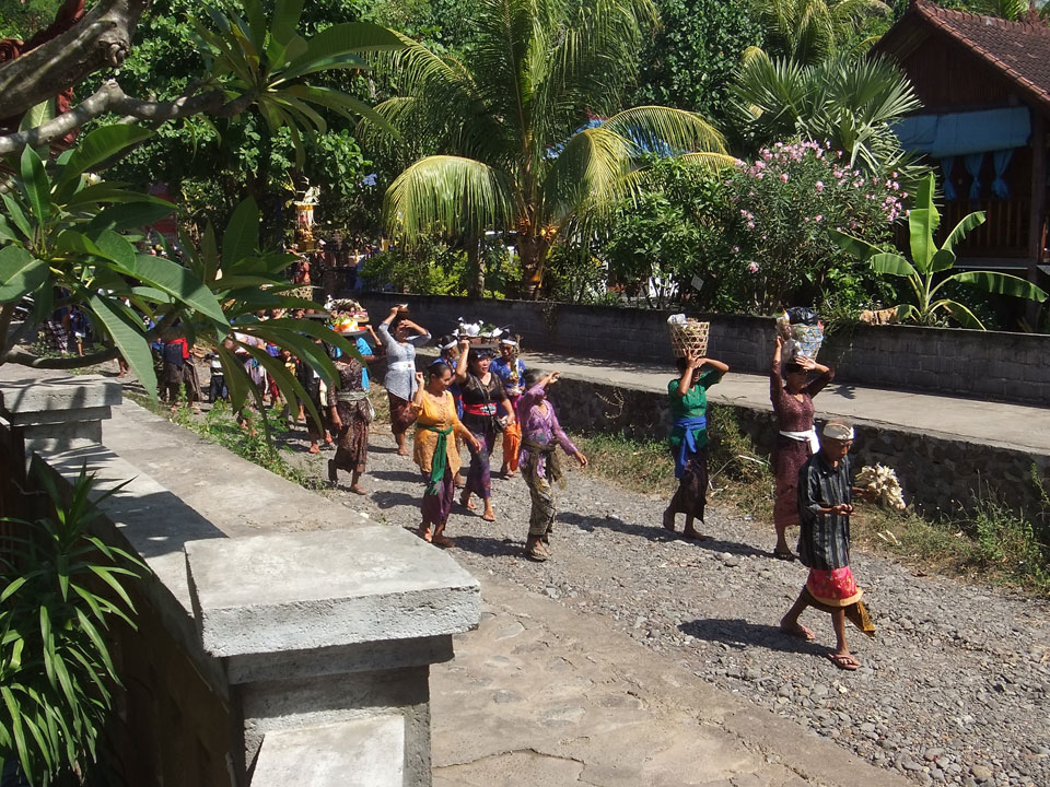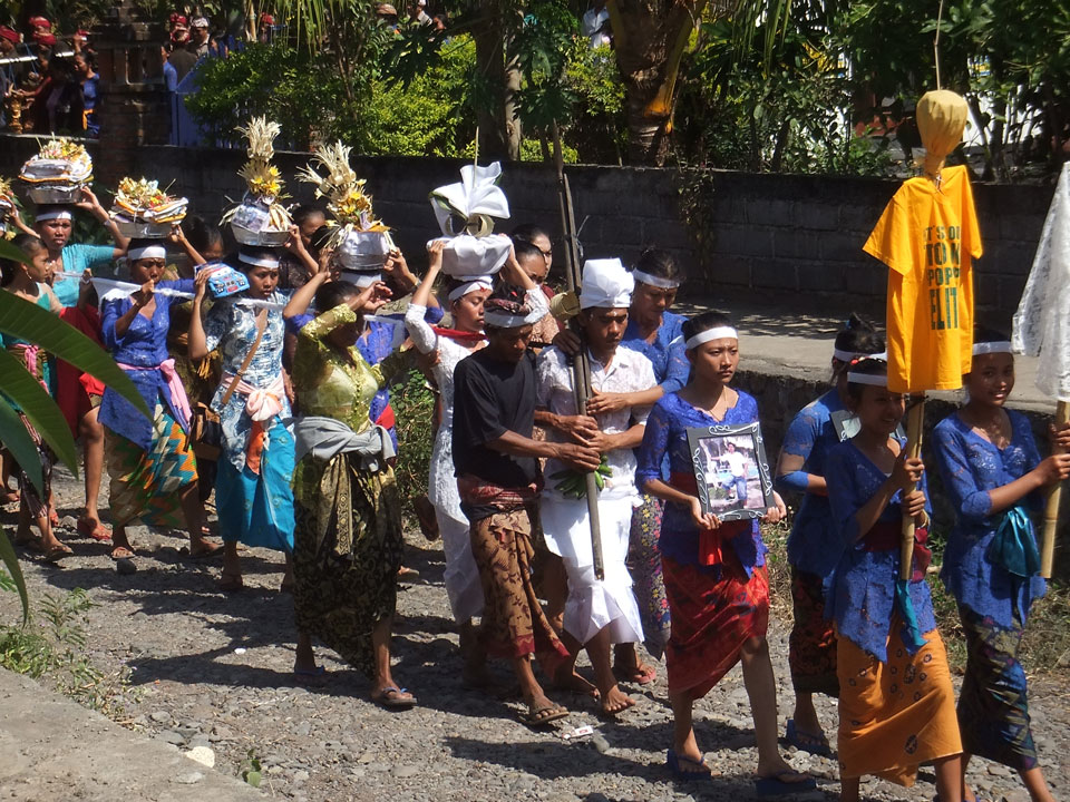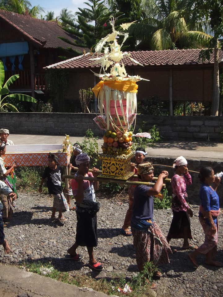 Wieder lange und gut geschlafen, wieder ein ganz spätes Frühstück. Es erklang balinesische Musik, als ich mir gerade meine Toast schmecken ließ. Es schien, als wäre das ganze Dorf auf den Beinen und zog direkt am Hotel vorbei.