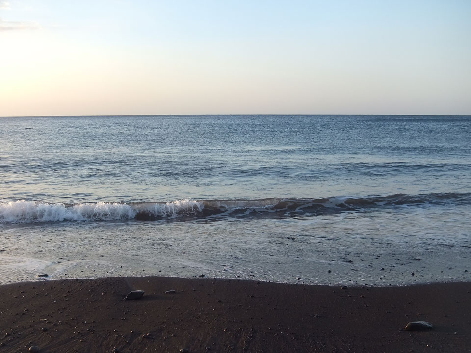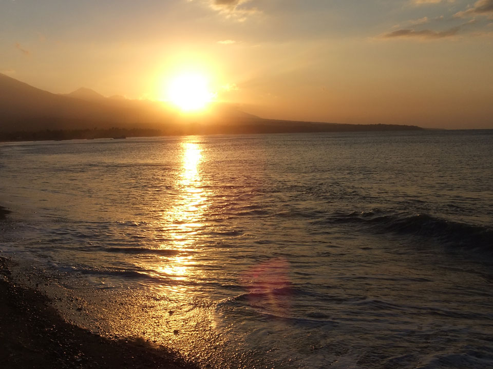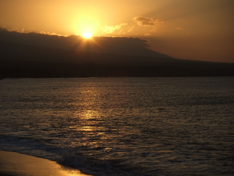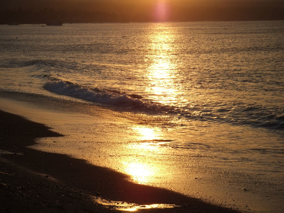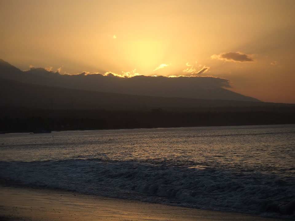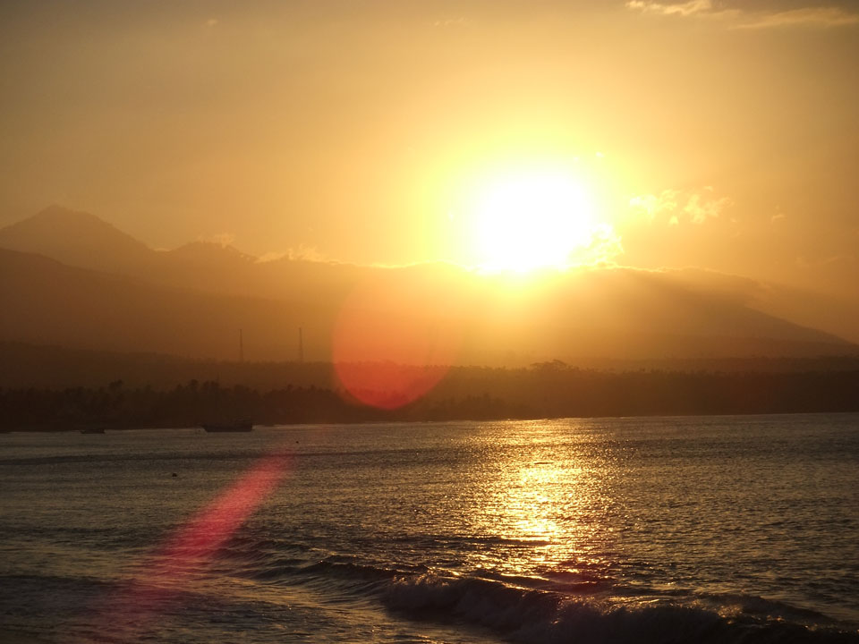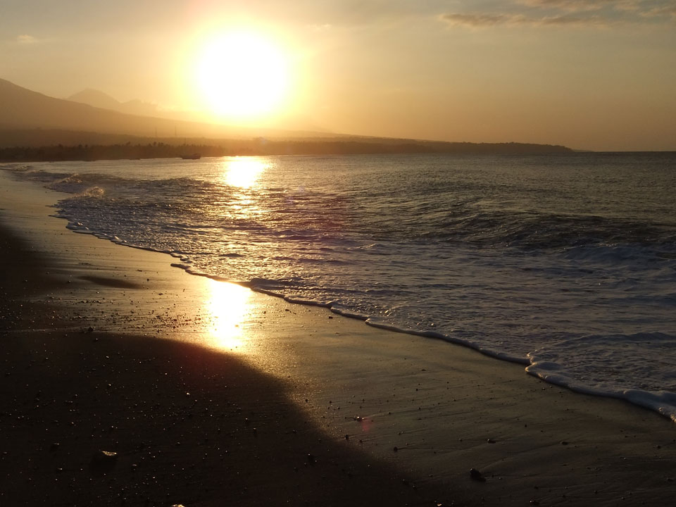 Einer checkte hier auch ein, ich sah ihn ein paar Mal. Ich ging an den Strand und wollte dann doch erst nicht baden gehen. Die Wellen und Strömung waren heute etwas heftiger. Ein kurzer Badegang, schnell wieder raus, weil man ohne Halt auf dem lockeren Boden doch ganz schön herumgeschoben wird. Der Sonnenuntergang war aber wieder erste Sahne. Ist schon ein schönes Fleckchen Erde hier, wenn auch ohne Touristen.