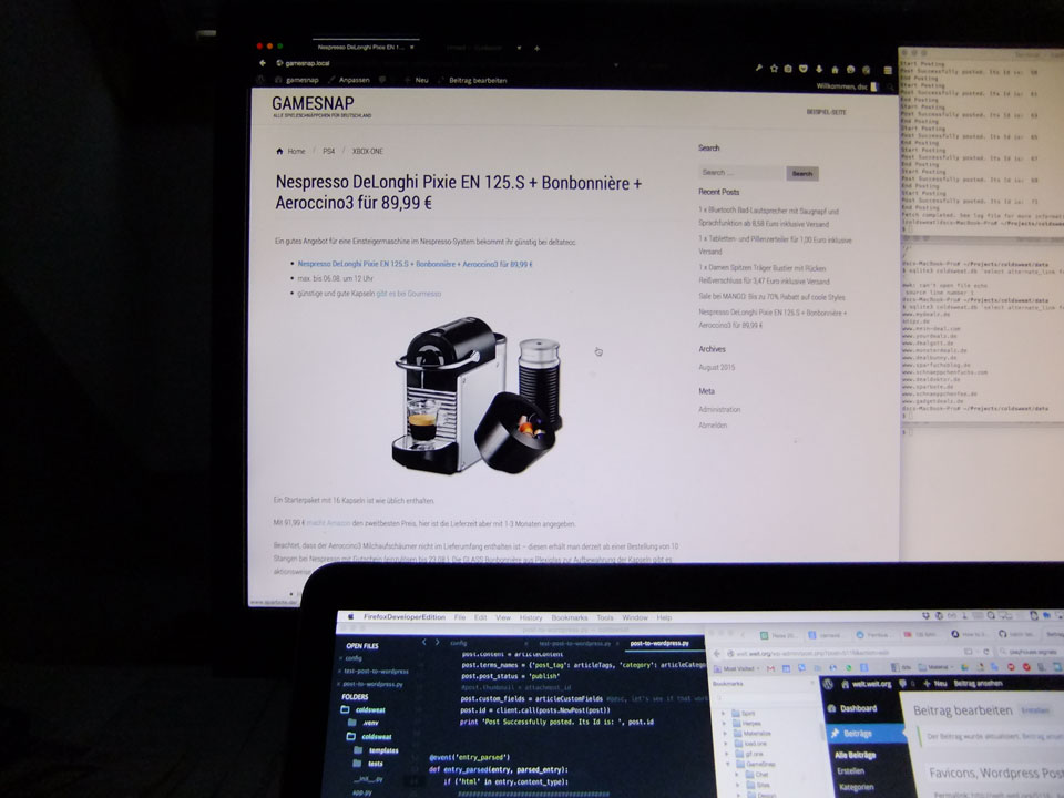 Damit aber nicht genug. Ich wollte ein Testprogramm schreiben, womit ich einfach über ein CLI einen Post anschieben kann. Ich importierte die ganzen Modelle und peewee Zeug und am Ende klappte es doch nicht. Ich gab auf und versuchte es nochmal mit dem Plugin ohne DOMAINs-check der noch vom Copy&Paste drin war – und siehe da: das Ding klappte! Die Coldsweat Posts wurden jetzt direkt über XMLRPC in WordPress gepostet! Ein gigantischer Fortschritt!