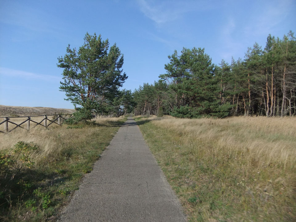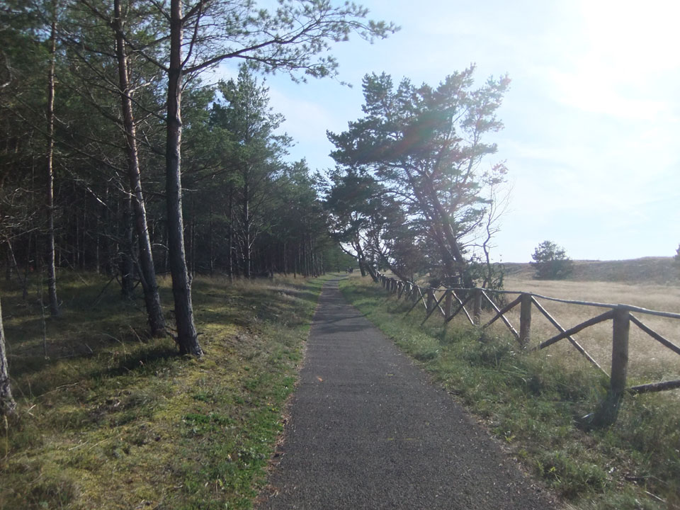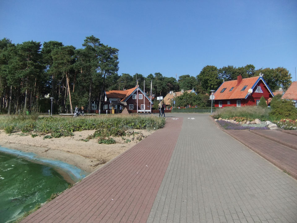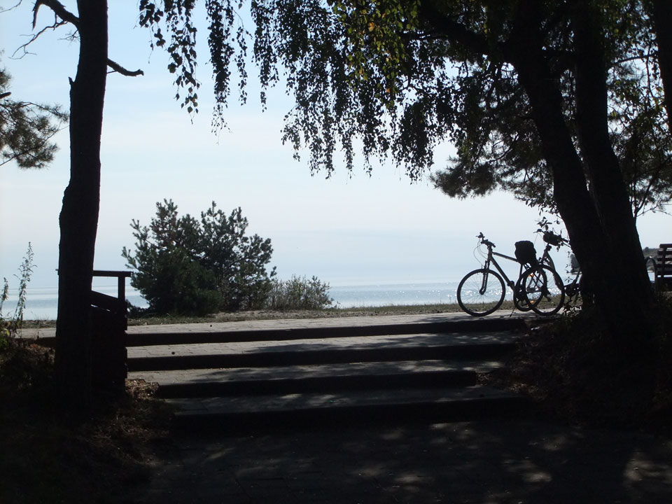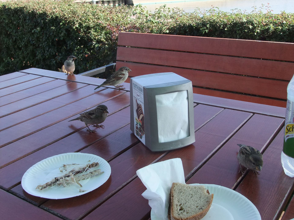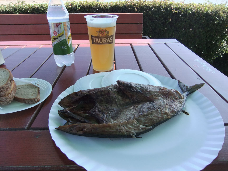 Super Wetter heute und da es nun schon Mittag war, holte ich mir was zu essen. Eine geräucherte Makrele (€5) war super. Die Spatzen hier sind zahm und picken einem fast das Brot vom Teller. Gut gestärkt ging’s schließlich an die Rückfahrt. Ganze 50km lagen vor mir. Der Radeweg Nr. 10 führt den ganzen Weg von Nida nach Smiltynė, wo die Fähre rüber nach Klaipeda fährt.