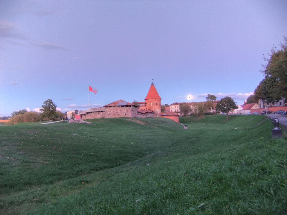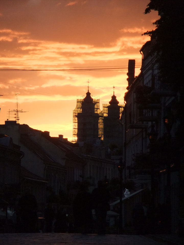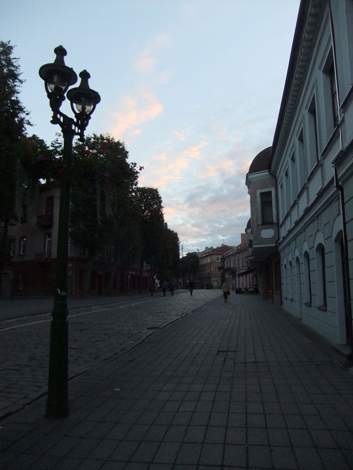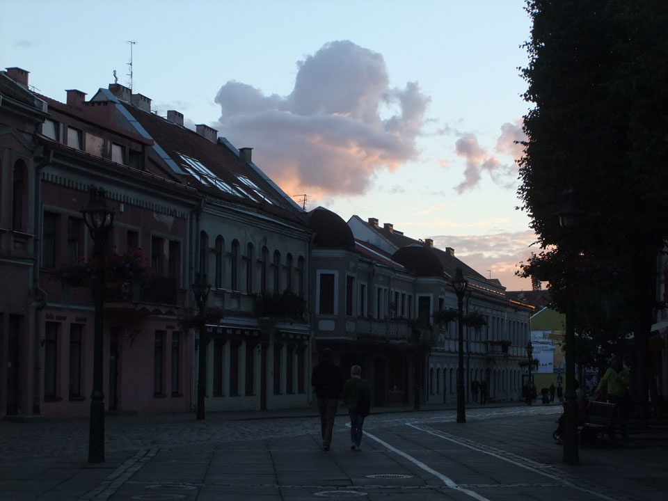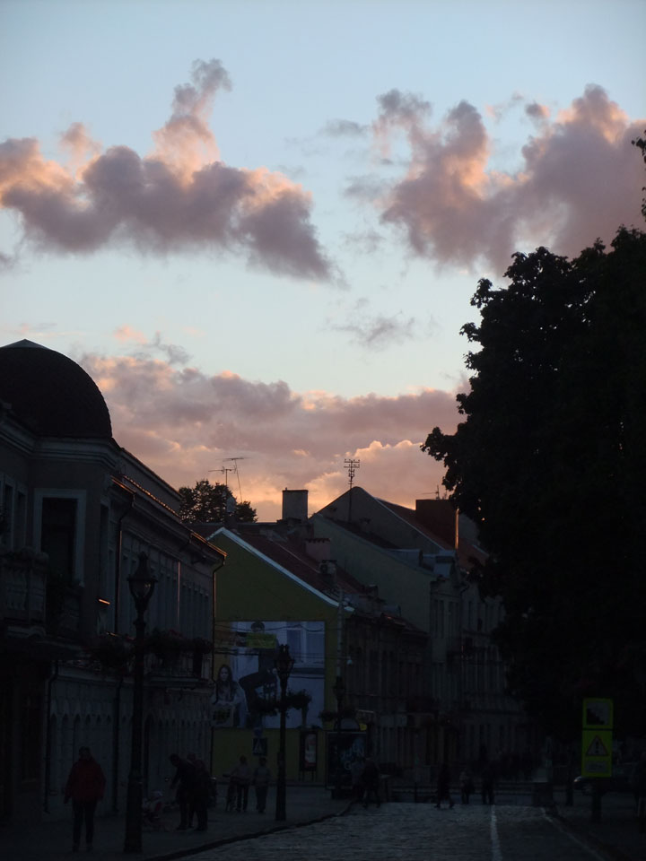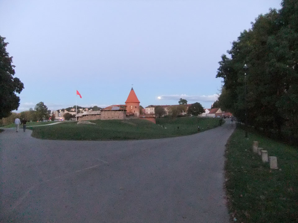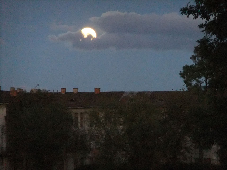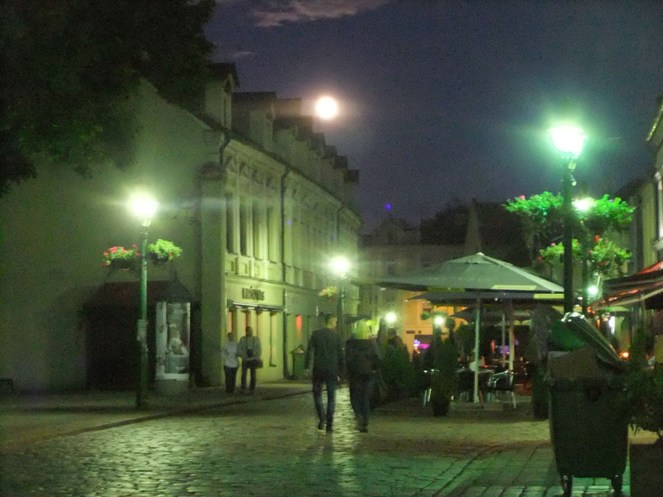 So saß ich bis in den Morgen da und wollte die Mondfinsternis anschauen. Im Web Livestream sah die ganz nett aus. Hier in Kaunas auf der Straße sah ich erst mal nur Wolken. Durch die vielen Häuser war das Blickfeld eingeschränkt und ich suchte nach einem besseren Platz. Ich stieg auf ’nen Hügel aber auch da war nichts zu sehen – Bäume usw. Ich gab’s dann fast auf, lief wieder runter in die Altstadt.