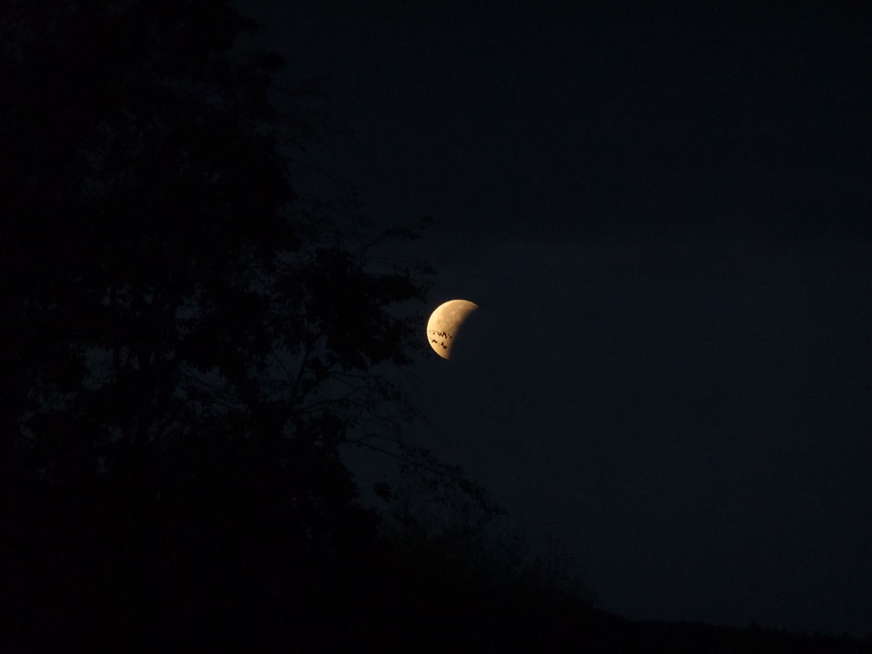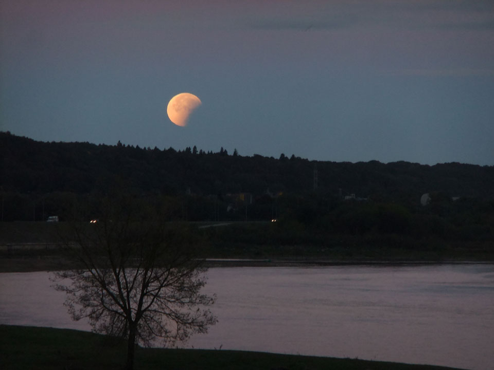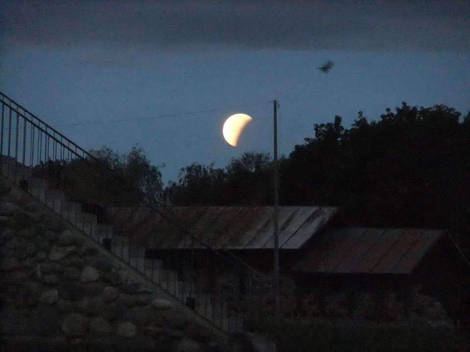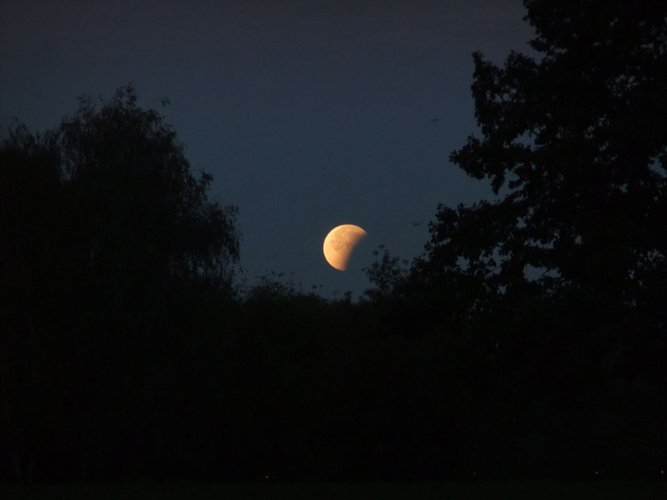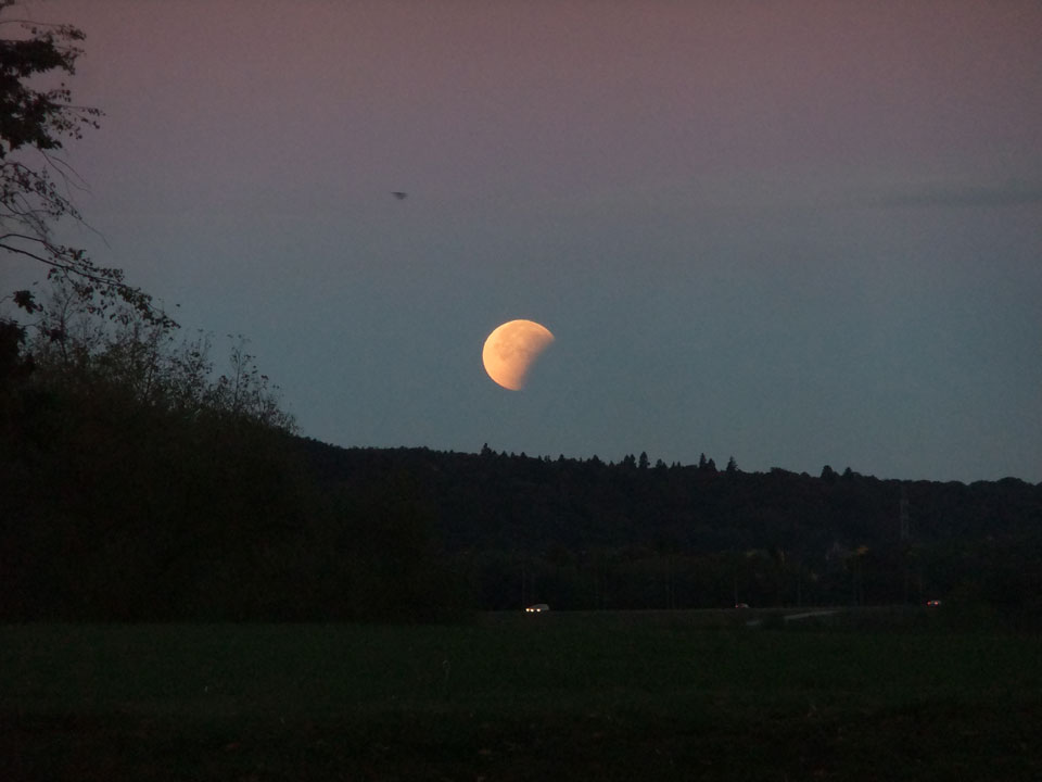 Die Hauptaction war ab 5:47 vorbei und so ging ich dennoch weiter, die gleiche Runde wie abends auf der Suche nach freier Sicht. Dann nach 7 erst sah ich dann doch den Mond am Horizont als er unter der Wolkendecke sichtbar wurde. Fantastisch! Vielleicht die Hälfte war noch durch den Erdschatten verdunkelt aber das ist schon was Besonderes, wenn man den eigenen Planetenschatten sieht. Da hätte ich auch gern meine HS50 mit 42-fach Zoom gehabt.