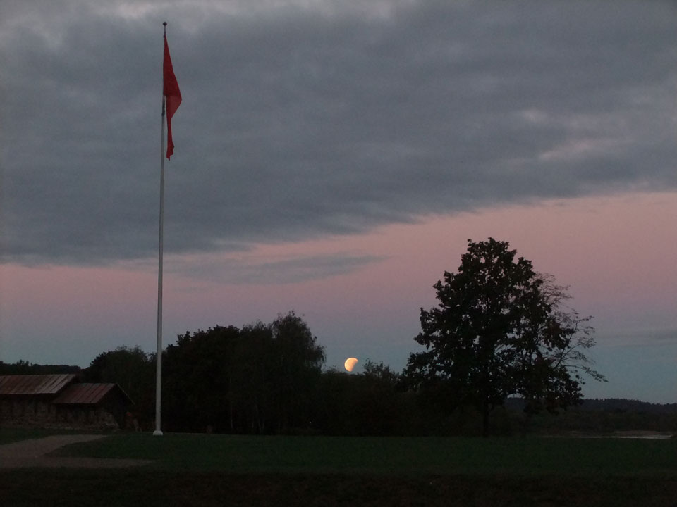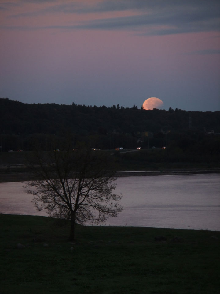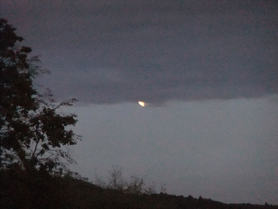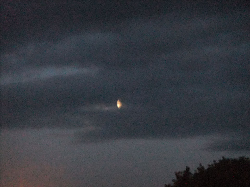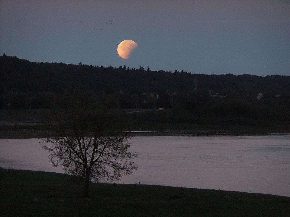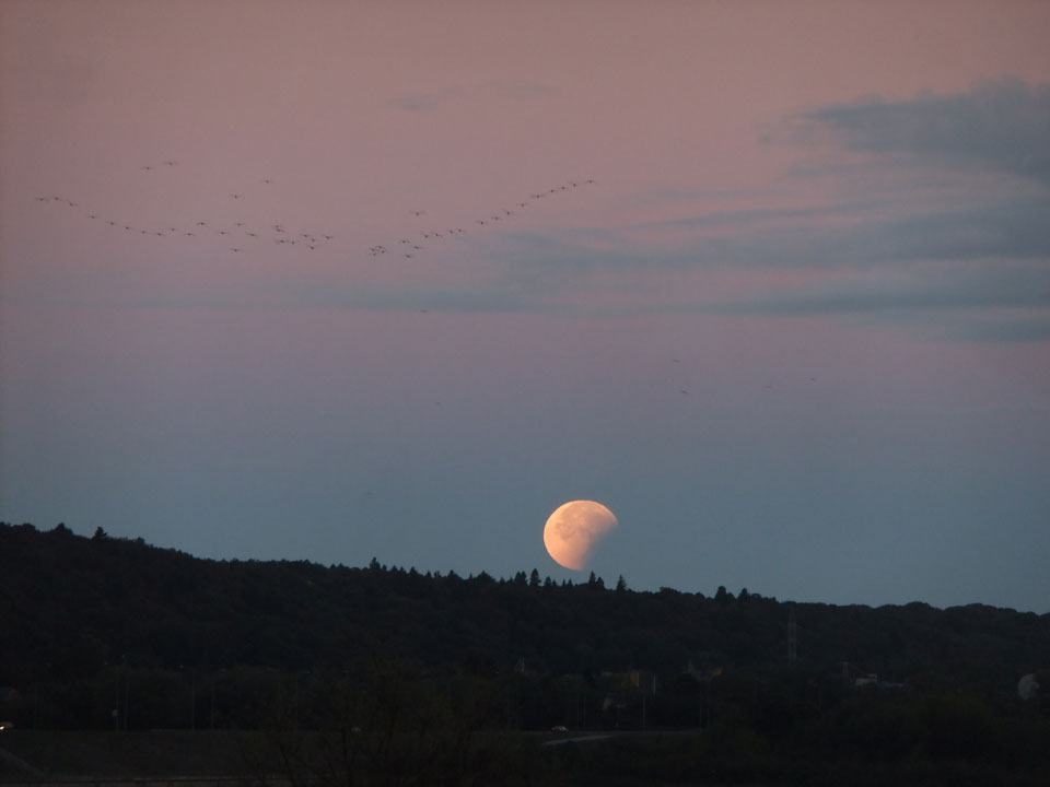 Die Hauptaction war ab 5:47 vorbei und so ging ich dennoch weiter, die gleiche Runde wie abends auf der Suche nach freier Sicht. Dann nach 7 erst sah ich dann doch den Mond am Horizont als er unter der Wolkendecke sichtbar wurde. Fantastisch! Vielleicht die Hälfte war noch durch den Erdschatten verdunkelt aber das ist schon was Besonderes, wenn man den eigenen Planetenschatten sieht. Da hätte ich auch gern meine HS50 mit 42-fach Zoom gehabt.