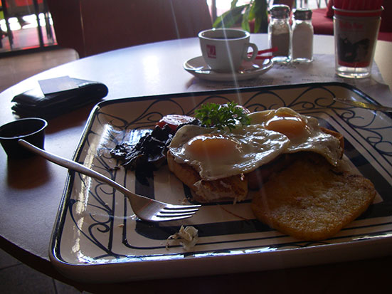 Vegetarisches Frühstück im Gilligans. Das war nicht ganz komplett aber auch genug. Ich hatte schon ausgecheckt und musste mich jetzt ums Cash kümmern.