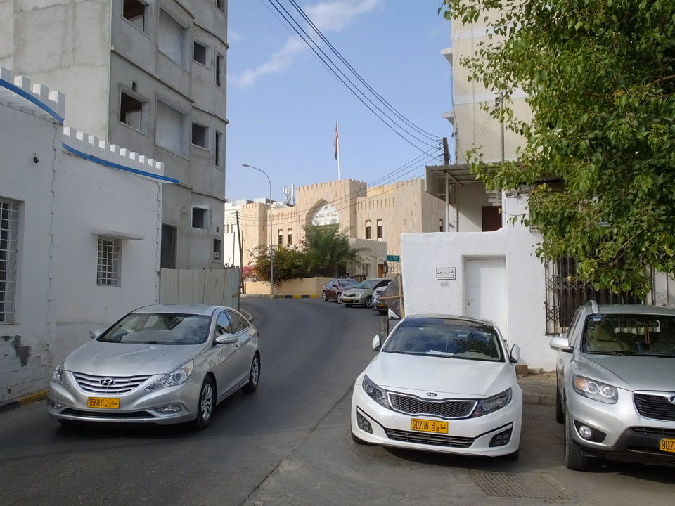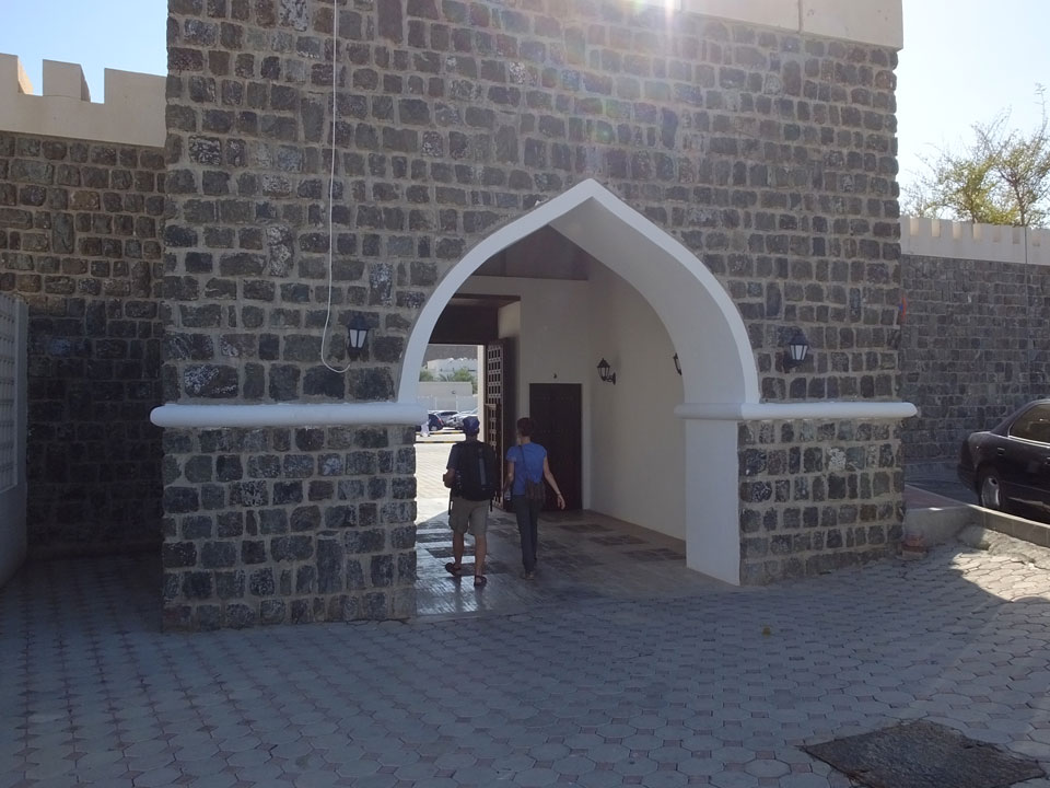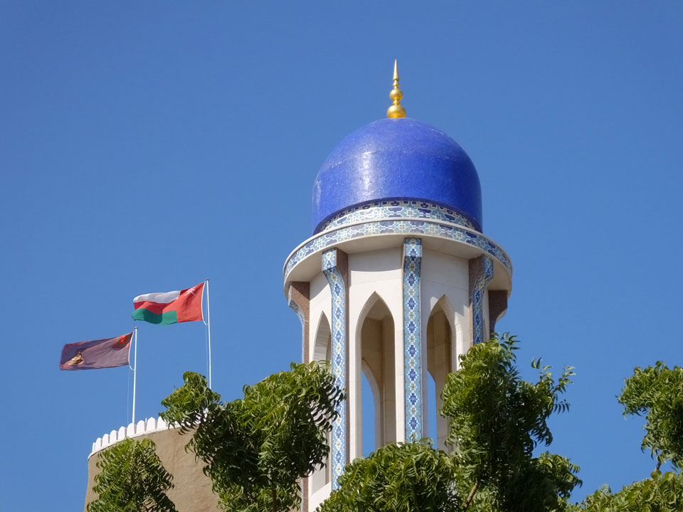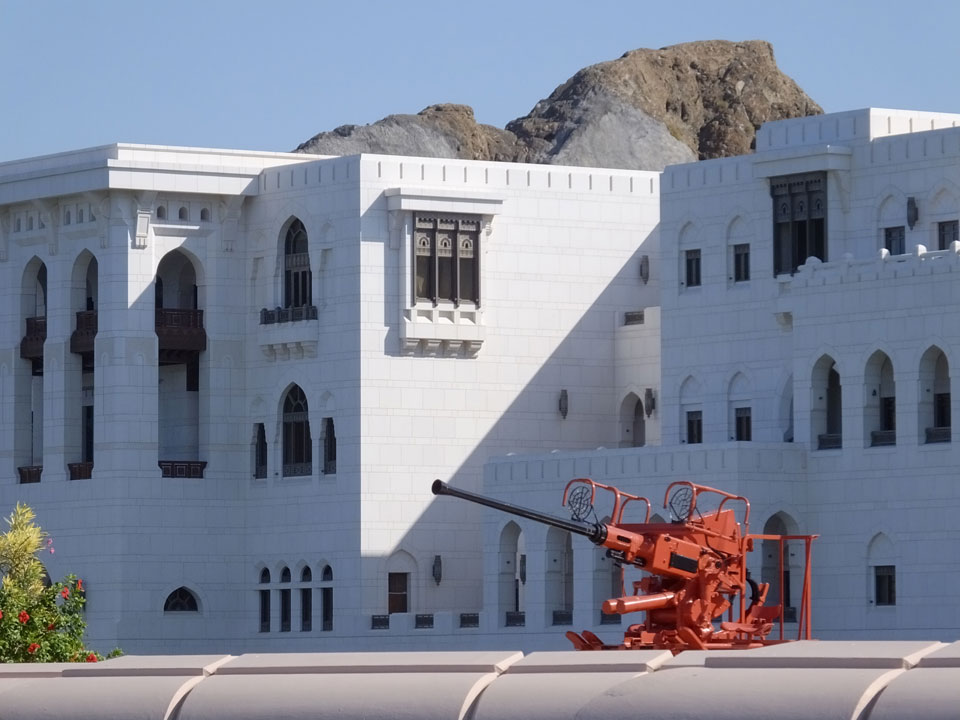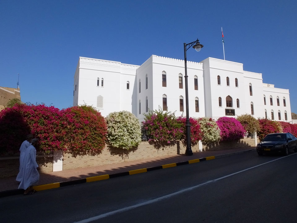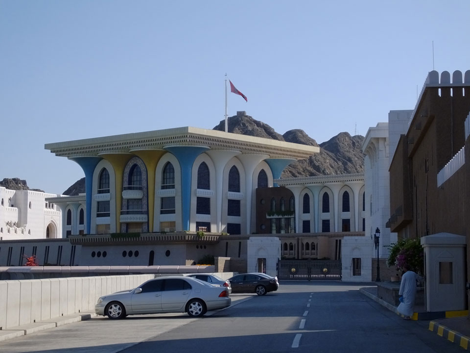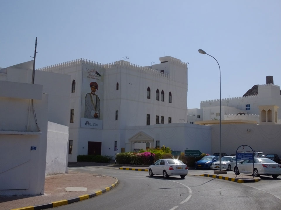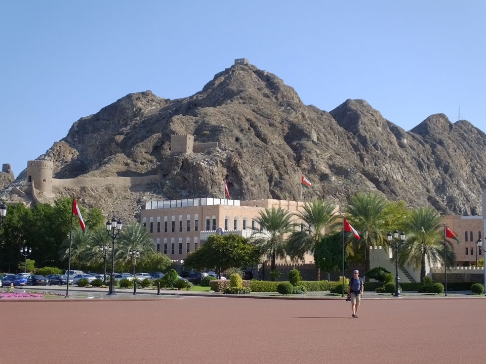 Auf einen kleinen Turm, dann entlang der menschenleeren Straße kam ein Engländer entgegen. „What a weird place“ sagte er – in der Tat. Jetzt zur Hauptsaison ist es doch arg leer. Wir kamen bis in’s Alte Muscat, wo der Sultanspalast und viele andere Gebäude stehen. In einem Museum gab’s etwas zur Geschichte des Sultanats, den verschiedenen Kleider der Stämme und eine große Briefmarkensammlung. In einer Art Bibliothek waren Bücher und Zeitschriften. Ein National Geographic Photobuch hatte viele nette Photos, die mich an ein paar Reisen erinnerten und auch zeigten, dass es noch viel mehr zu sehen gibt. Die Klimaanlage war hier besonders gut.