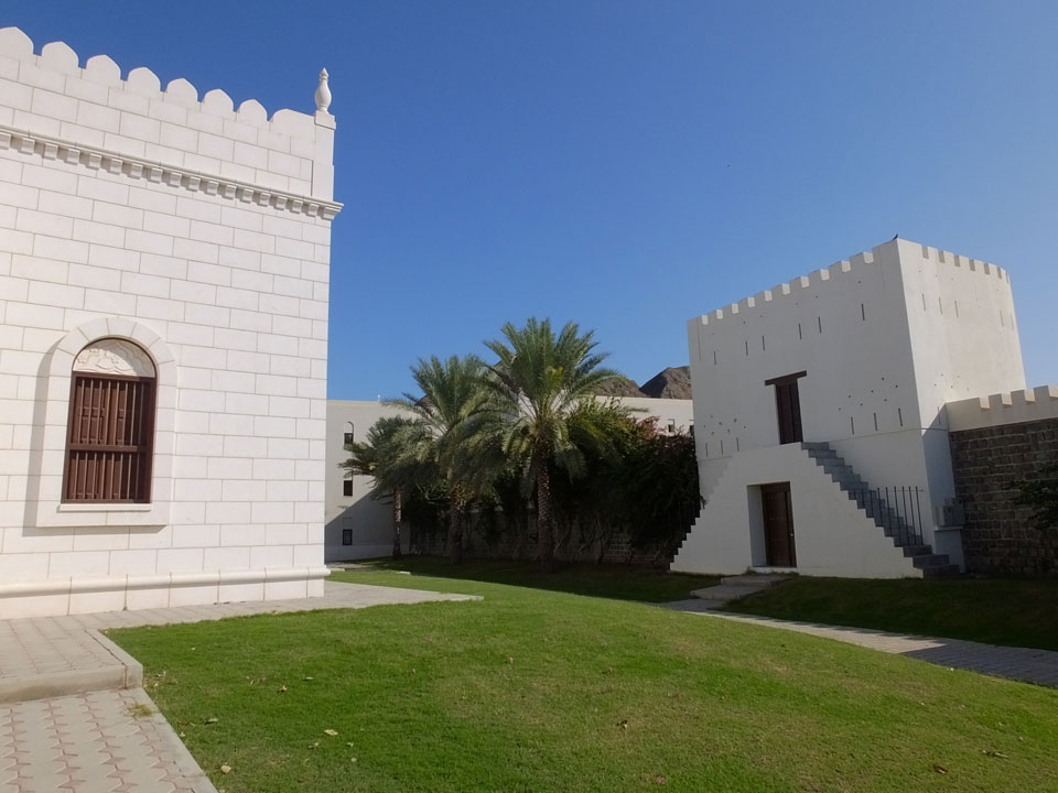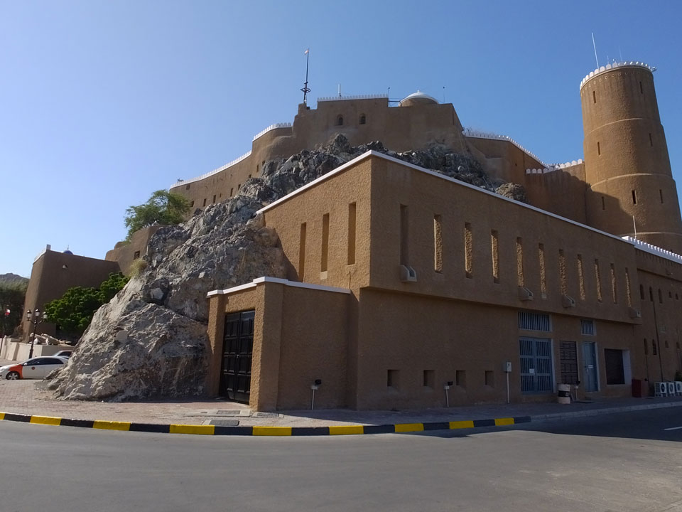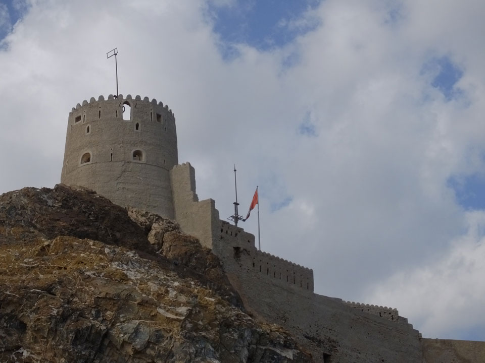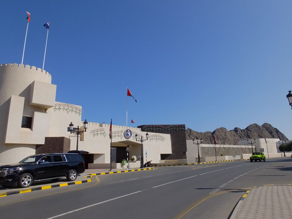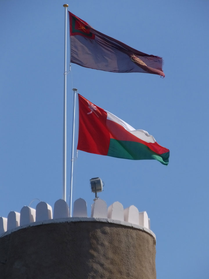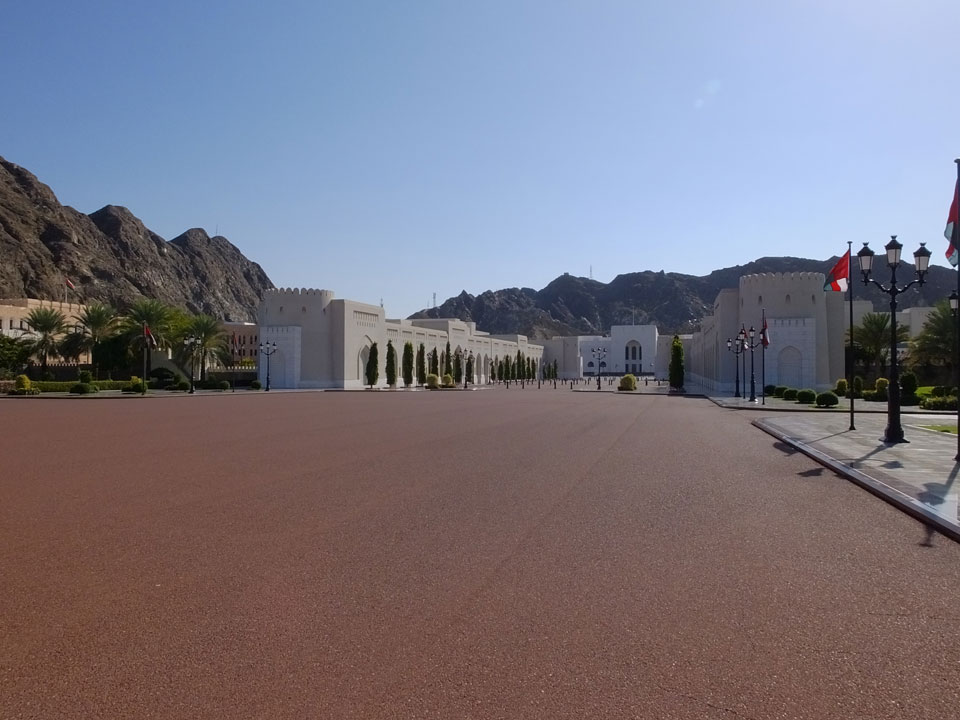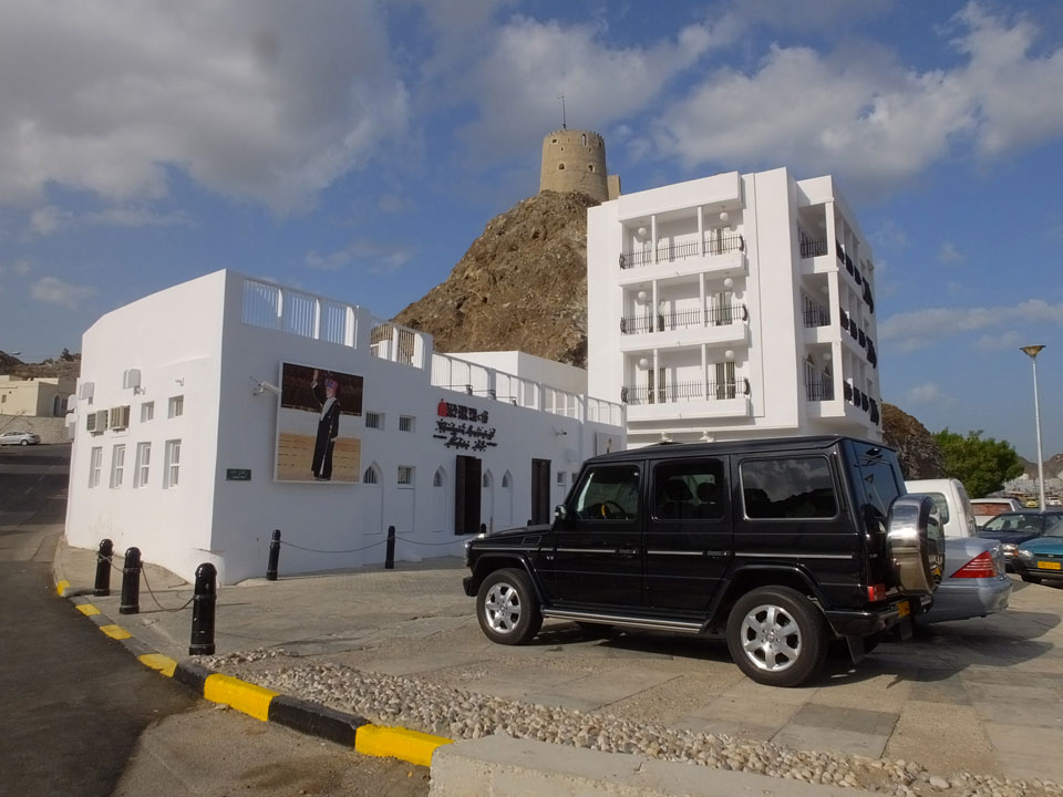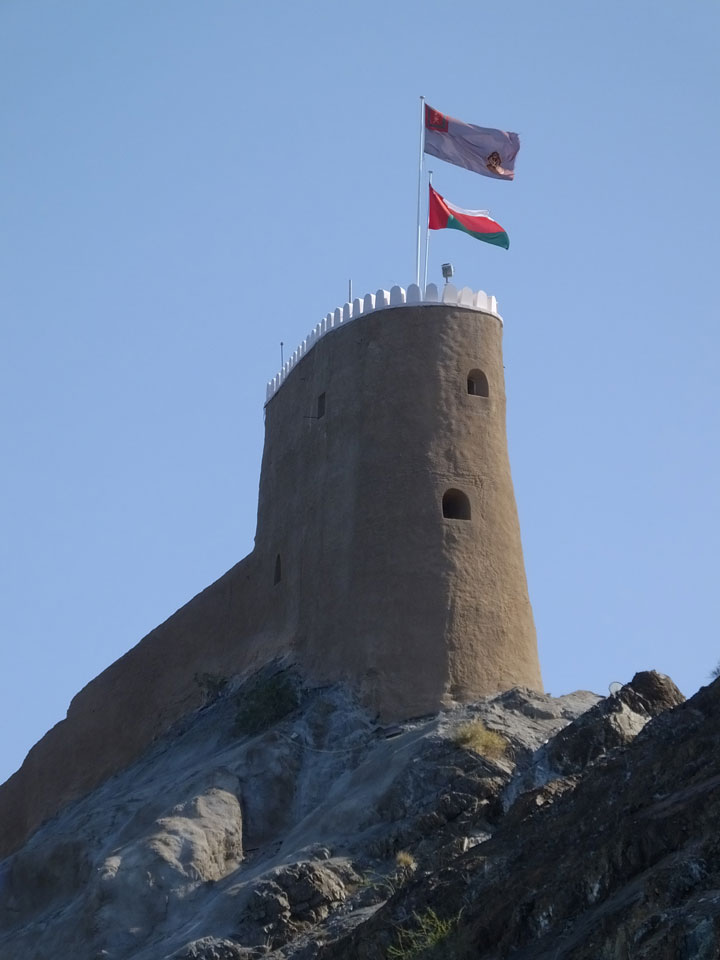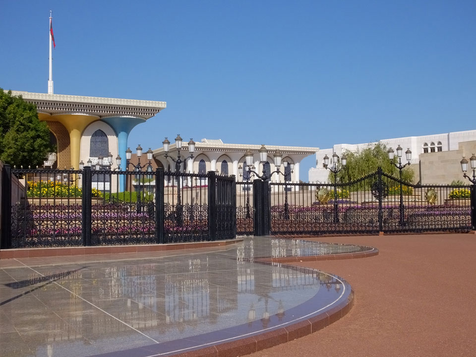 Auf einen kleinen Turm, dann entlang der menschenleeren Straße kam ein Engländer entgegen. „What a weird place“ sagte er – in der Tat. Jetzt zur Hauptsaison ist es doch arg leer. Wir kamen bis in’s Alte Muscat, wo der Sultanspalast und viele andere Gebäude stehen. In einem Museum gab’s etwas zur Geschichte des Sultanats, den verschiedenen Kleider der Stämme und eine große Briefmarkensammlung. In einer Art Bibliothek waren Bücher und Zeitschriften. Ein National Geographic Photobuch hatte viele nette Photos, die mich an ein paar Reisen erinnerten und auch zeigten, dass es noch viel mehr zu sehen gibt. Die Klimaanlage war hier besonders gut.