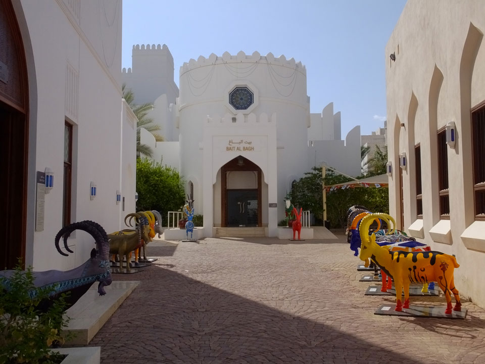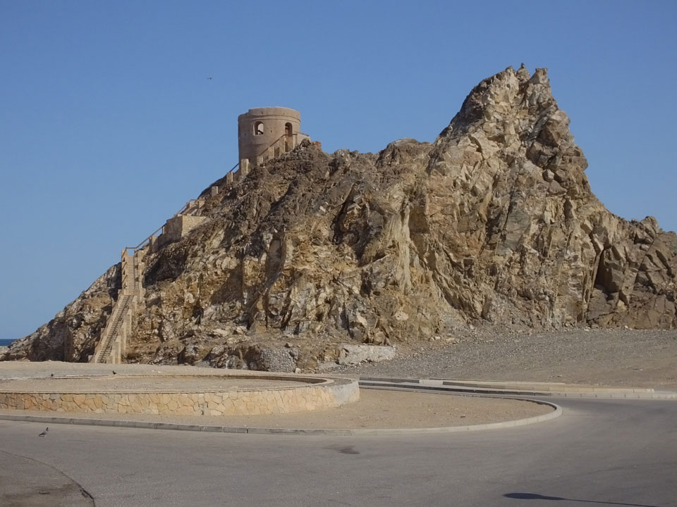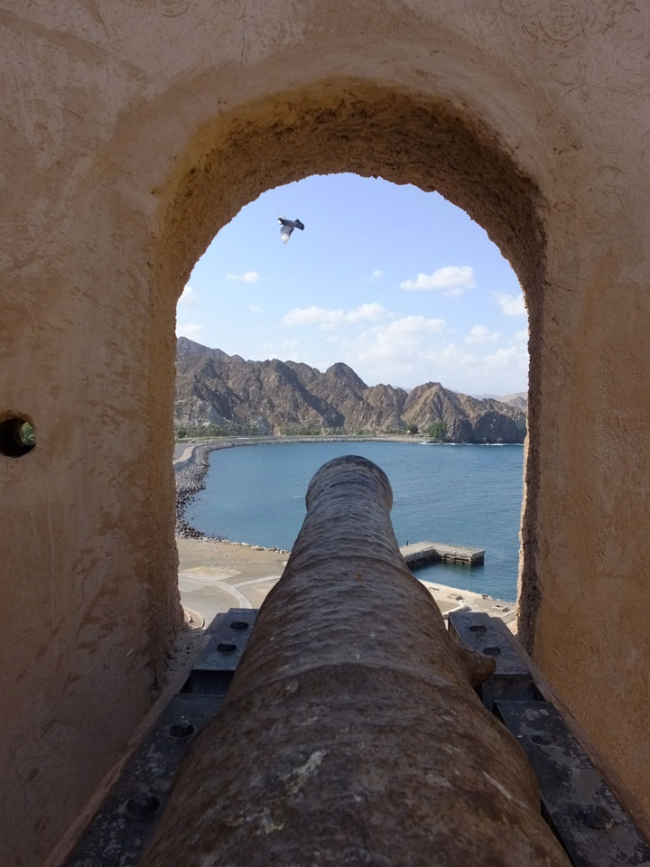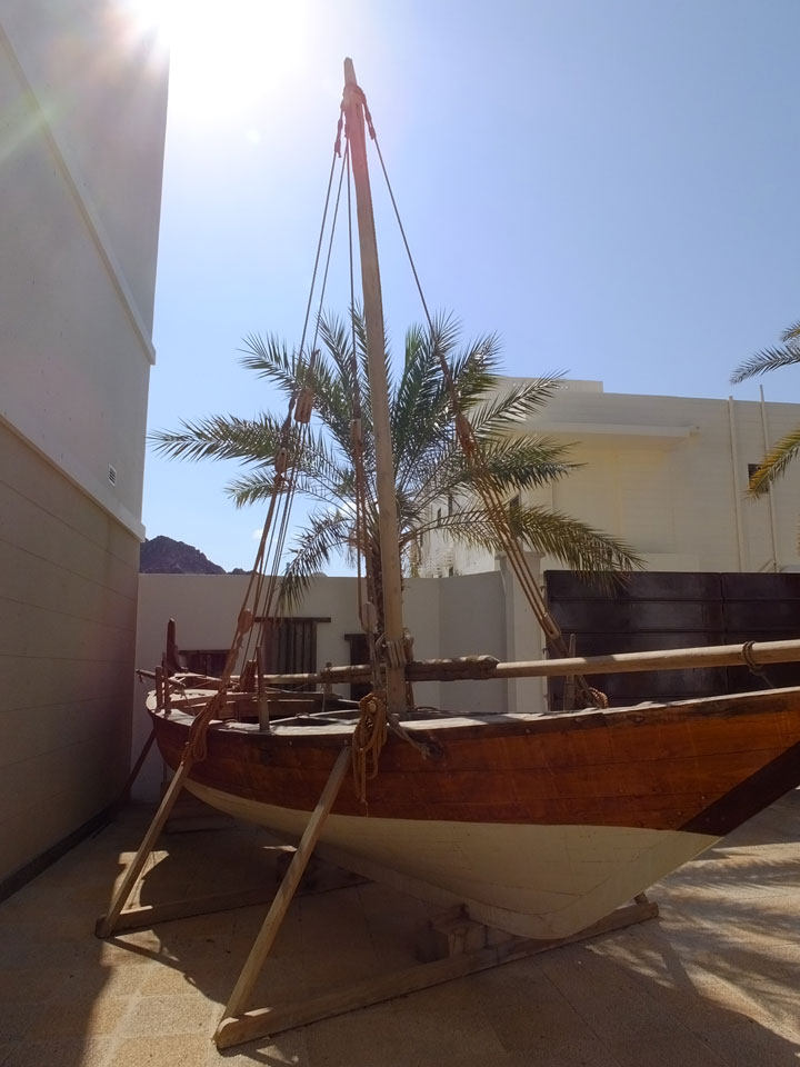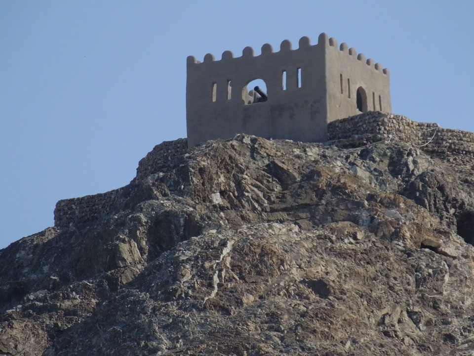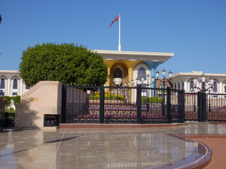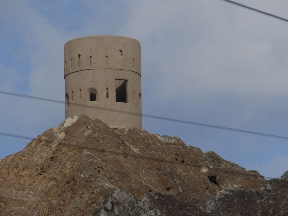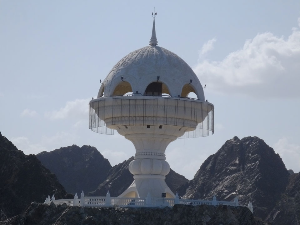 Auf einen kleinen Turm, dann entlang der menschenleeren Straße kam ein Engländer entgegen. „What a weird place“ sagte er – in der Tat. Jetzt zur Hauptsaison ist es doch arg leer. Wir kamen bis in’s Alte Muscat, wo der Sultanspalast und viele andere Gebäude stehen. In einem Museum gab’s etwas zur Geschichte des Sultanats, den verschiedenen Kleider der Stämme und eine große Briefmarkensammlung. In einer Art Bibliothek waren Bücher und Zeitschriften. Ein National Geographic Photobuch hatte viele nette Photos, die mich an ein paar Reisen erinnerten und auch zeigten, dass es noch viel mehr zu sehen gibt. Die Klimaanlage war hier besonders gut.