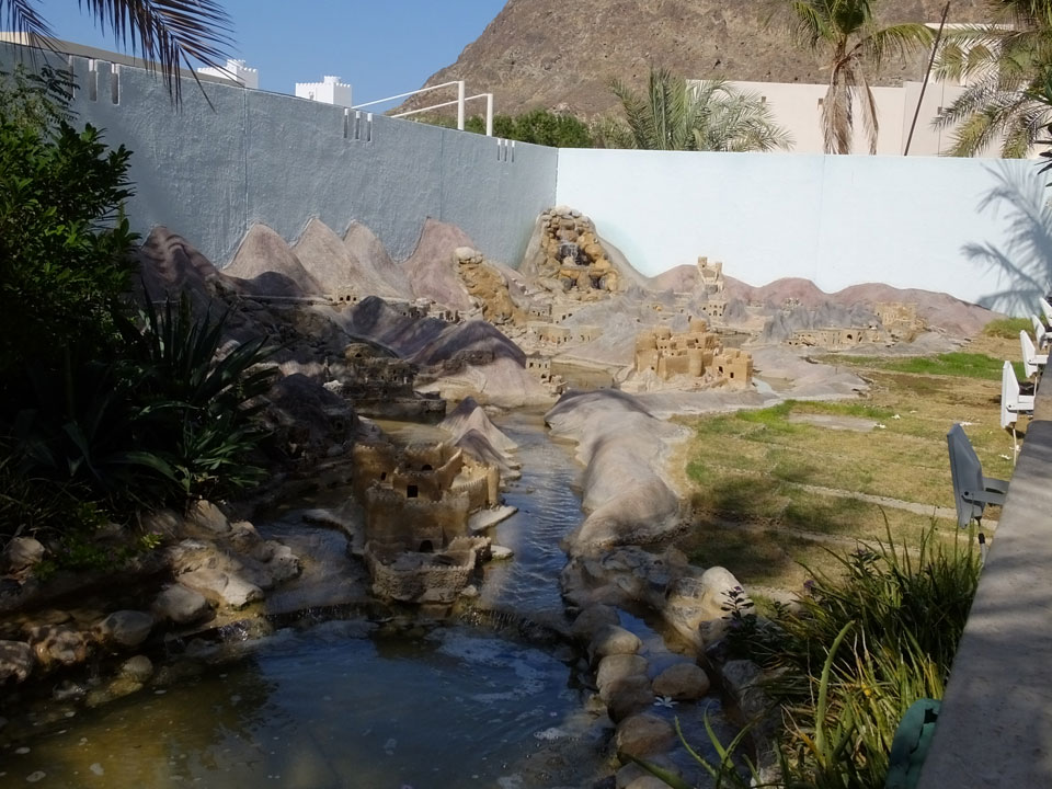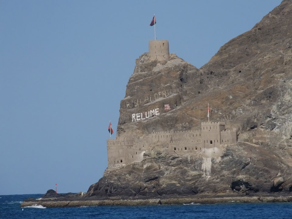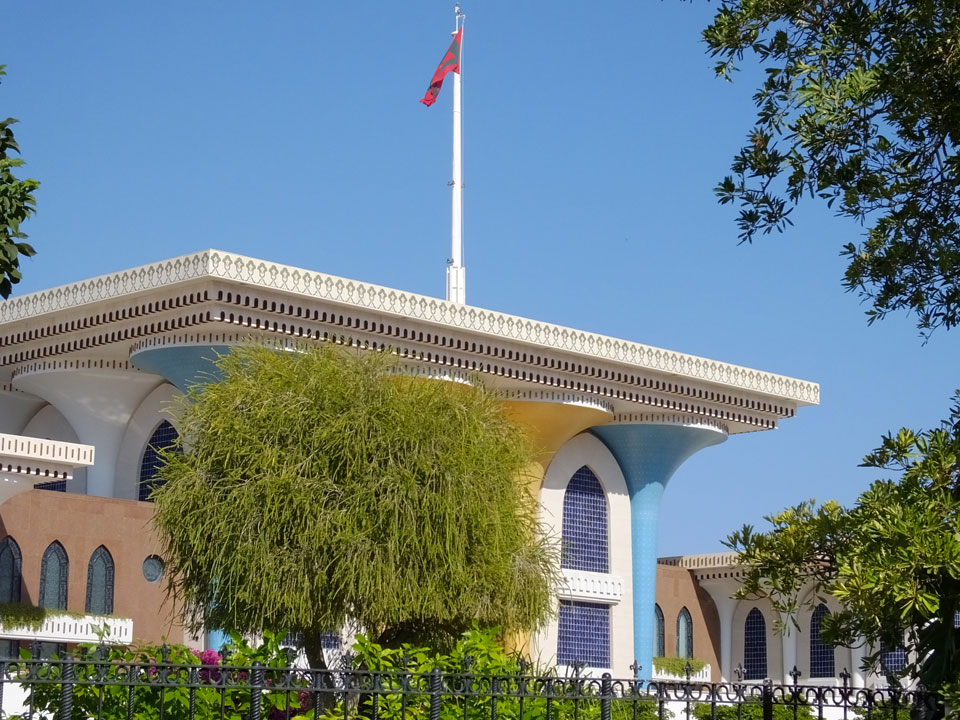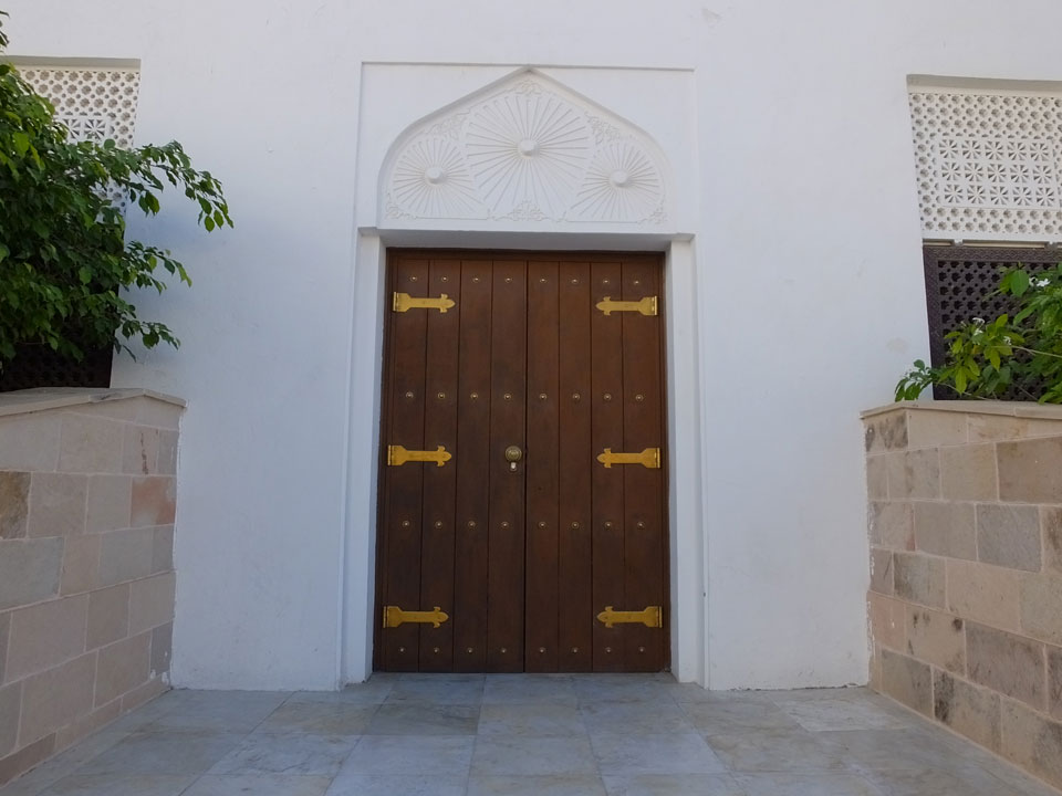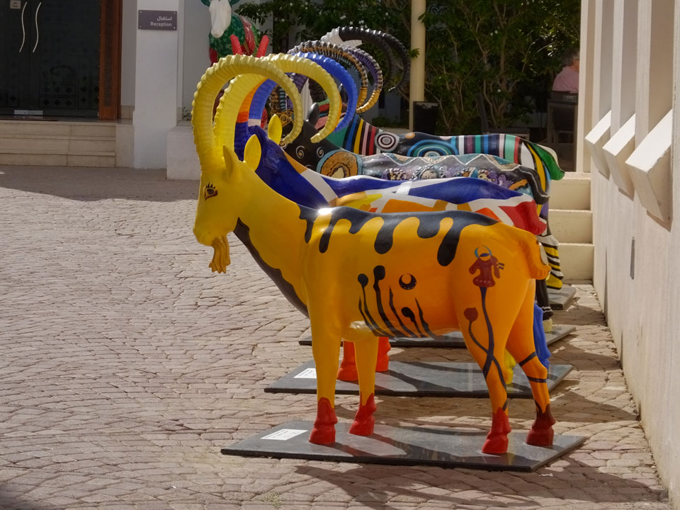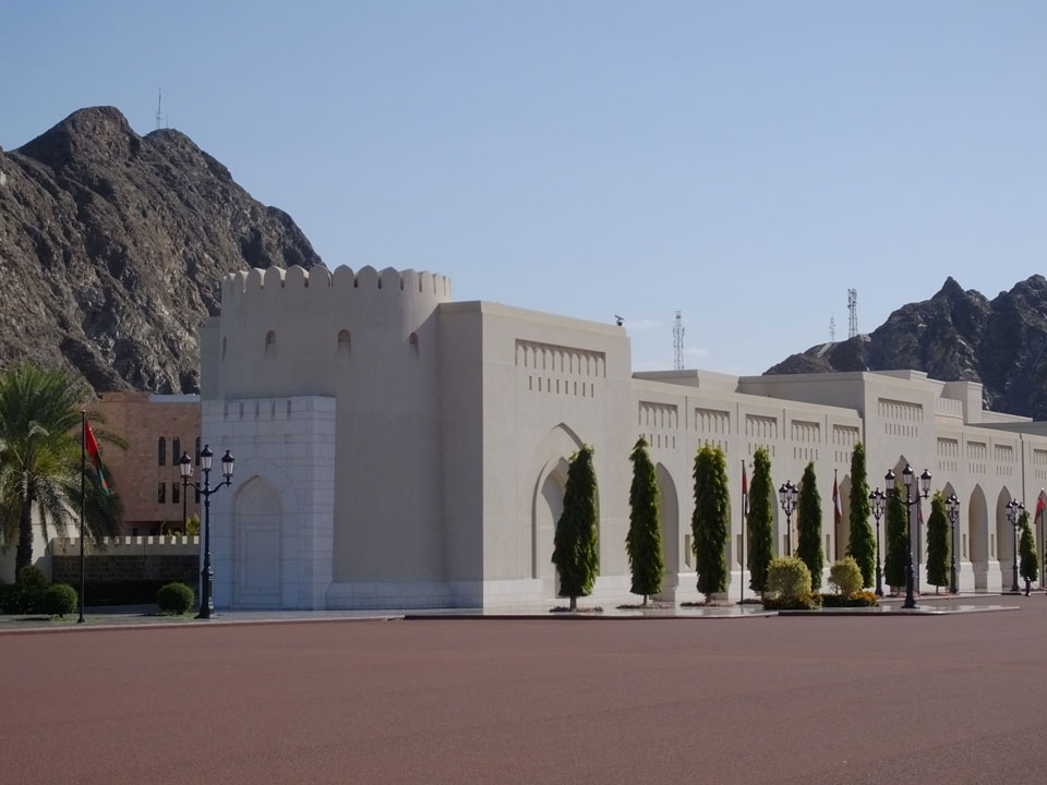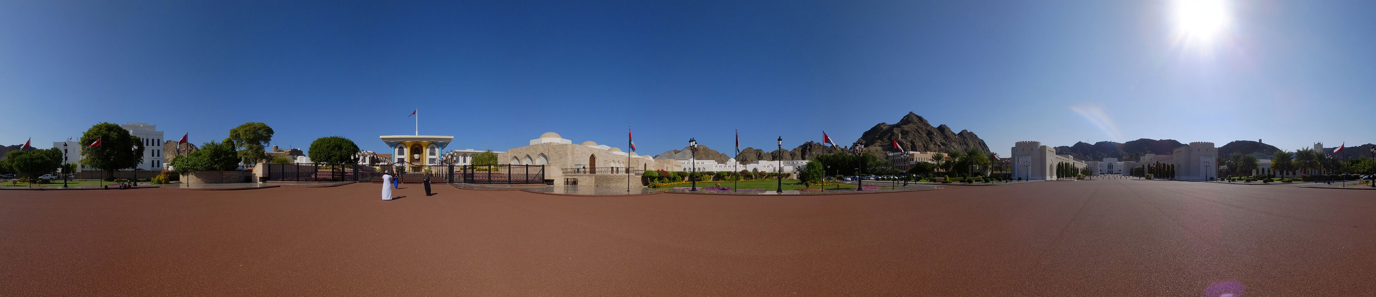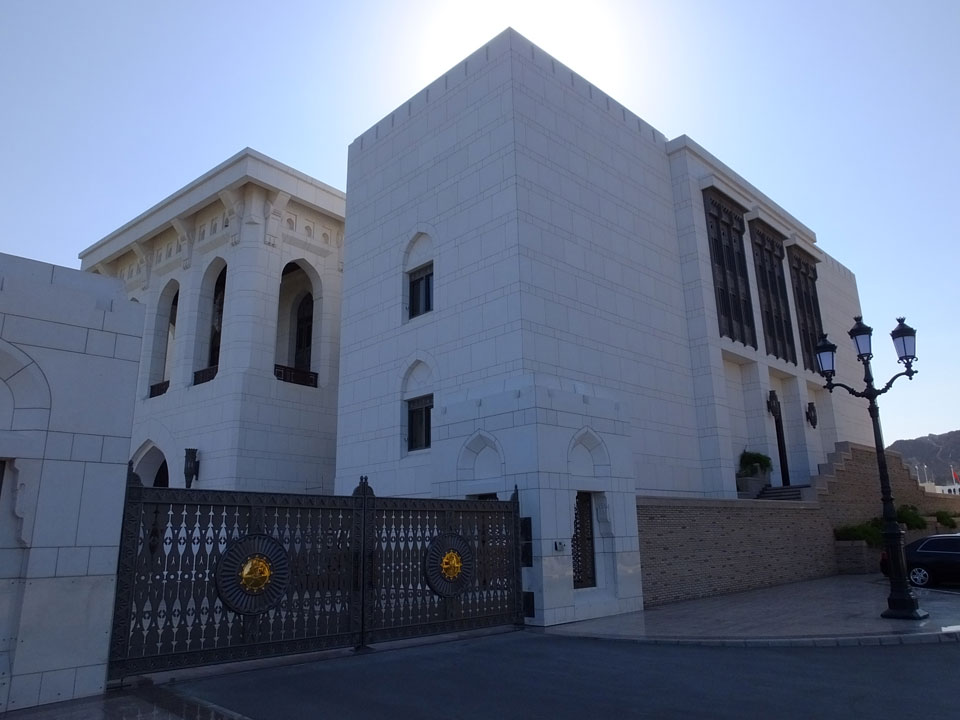 Auf einen kleinen Turm, dann entlang der menschenleeren Straße kam ein Engländer entgegen. „What a weird place“ sagte er – in der Tat. Jetzt zur Hauptsaison ist es doch arg leer. Wir kamen bis in’s Alte Muscat, wo der Sultanspalast und viele andere Gebäude stehen. In einem Museum gab’s etwas zur Geschichte des Sultanats, den verschiedenen Kleider der Stämme und eine große Briefmarkensammlung. In einer Art Bibliothek waren Bücher und Zeitschriften. Ein National Geographic Photobuch hatte viele nette Photos, die mich an ein paar Reisen erinnerten und auch zeigten, dass es noch viel mehr zu sehen gibt. Die Klimaanlage war hier besonders gut.