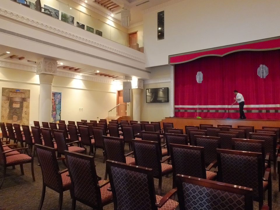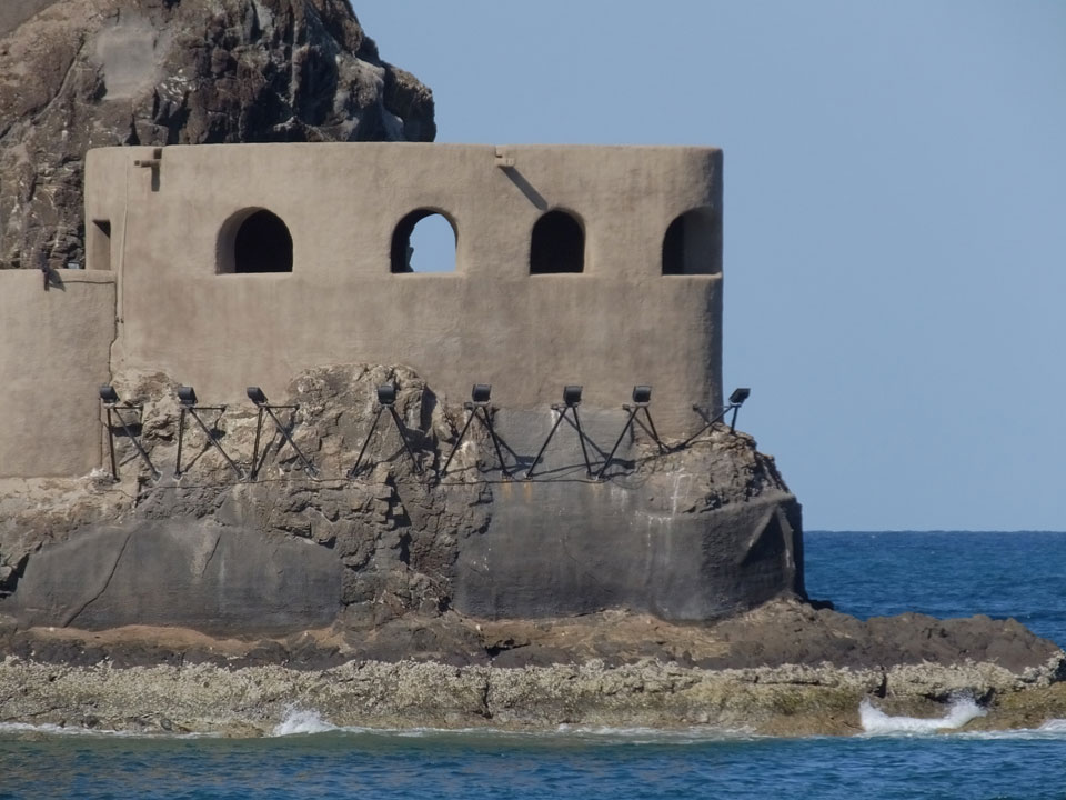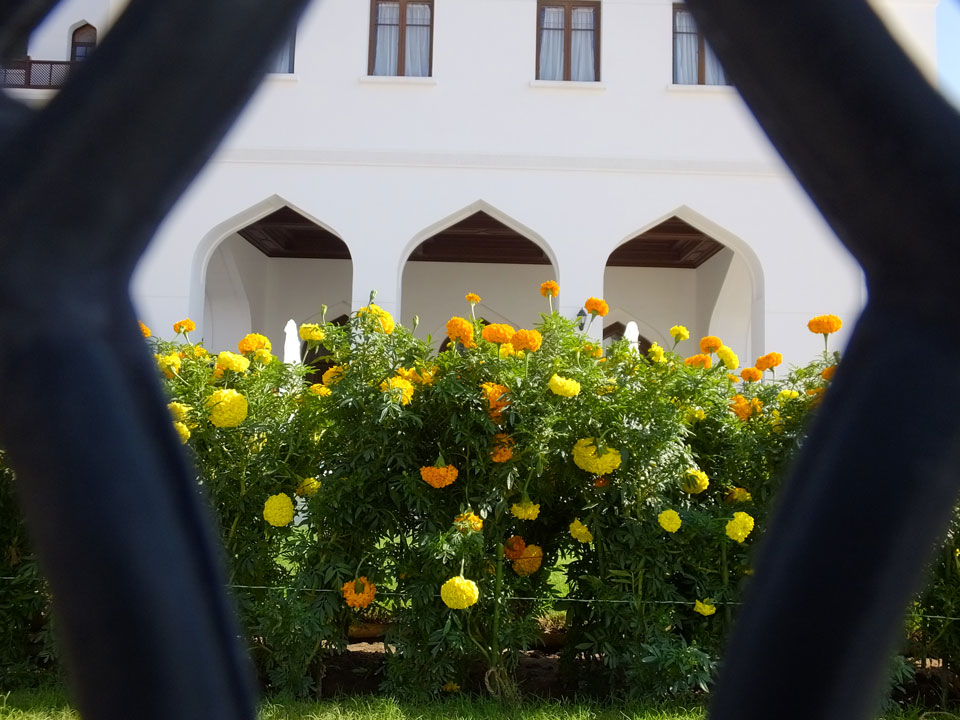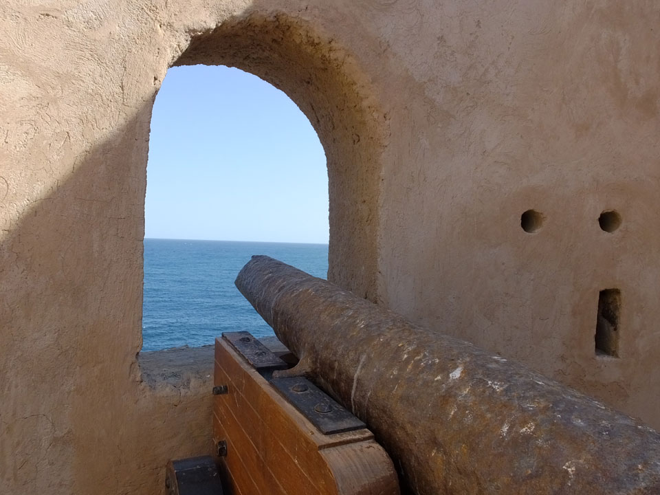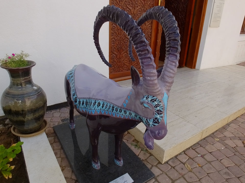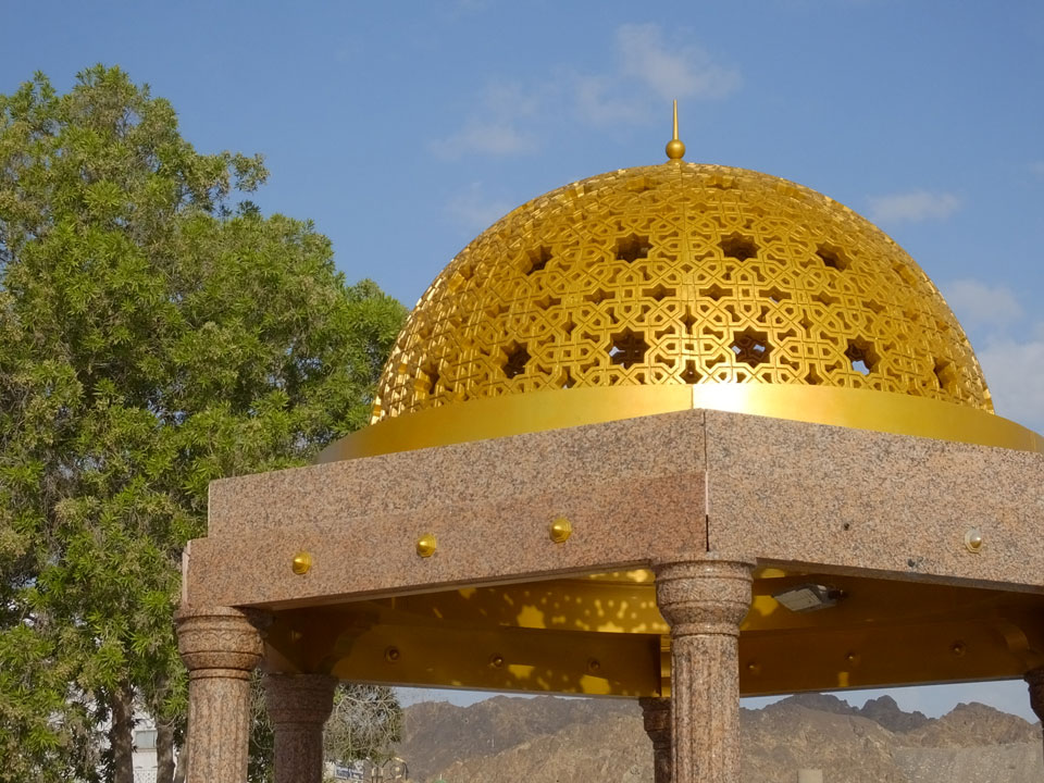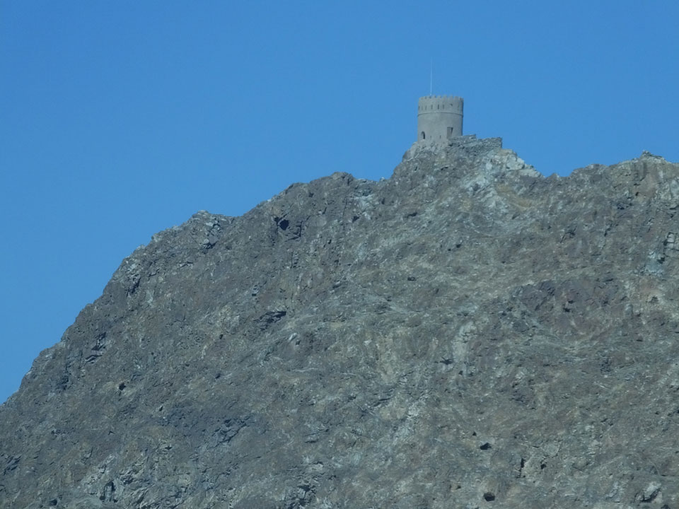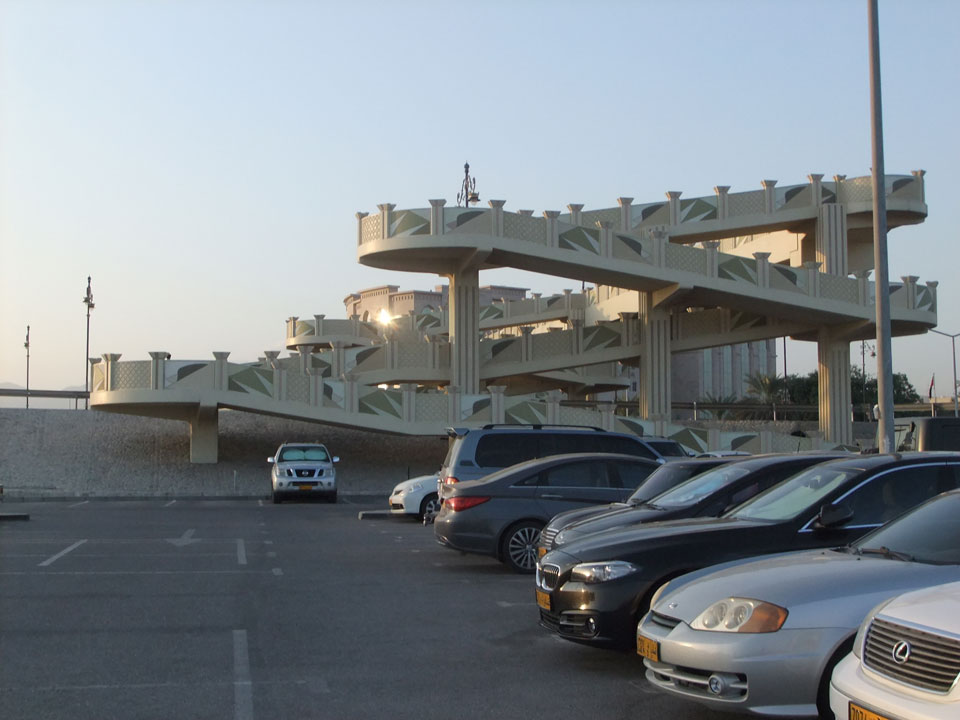 Auf einen kleinen Turm, dann entlang der menschenleeren Straße kam ein Engländer entgegen. „What a weird place“ sagte er – in der Tat. Jetzt zur Hauptsaison ist es doch arg leer. Wir kamen bis in’s Alte Muscat, wo der Sultanspalast und viele andere Gebäude stehen. In einem Museum gab’s etwas zur Geschichte des Sultanats, den verschiedenen Kleider der Stämme und eine große Briefmarkensammlung. In einer Art Bibliothek waren Bücher und Zeitschriften. Ein National Geographic Photobuch hatte viele nette Photos, die mich an ein paar Reisen erinnerten und auch zeigten, dass es noch viel mehr zu sehen gibt. Die Klimaanlage war hier besonders gut.