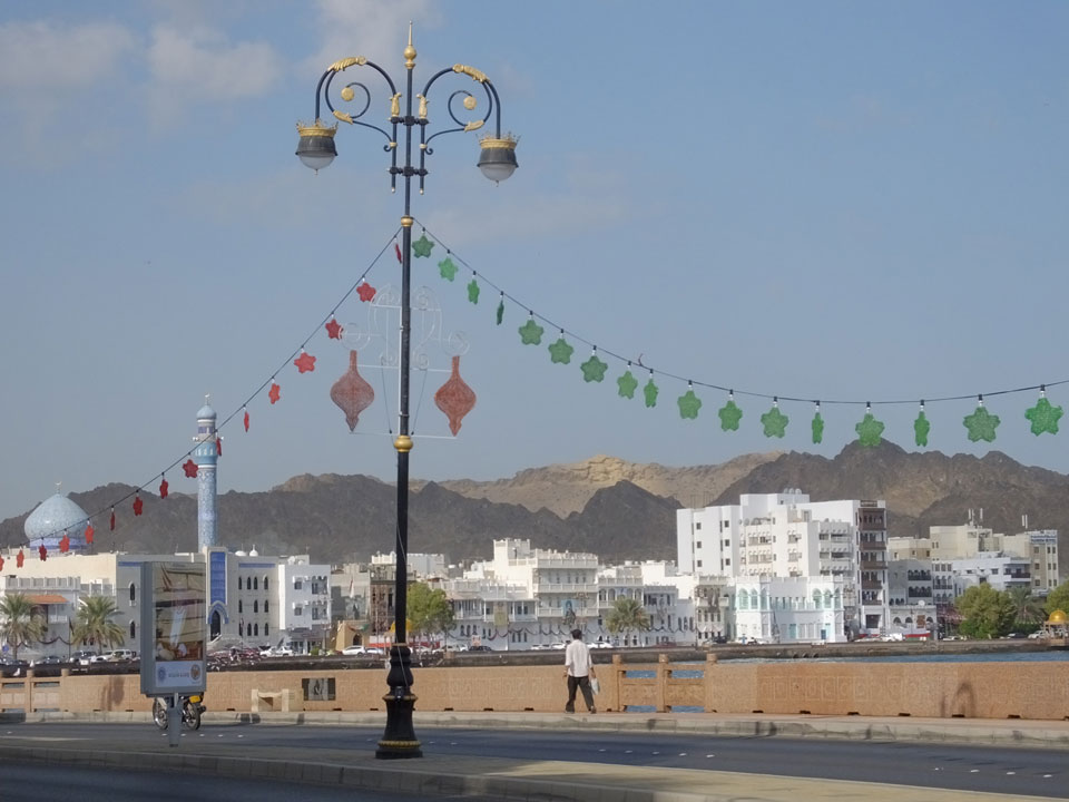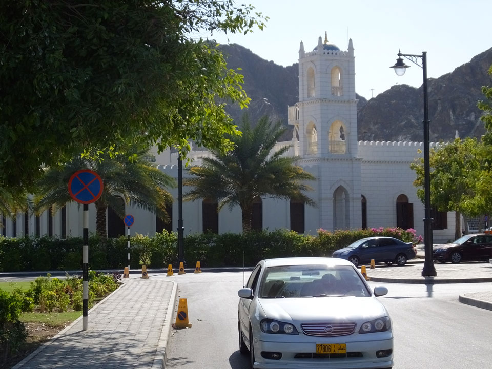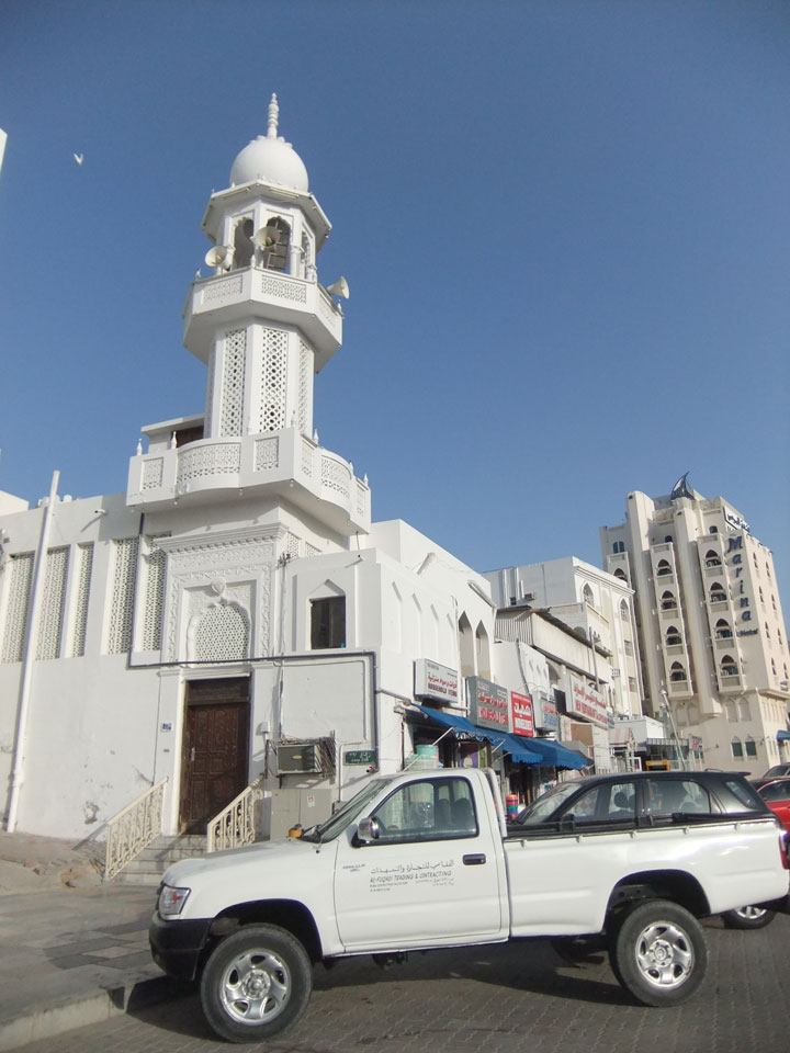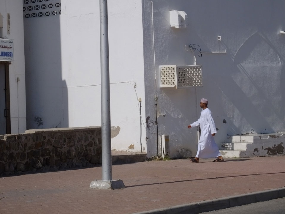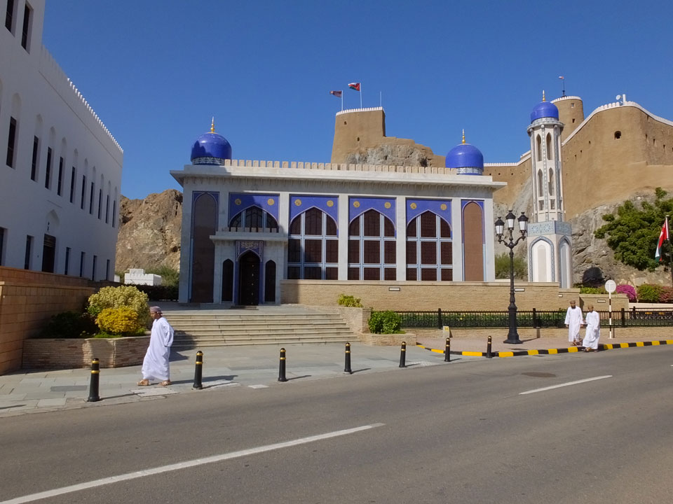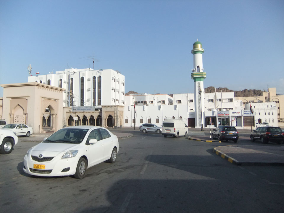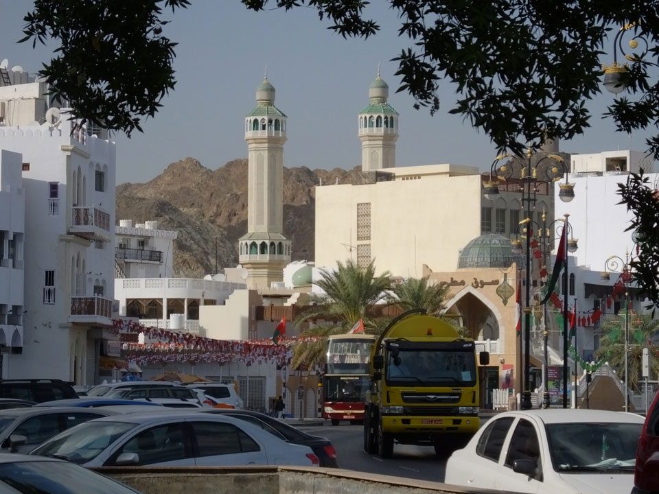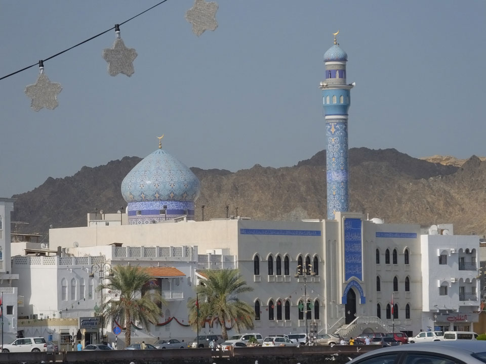 Muscat hat sich angelich in den letzten 40 Jahren radikal verändert. Überall stehen neue Häuser und niemand geht zu Fuß. Jetzt im November bis Februar ist das Klima angenehm – um die 30 Grad. Die neue Moschee sah ich nur im Vorbeifahren, wobei da einige ausstiegen. Im Minibus schienen nur ein paar Arbeiter aus Pakistan, Indien oder Sri Lanka. Benzin billig in diesem recht teuren Land – 0,12 Rials (€0,29) / Liter sah ich, als der Fahrer mal volltankte.