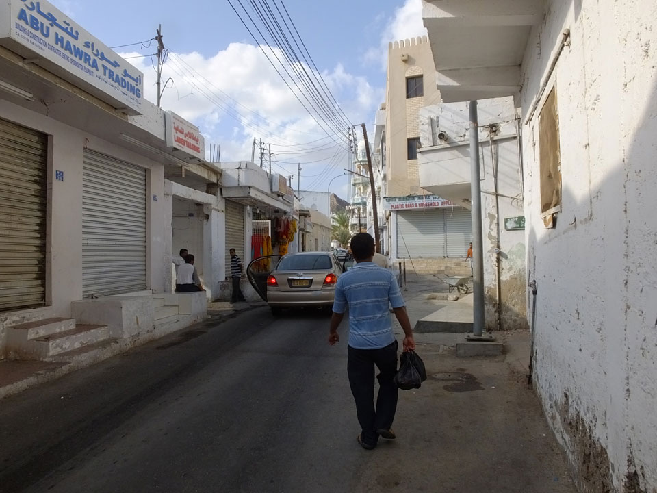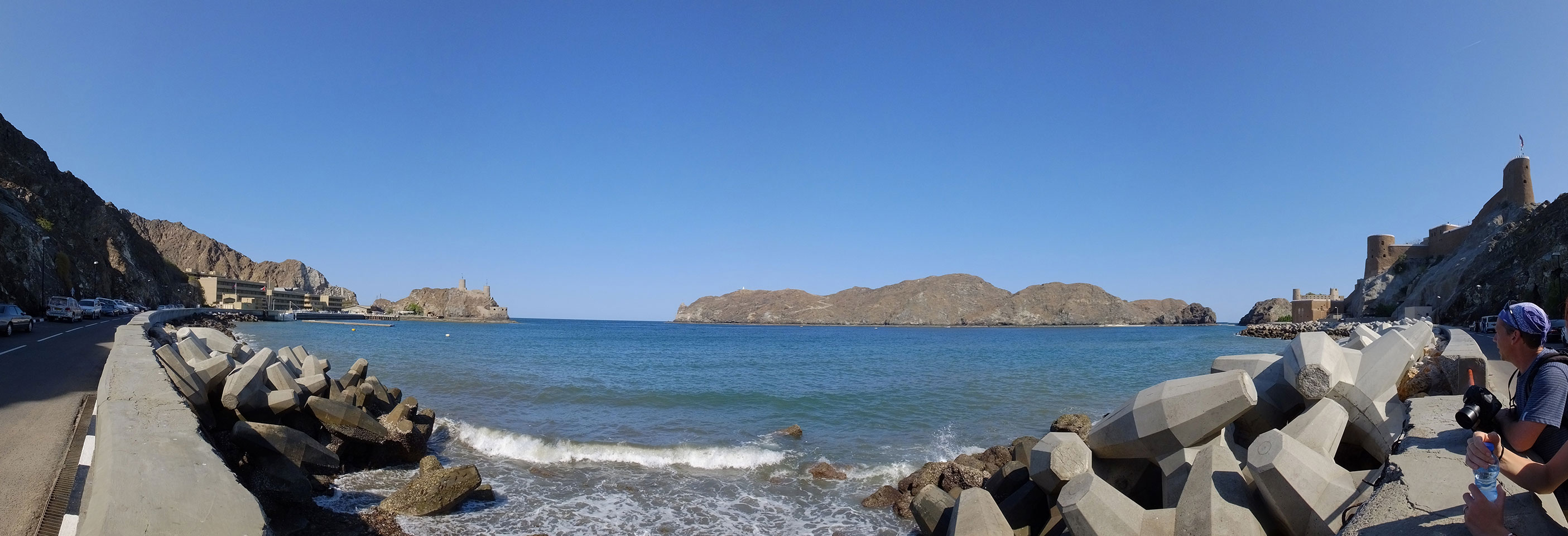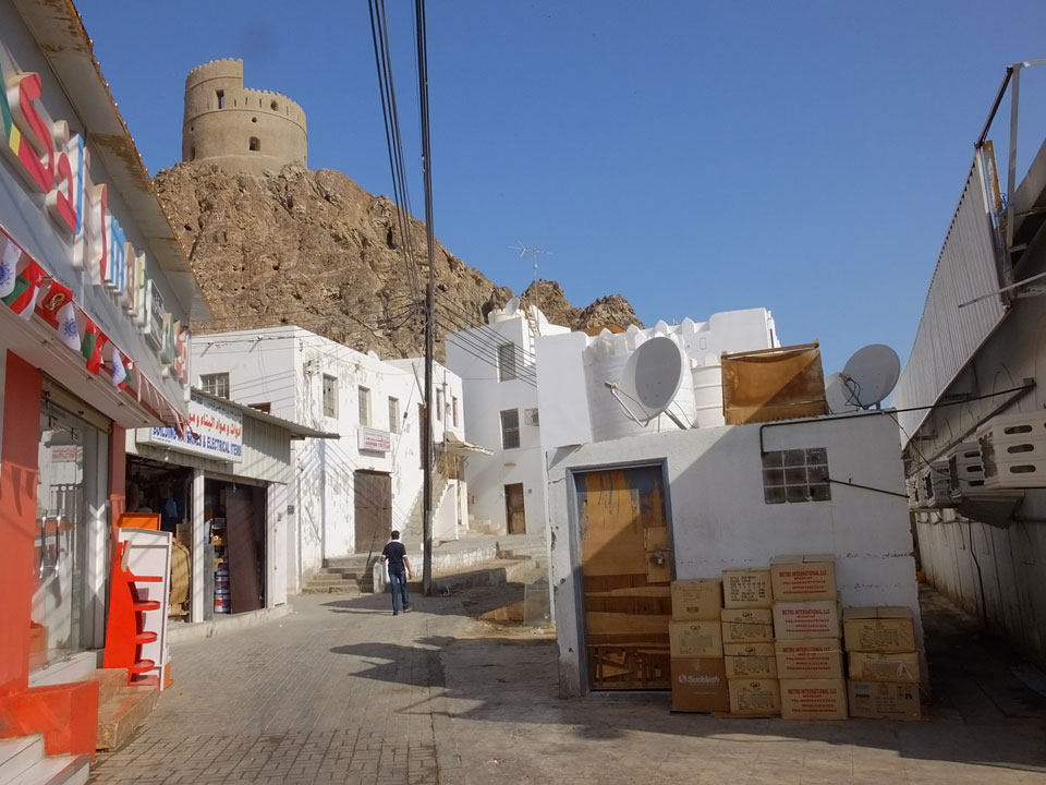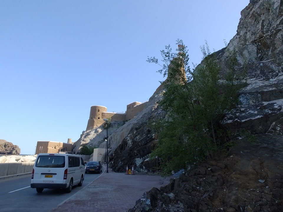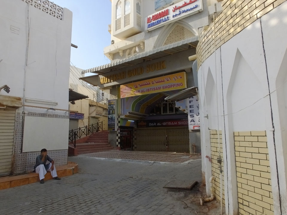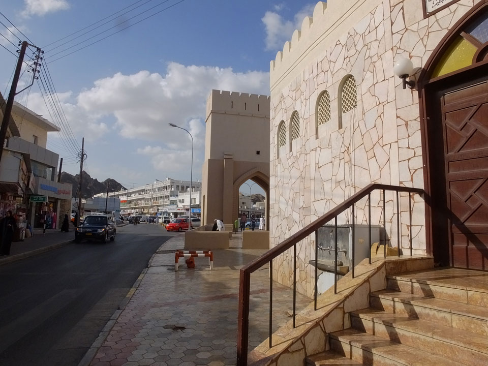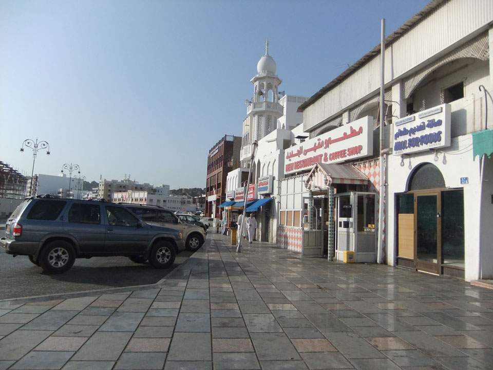 Ich wurde dann bei Ruwi rausgelassen – eine lange Fahrt für gerade 0,5 ORL (€1,25) – das klappte ja schonmal gut. Von da musst eich ein Taxi nehmen, was auch nochmal soviel kostete aber auch OK war. Ich war nun in Muttrah, dem Startpunkt einer Walking Tour. Ich suchte nun doch erst mal ein Hotel. Im Lonely Planet wurden mehrere Billighotels empfohlen. Ich fand diese doch die waren geschlossen. Überhaupt waren kaum Touristen hier zu sehen. Ich hatte eine Kaffee, ein Brötschen aus Deutschland und machte erst mal Frühstück. Das Naseem Hotel war das einzig offene Budget Hotel und wollte 20 ORL (€49) die Nacht. Einige Leute da aber nichts zu verhandeln bei meinen nur ca. 14h Aufenthalt. So viel Cash hatte ich nicht dabei, ATMs sollen am Souk sein, wohin ich dann auch langsam watschelte.
