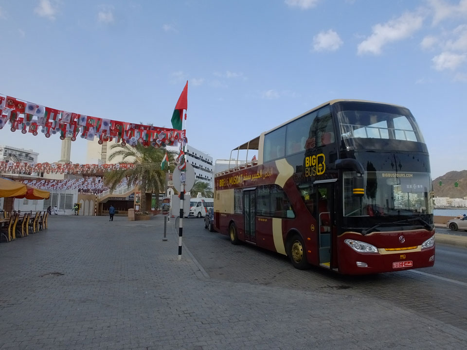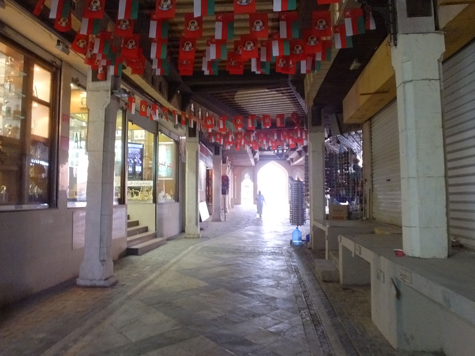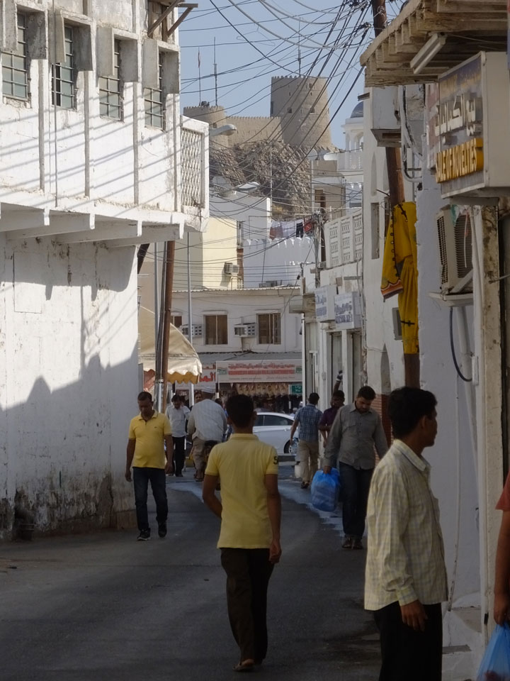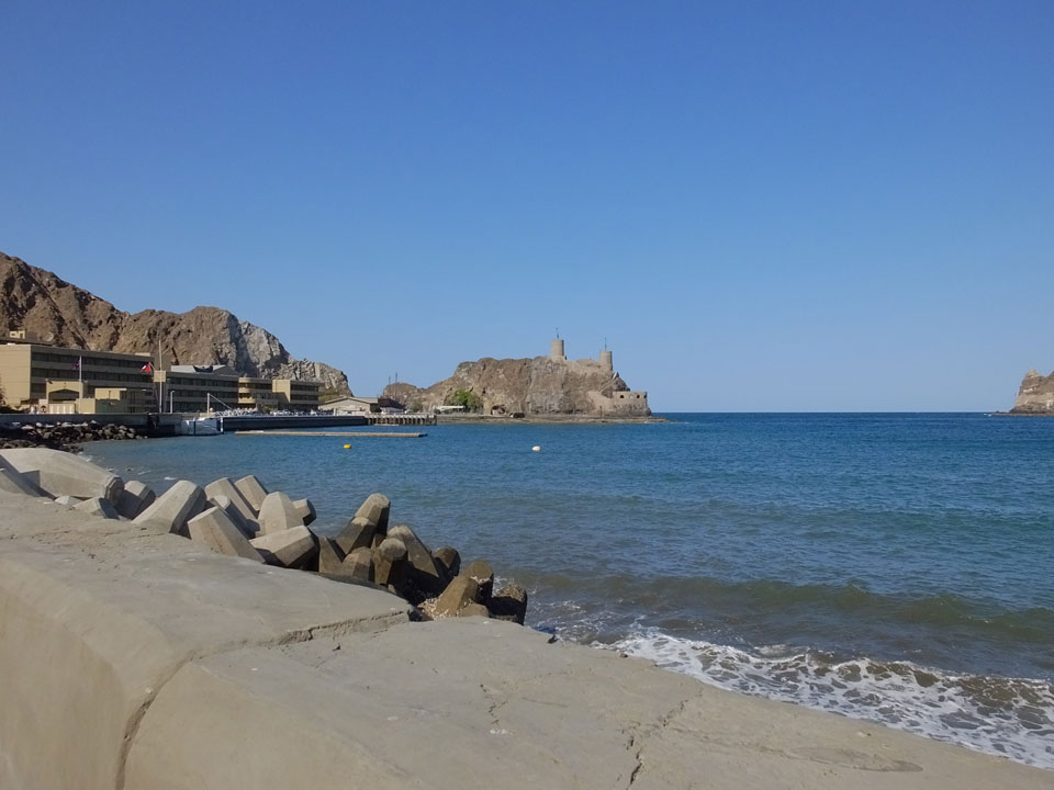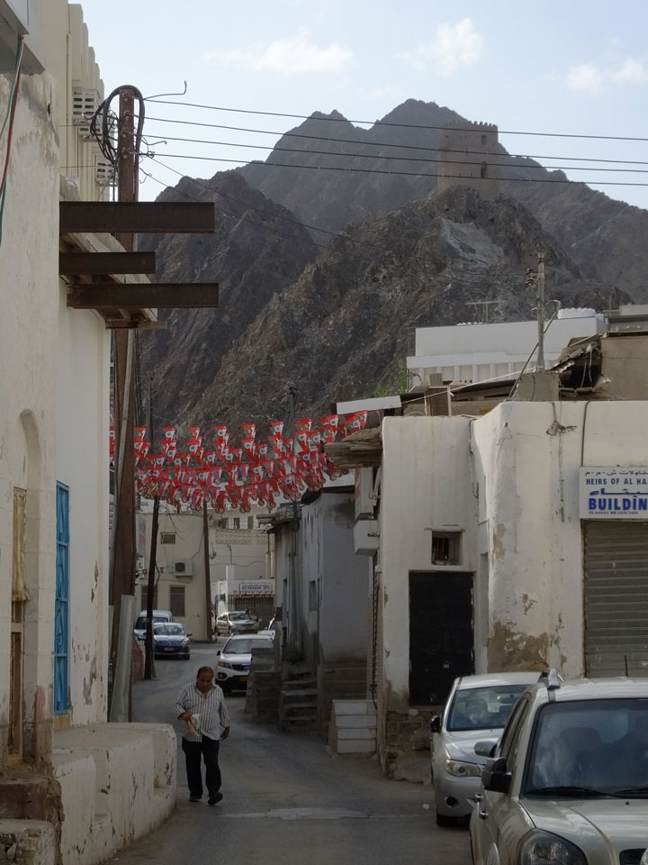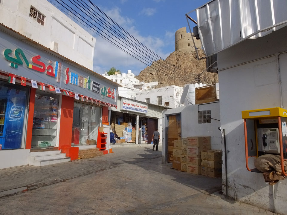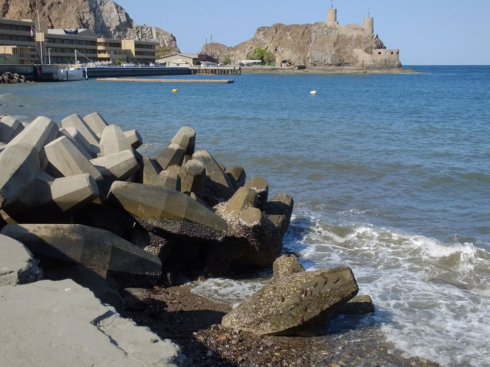 Ich wurde dann bei Ruwi rausgelassen – eine lange Fahrt für gerade 0,5 ORL (€1,25) – das klappte ja schonmal gut. Von da musst eich ein Taxi nehmen, was auch nochmal soviel kostete aber auch OK war. Ich war nun in Muttrah, dem Startpunkt einer Walking Tour. Ich suchte nun doch erst mal ein Hotel. Im Lonely Planet wurden mehrere Billighotels empfohlen. Ich fand diese doch die waren geschlossen. Überhaupt waren kaum Touristen hier zu sehen. Ich hatte eine Kaffee, ein Brötschen aus Deutschland und machte erst mal Frühstück. Das Naseem Hotel war das einzig offene Budget Hotel und wollte 20 ORL (€49) die Nacht. Einige Leute da aber nichts zu verhandeln bei meinen nur ca. 14h Aufenthalt. So viel Cash hatte ich nicht dabei, ATMs sollen am Souk sein, wohin ich dann auch langsam watschelte.