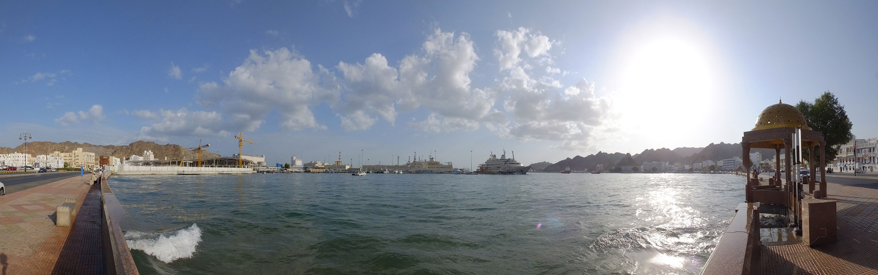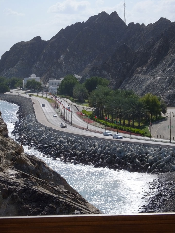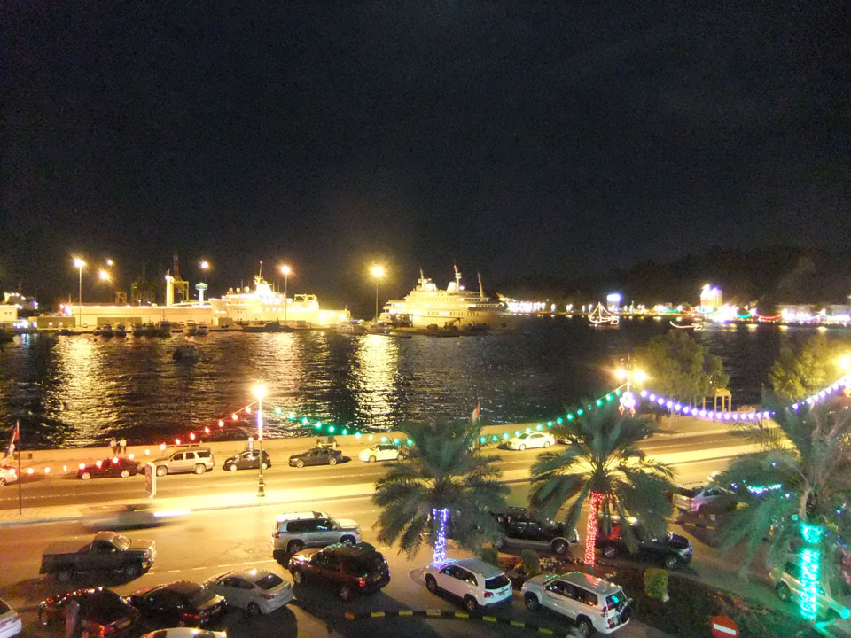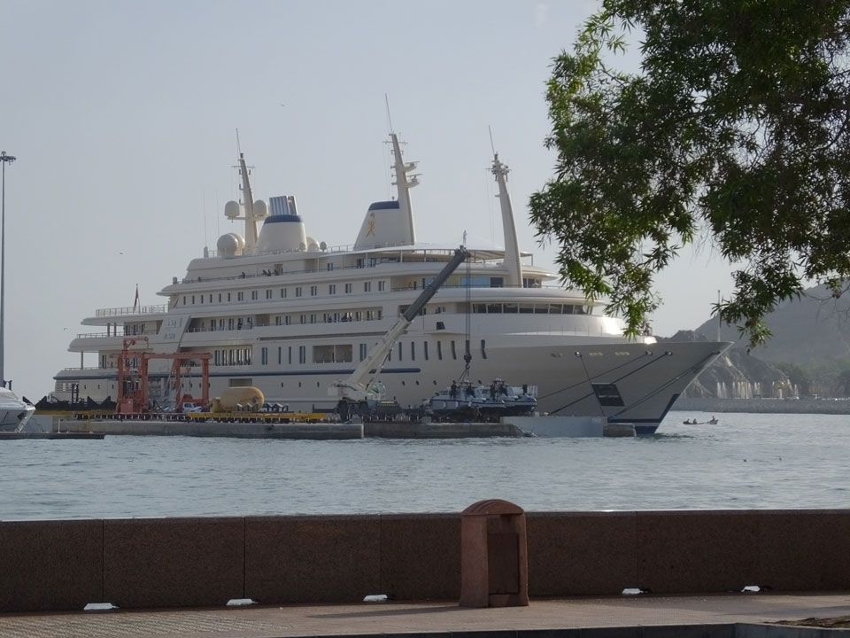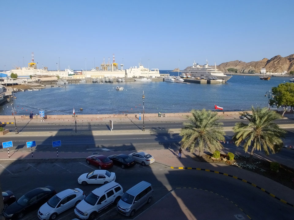 Wir gingen war essen. Das Mutton-Curry war exzellent, der Kiwisaft auch. Mit einem Taxi von 3 auf 0,8 runtergehandelt ging’s wieder in’s Hotel. Er bot an, dass wir in seinem Zimmer Duschen und chillen können. Sehr nett von ihm und so war’s dann auch. Ich duschte endlich und legte mich eine Weile hin. Die beiden verschwanden, weil er noch ein Photo vom Sonnenuntergang machen wollte. Sein Zimmer 32 hatte eine tolle Aussicht auf den Hafen – auch mit einer $200 Mio Yacht des Sultans, in Deutschland gebaut und angeblich sehr schön innen. Oman hat kaum eigenes Öl, sodass viel in Bildung investiert wird. Das Land scheint dennoch reich, trotz karger Landschaften. Ich war erst mal im Traumzauberland und wachte erst wieder auf, als er wieder zurück kam.