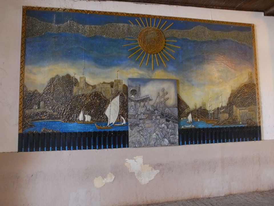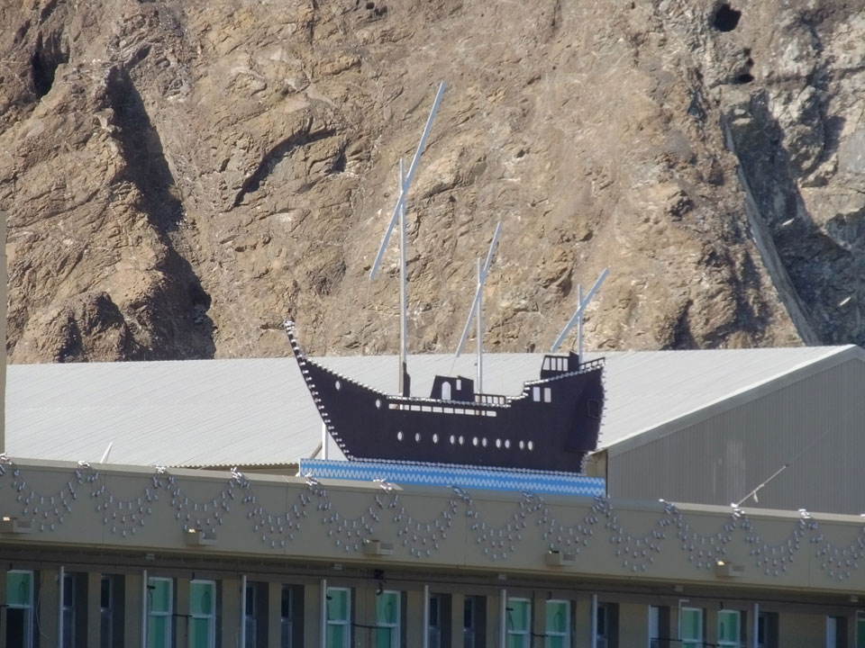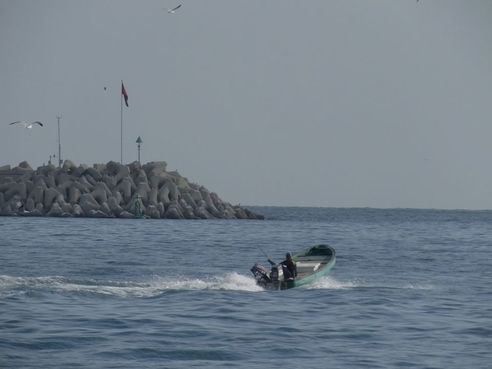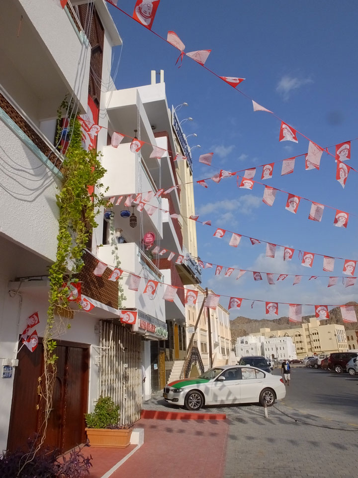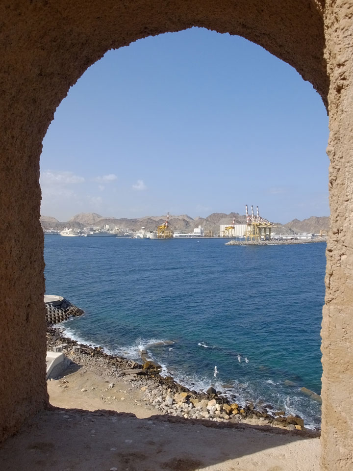 Wir gingen war essen. Das Mutton-Curry war exzellent, der Kiwisaft auch. Mit einem Taxi von 3 auf 0,8 runtergehandelt ging’s wieder in’s Hotel. Er bot an, dass wir in seinem Zimmer Duschen und chillen können. Sehr nett von ihm und so war’s dann auch. Ich duschte endlich und legte mich eine Weile hin. Die beiden verschwanden, weil er noch ein Photo vom Sonnenuntergang machen wollte. Sein Zimmer 32 hatte eine tolle Aussicht auf den Hafen – auch mit einer $200 Mio Yacht des Sultans, in Deutschland gebaut und angeblich sehr schön innen. Oman hat kaum eigenes Öl, sodass viel in Bildung investiert wird. Das Land scheint dennoch reich, trotz karger Landschaften. Ich war erst mal im Traumzauberland und wachte erst wieder auf, als er wieder zurück kam.