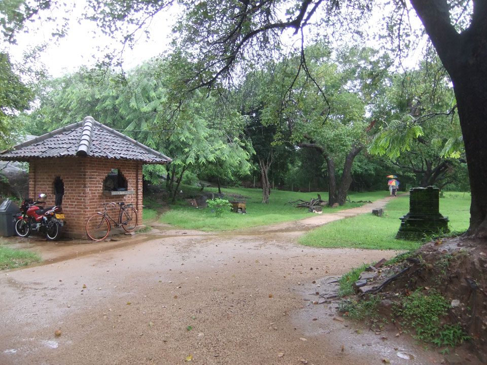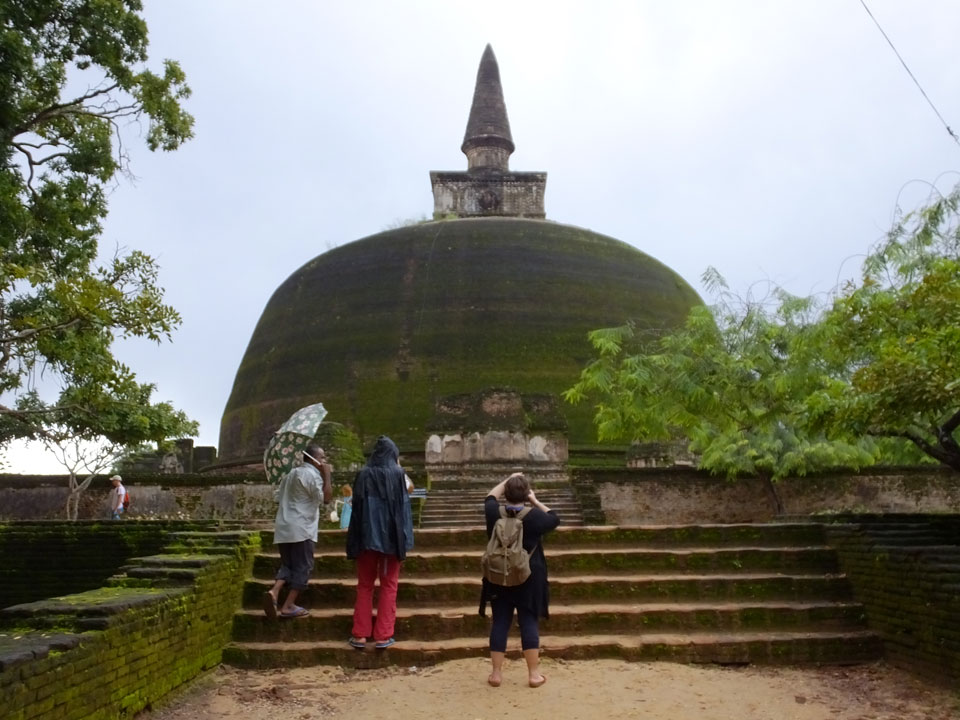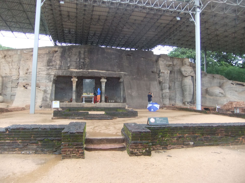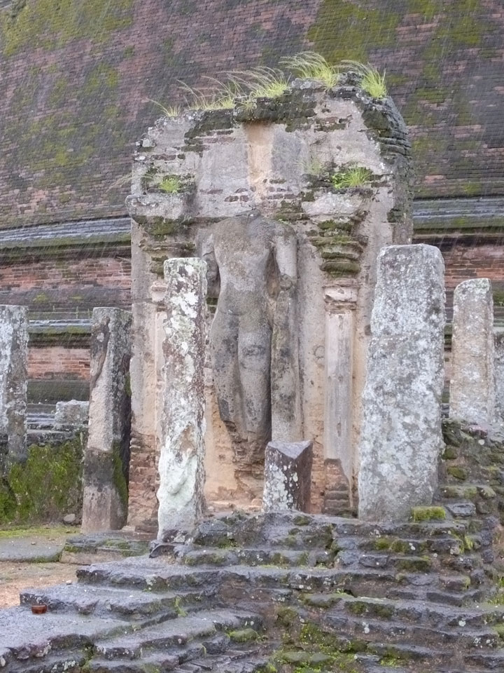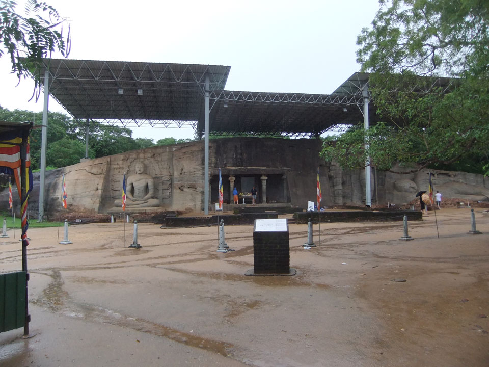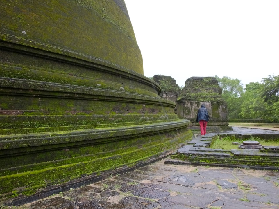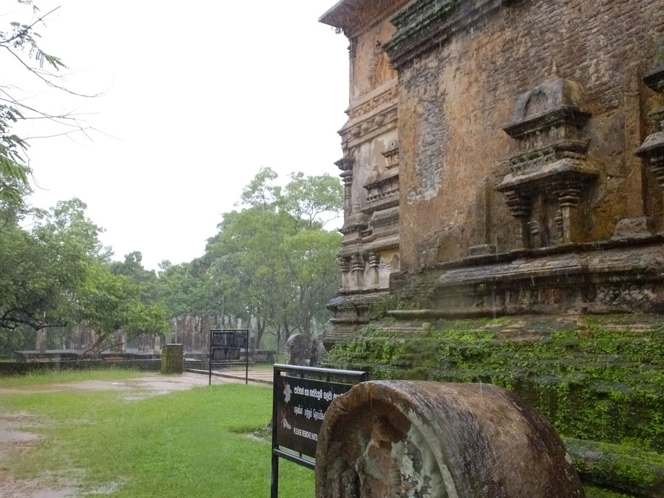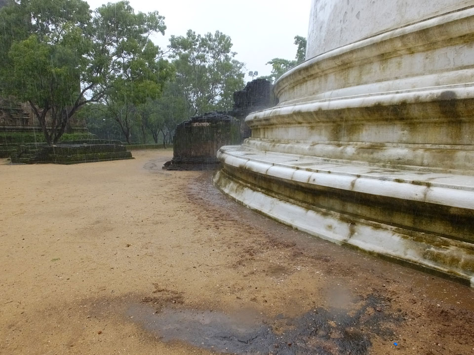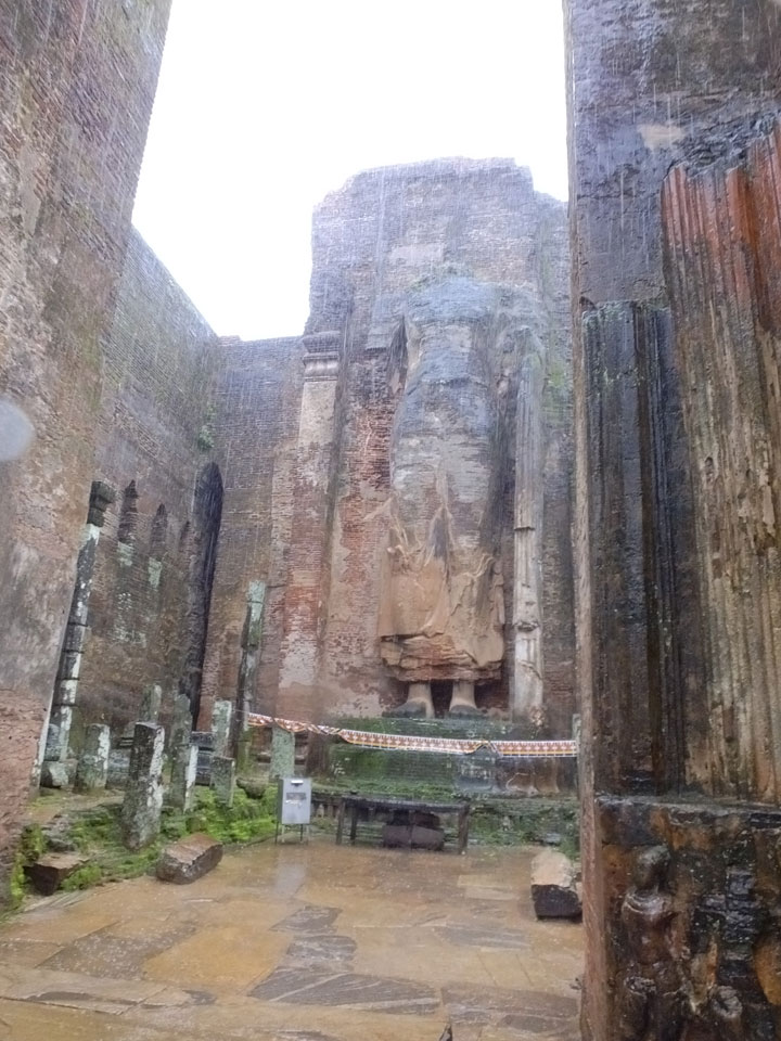 Der Regen wurde immer stärker und ich konnte meine Fuji kaum mehr trocken halten. Einen Poncho hatte er mit dabei aber großes Herumknipsen im Monsoon fiel in’s Wasser. Wir drehten mit immer stärkerem Wolkenbruch immer kleinere Runden um die Dagoben und schafften die großen Buddha Fels-Statuen dann auch noch. Zum Glück war ich heute nicht auf dem Fahrrad unterwegs.