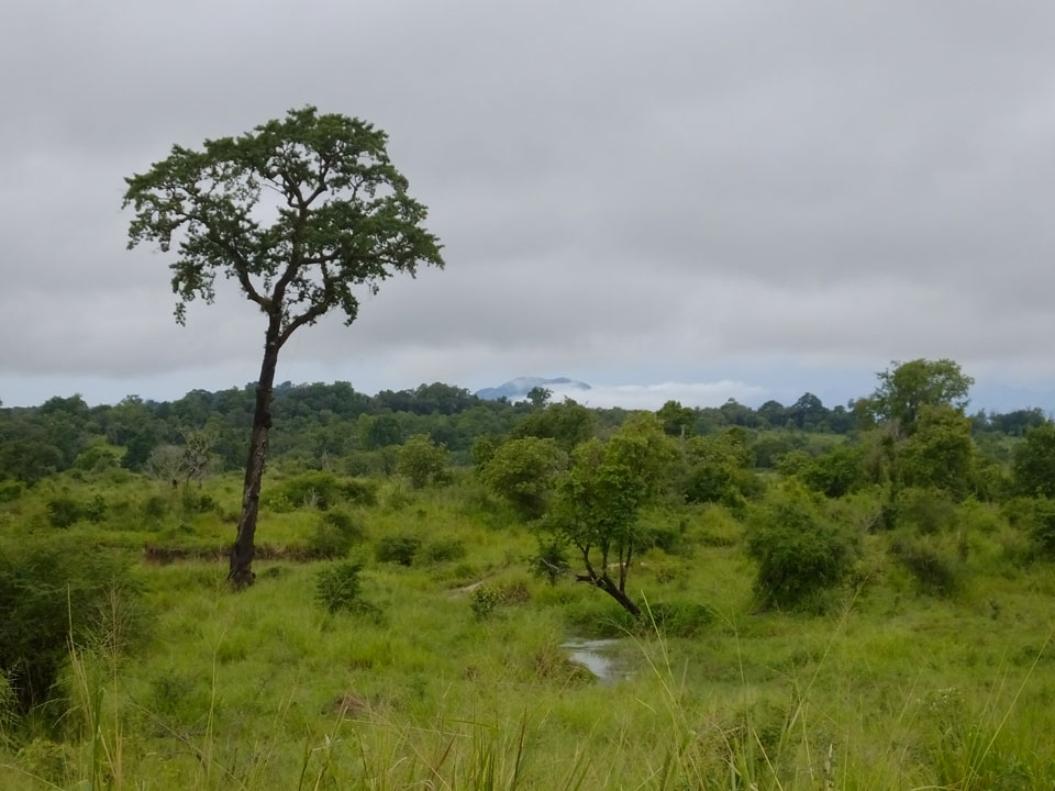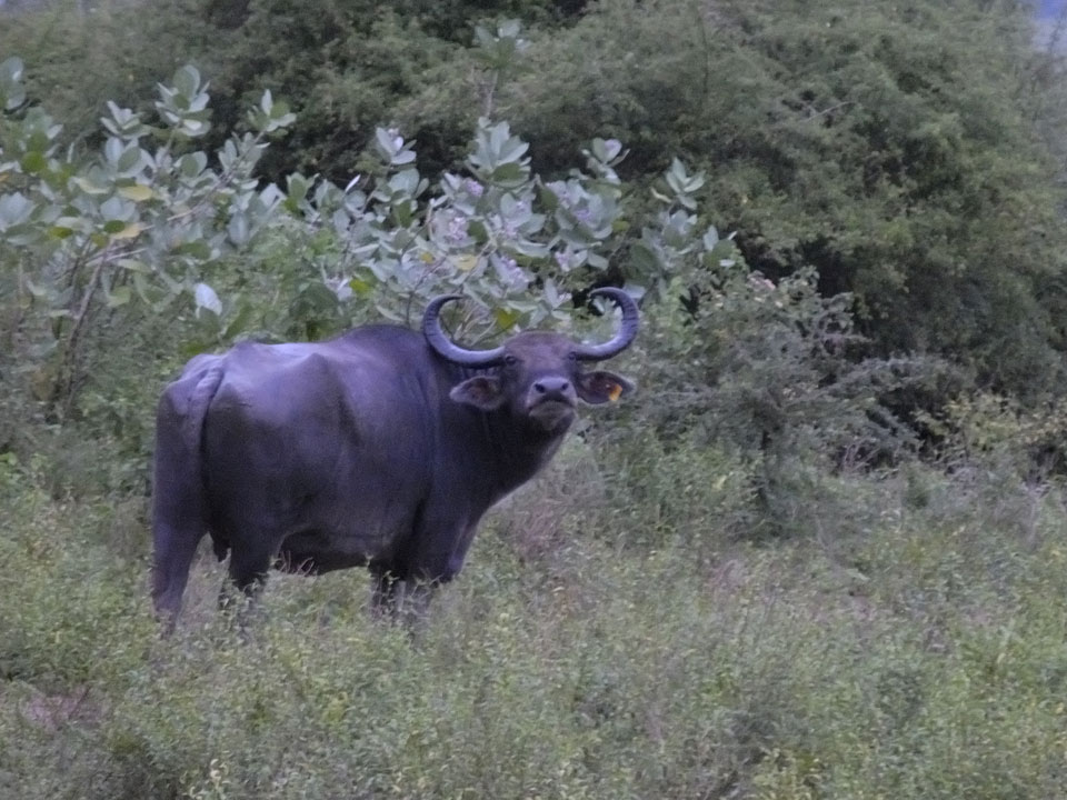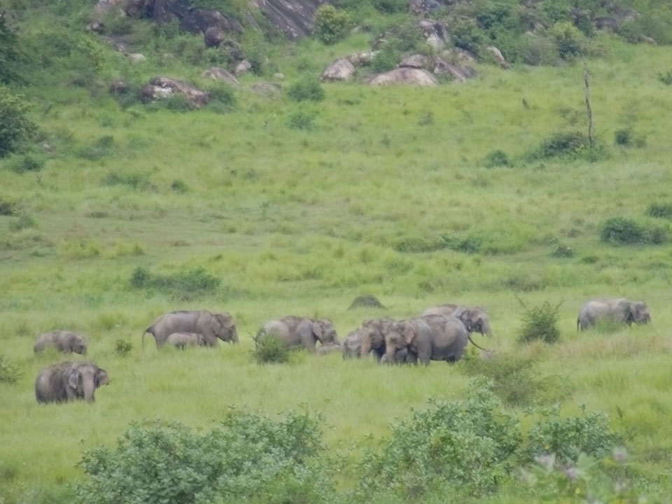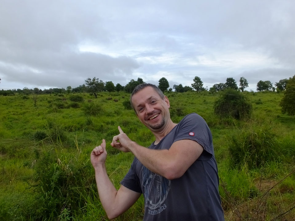 Wir kamen auf eine gute Straße und da riefen die Italiener „Elefanti!“. Ja, in der Ferne sah ich die erste kleine Herde, später noch mehr. Heute nach dem Regen waren enige Elefanten noch etwas nass und auch weiter weg. Nicht ganz wie auf den Photos der Holländer gestern, wo die Elefanten ganz nah am Auto waren. So konnten wir jedoch gut aus dem Auto steigen und mein 1000mm Zoom war hier goldrichtig. Die Elefanten fraßen ihr Gras und guckten. Alles schön nett.