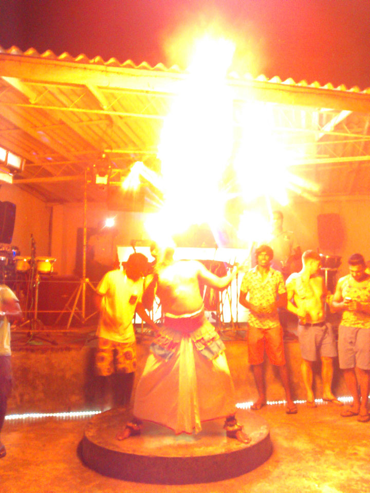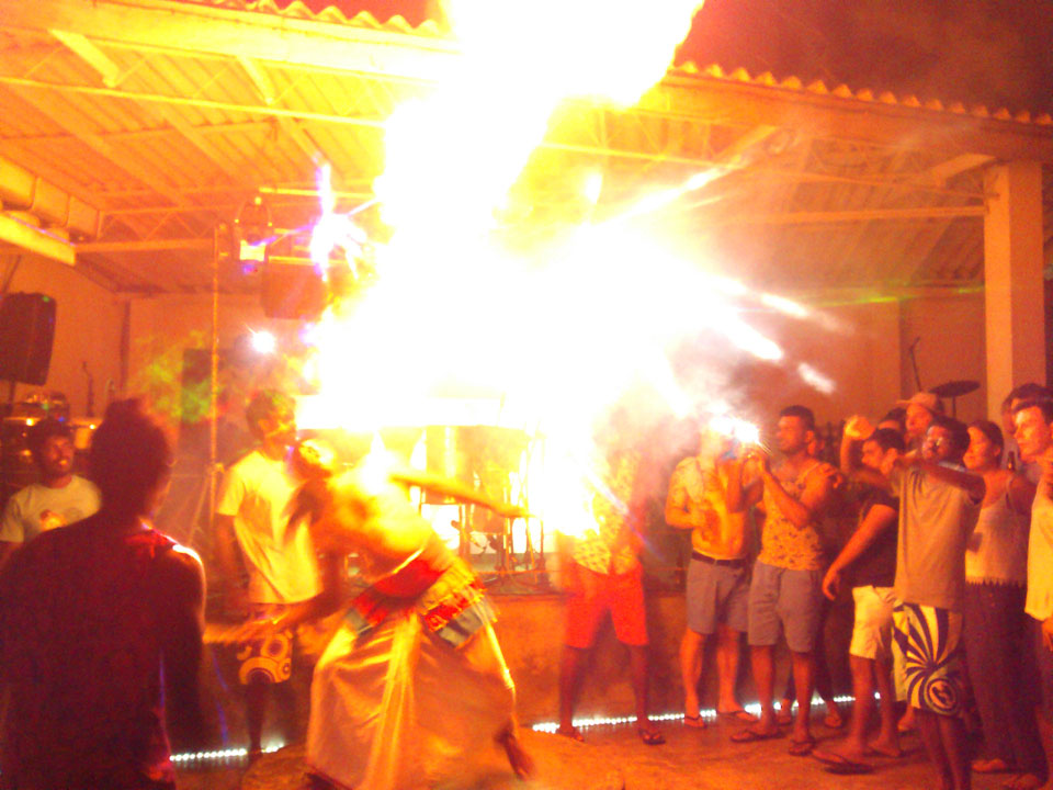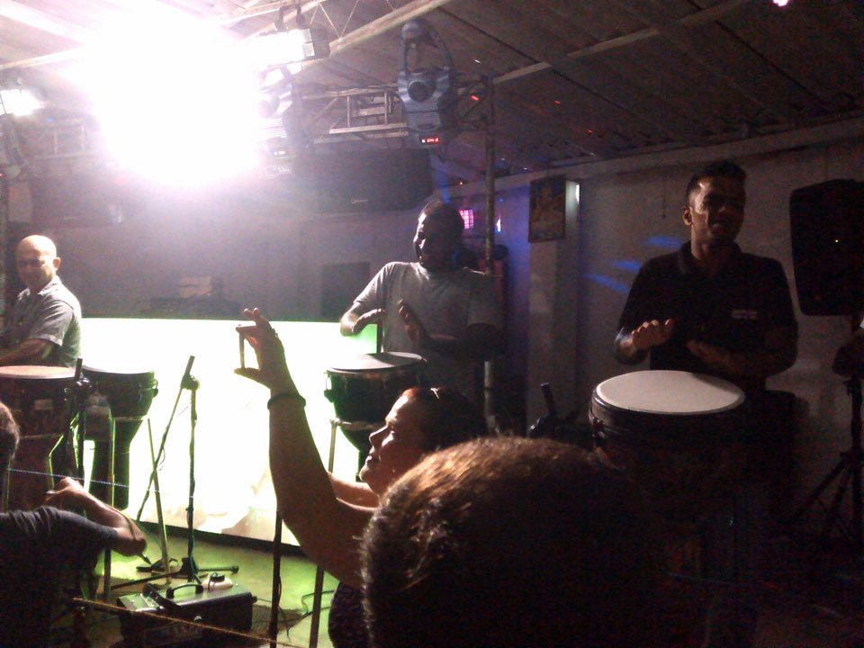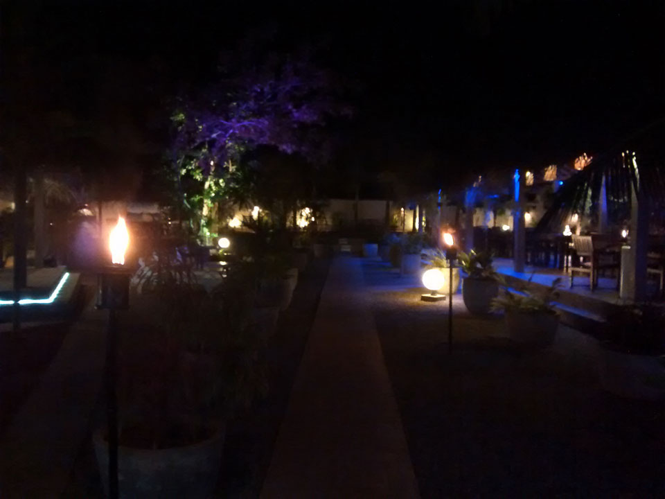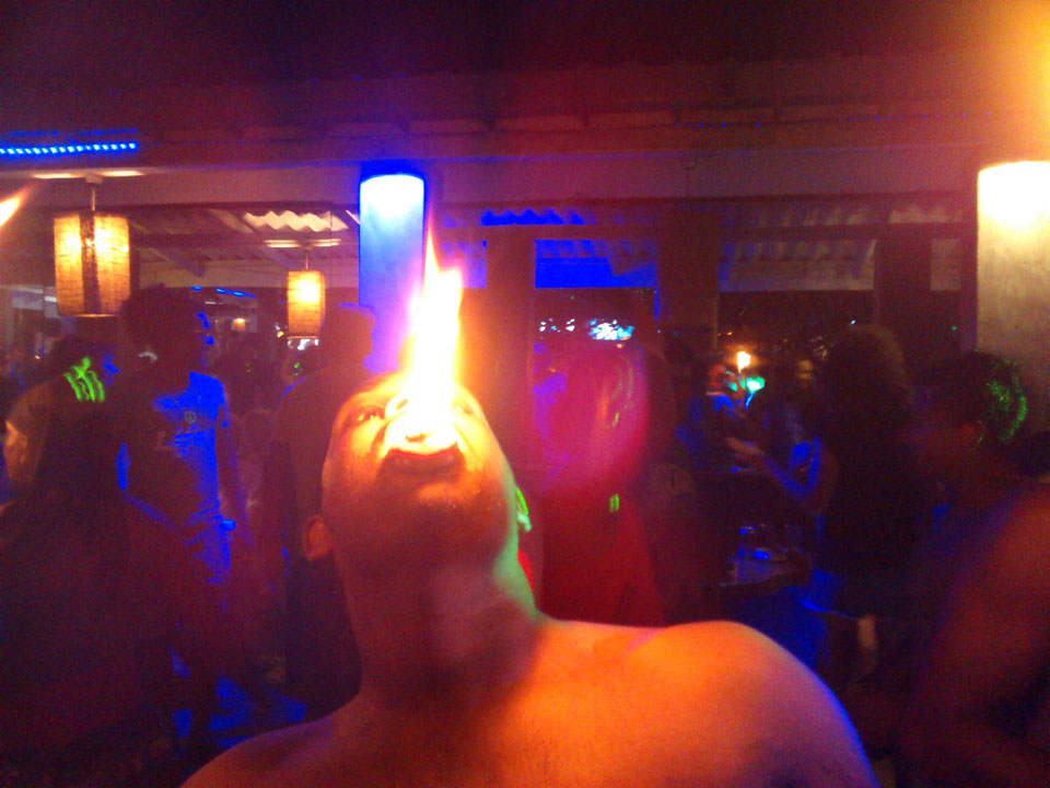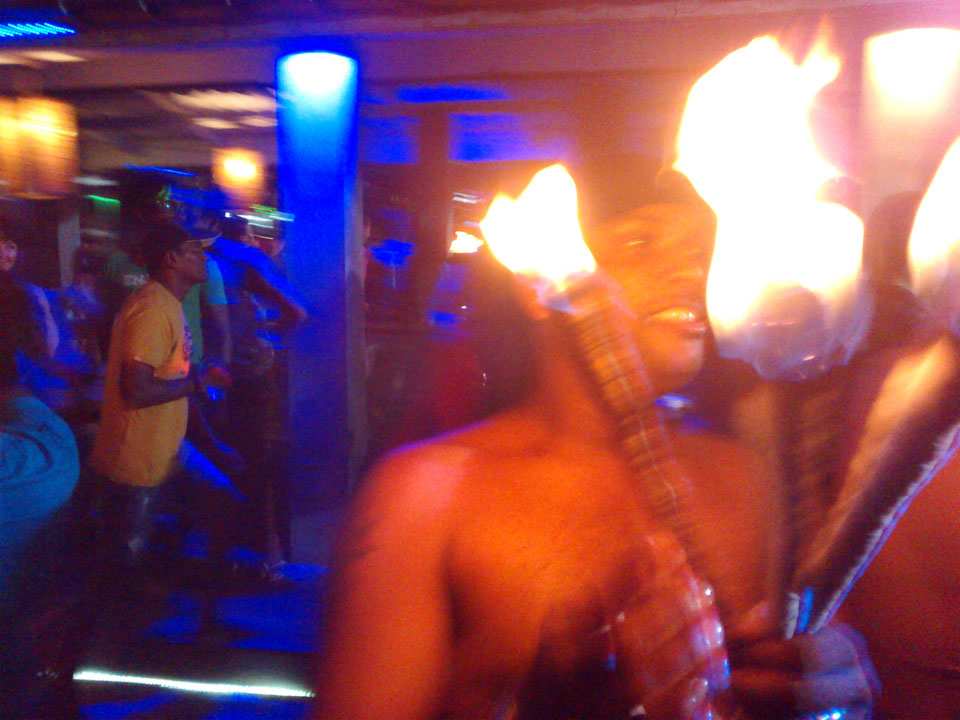 Der Sonnenuntergang war auch nett – ein netter Abschluss. Gutes Abendessen und schließlich mal etwas Nightlife. Mit dem Taxi fuhr ich zum „Vibrations“. Das ist eine Hotelanlage. Gegen 22:00 war da noch wenig los. Ich lag etwas auf Äner Liege und scheckte das Internet. Die Party startete schließlich gegen Mitternacht. Ein paar Bier gingen bei mir, wobei ich da zu vergeizt für echte Drinks war. Die Feuerschlucker kannten scheinbar keinen Schmerz. Einer hielt lange die Zunge brennend für mein Photo. Chili macht’s möglich… Russen hatten auch Spaß, einer drank zu viel und ein Pimp drehte auch die Runde. Interessantes Nachtleben, kurz und gut. Nette Trommler-Show.