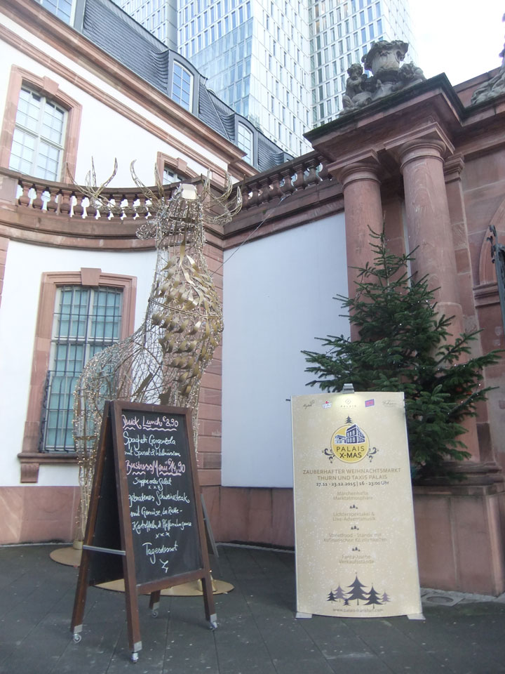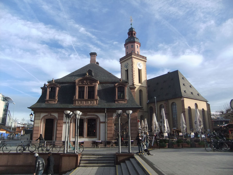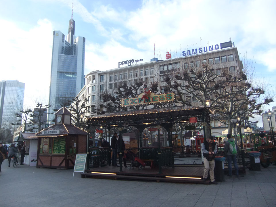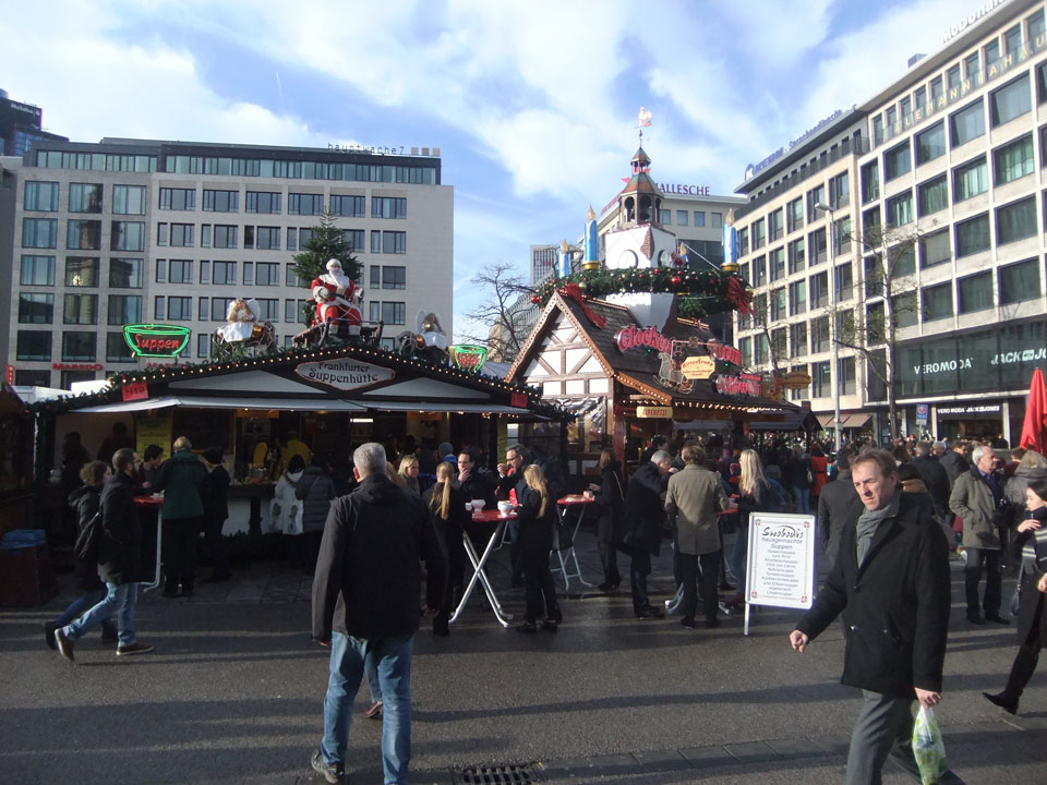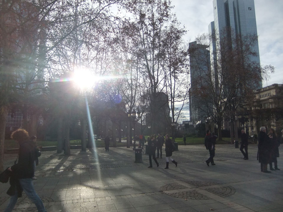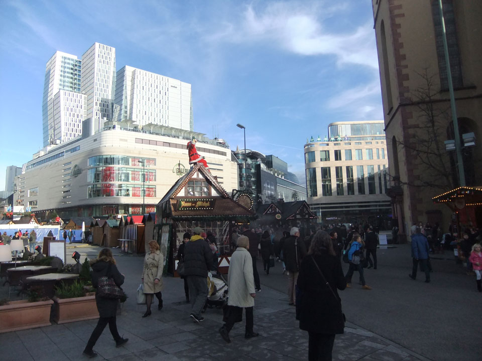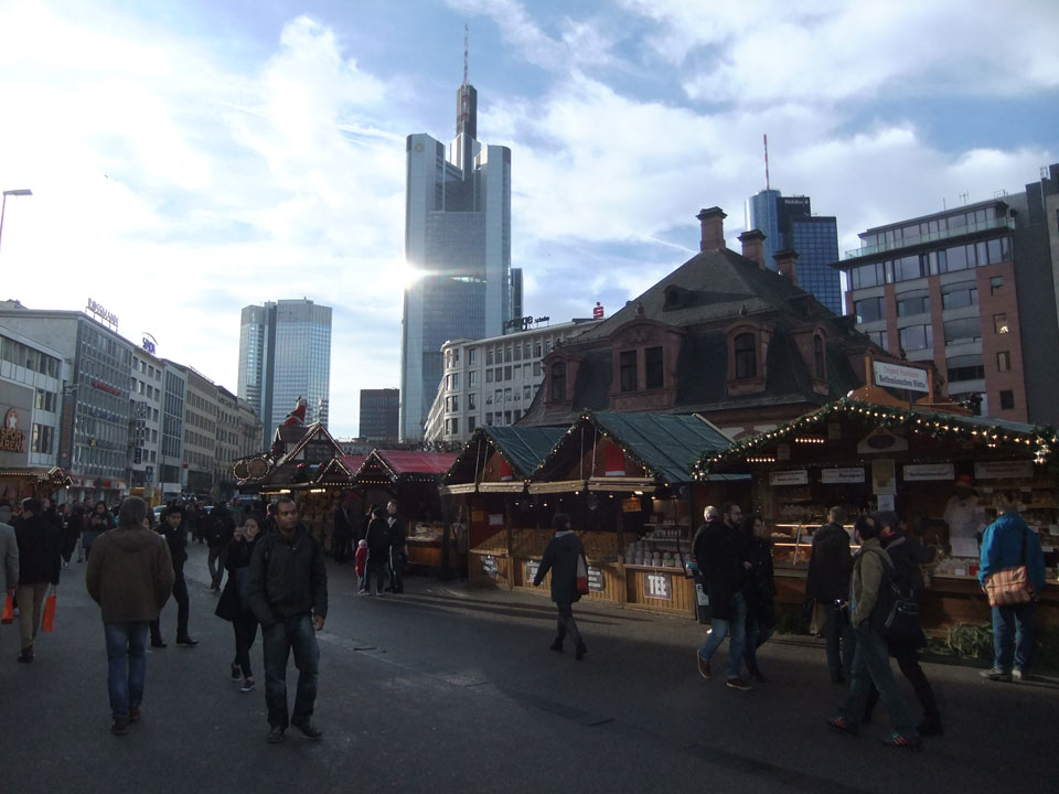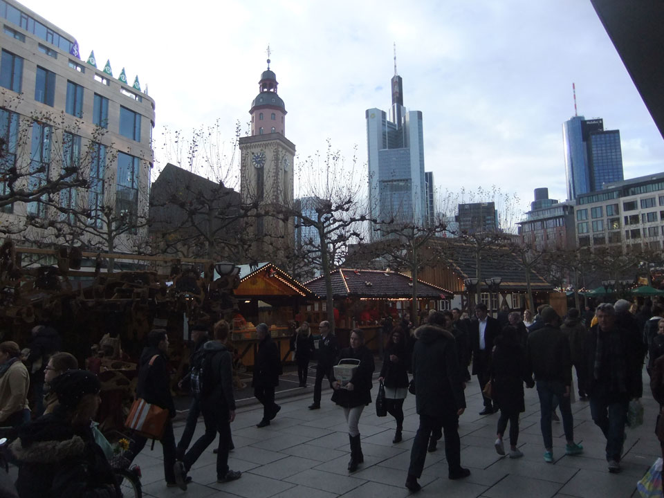 Bei Sonnenschein spazierte ich zum Römer und damit dem Frankfurter Weihnachtsmarkt. Überschaubar aber nett, einige Leute auf den Straßen. Nach eine Runde durch die Gegend holte ich mir eine Currywurst und ging wieder zurück. Frankfurt ist eine ganz nette Stadt. Bunt gemischt.