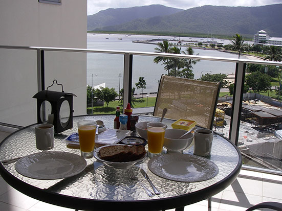 Frühstück aufm Balkon. Der Ausblick is phantastisch. Ich war selten so happy in einem Apartment. Hier sehe ich aufs Meer, es ist warm und die Sonne scheint. Nice.