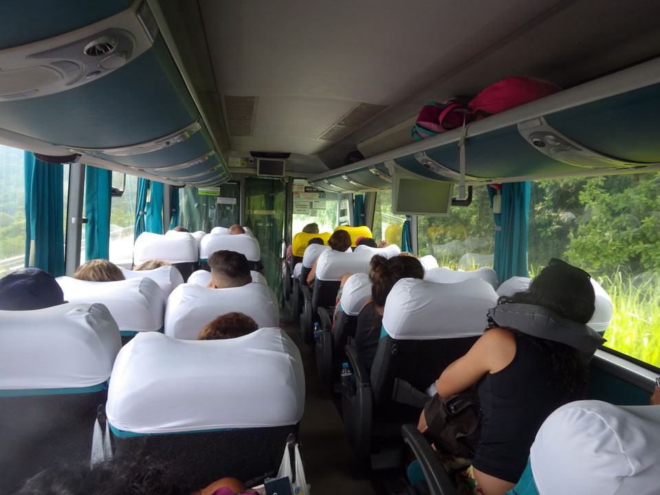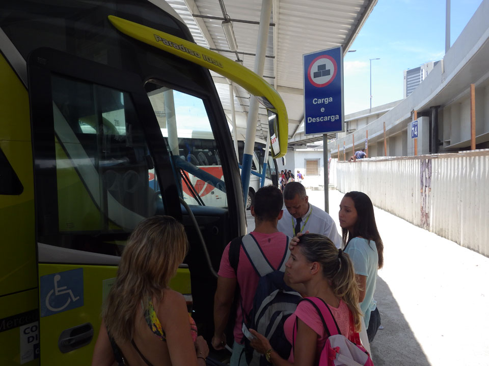 Die Fahrt dauert in der Tat ewig lang. Am Sambadrom vorbei auf der Schnellstraße doch Richtung Rondovaria ging’s nur im Schrittempo. Ich kam hin, suchte nach der Busfirma, hatte ja ein Ticket online gebucht, was ich jetzt nur abholen sollte. „Nur abholen“ ging aber nicht so einfach. Eine gigantische Schlange vor dem Schalter und mein Bus in 15′ – irre. Es gab zwar Automaten für die Ticketvouchers aber die gingen nicht richtig. Zum Glück waren zwei Backpackermädels am Schalter nebenan, die gerade Tickets für Montag kauften und mich rein ließen. Ist nicht die feine Art, sich vor eine Stundenschlange zu drängeln aber besser, als den Bus zu verpassen.