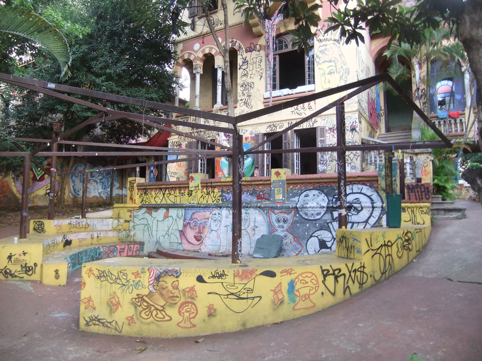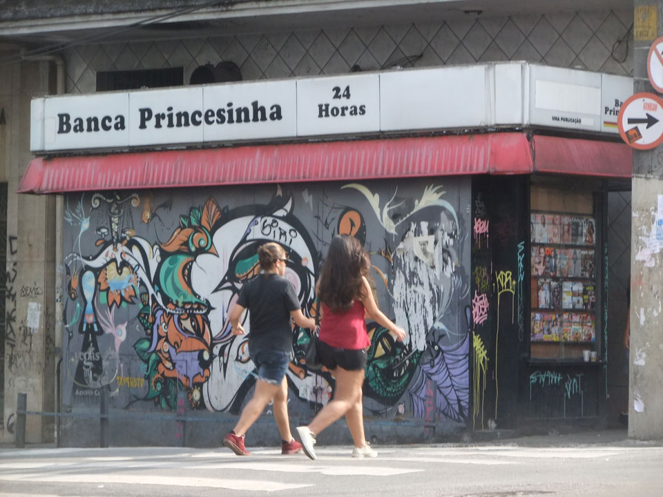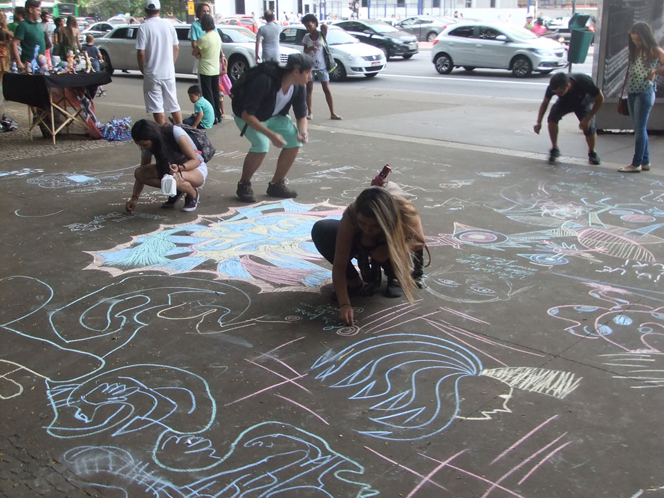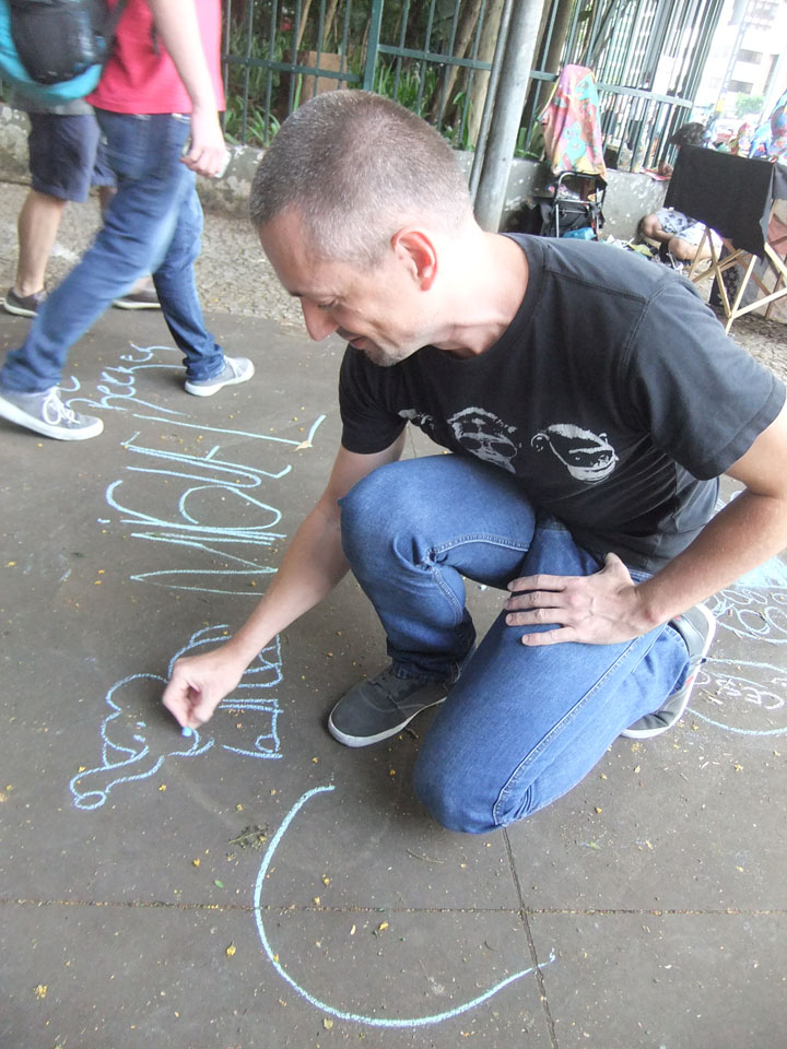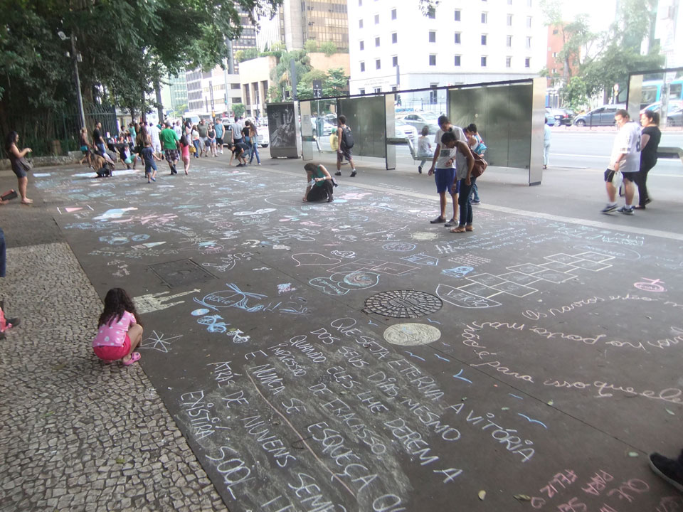 Ich hatte zum Glück Consolação statt Paraiso als Metro Treffpunkt ausgemacht. Wir gingen schnurstraks zur Bibliothek, die ich noch nie sah. Echt cool auch jetzt am Samstag saßen da überall Leute. Dann weiter runter zum Park, der gerade geschlossen wurde. Ein kleines Kreidebild – Elefant, weil sie im Zirkus arbeitete und dann weiter runter zum Republika.