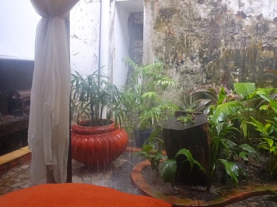 Das Frühstück um 9 war etwas mau aber ich hatte wenigstens was im Magen. Nochmal in die Heija bis nach 11, dann auschecken und Sachen verstauen. Es nieselte und ich legte mich in den Hof auf eine schön überdachte Liege. Dann goss es in Strömen. ein richtiger Wolkenbruch.