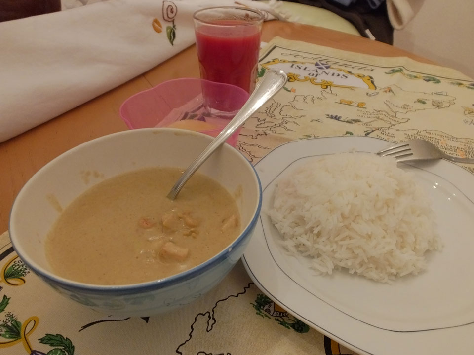 Ich kochte mit Flusskrebsen und Hühnchen ein Grünes Curry. Dieses Mal nahm ich viel Paste und Kokosmilch und das Ergebnis war exzellent.