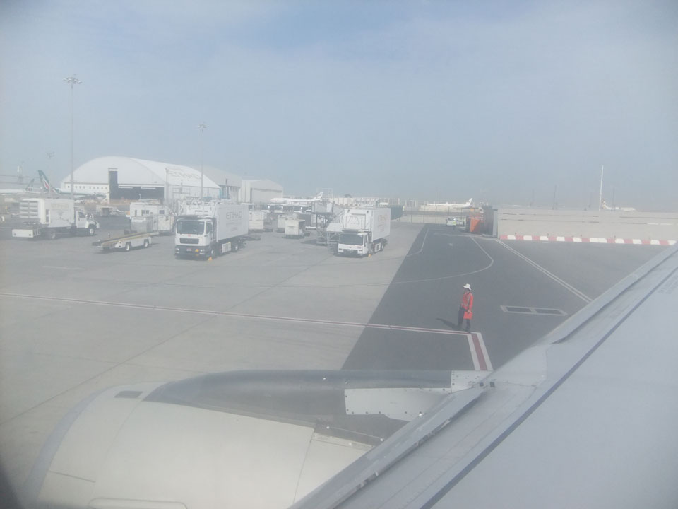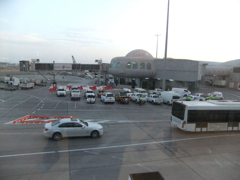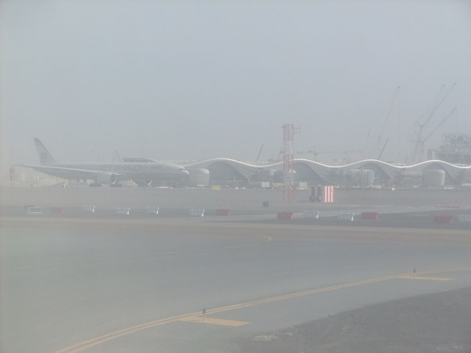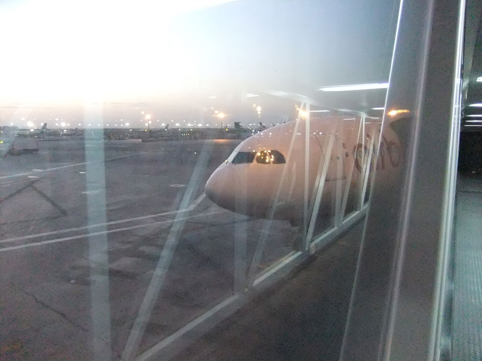 Anflug auf Abu Dhabi im Morgengrauen. Es ging gleich zu den internationalen Transfers – ein schönes Stückchen Fußmarsch. Sonnenaufgang und Müdigkeit meinerseits.