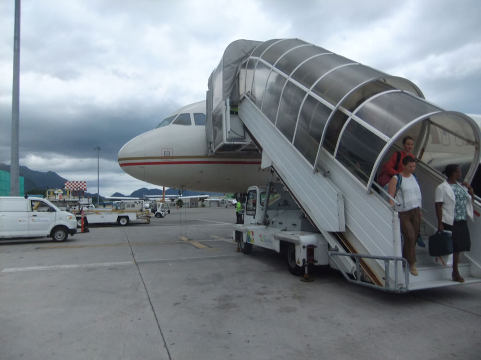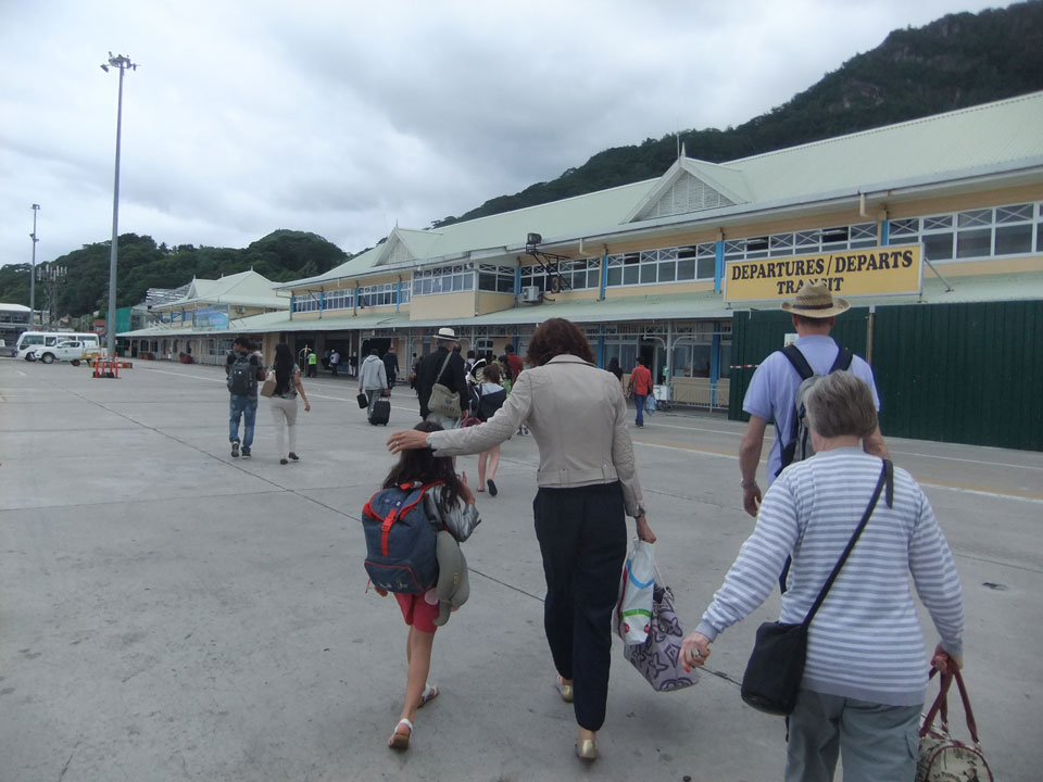 So war ich schließlich und endlich auf den Seychellen! Fantastisch! Der kleine Flughafen machte kaum den „internationalen“ Eindruck. Ich ging durch die Passkontrolle und zum Transferschalter, um mein Weiterflugticket zu bekommen. Dort sagte man mir, dass mein Gepäck wohl über Nacht doch nicht auf dem Flughafen bleiben kann. Ich sollte es mitnehmen. Nach einigem Hin nd Her ging ich zurück durch die Sicherheitskontrolle aber es hatte sich nun doch geändert – mein großer Rucksack blieb dort.
