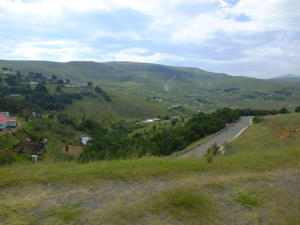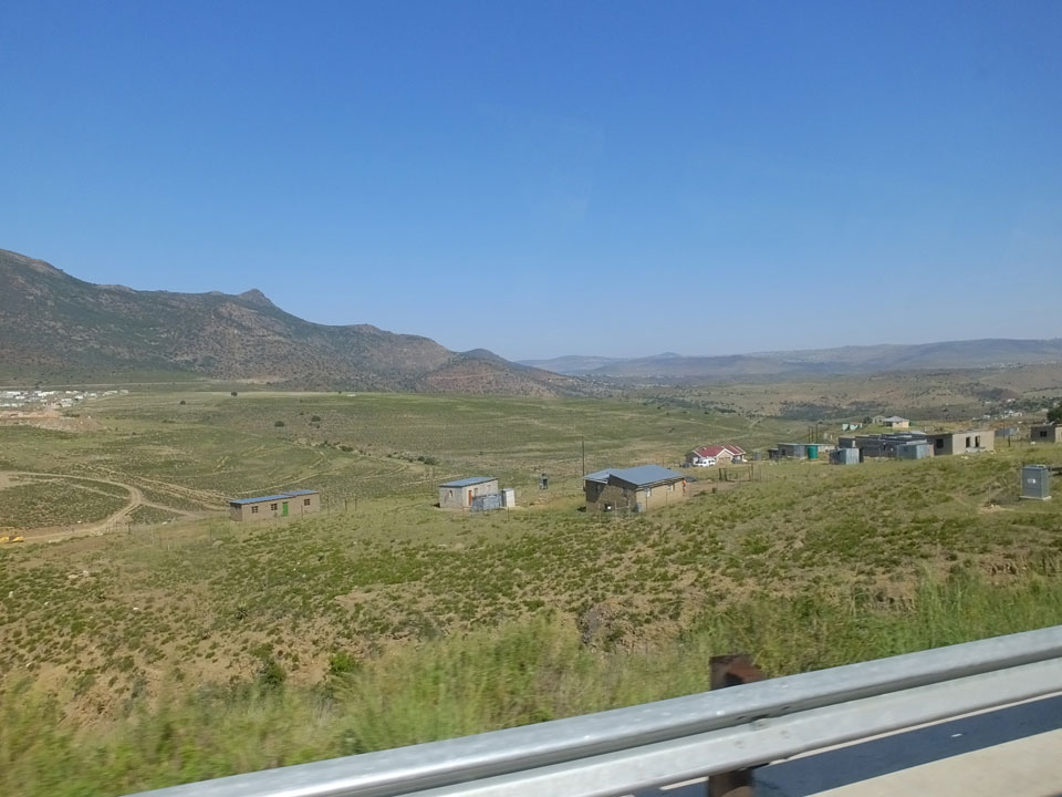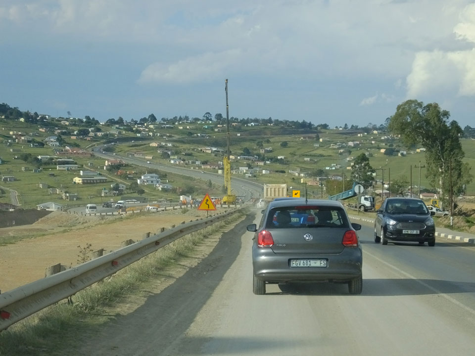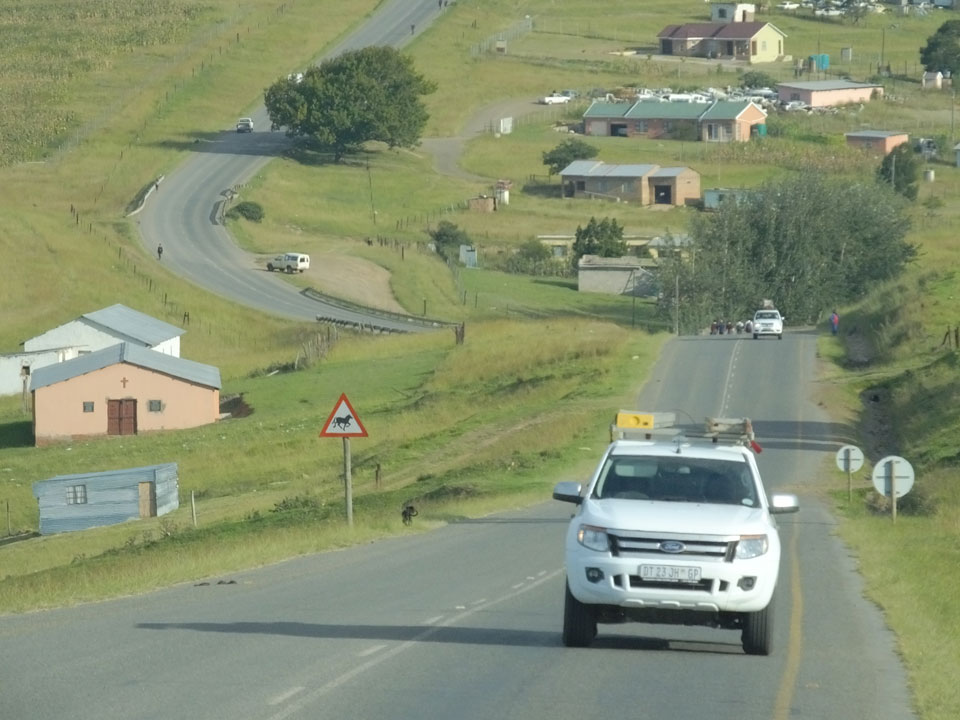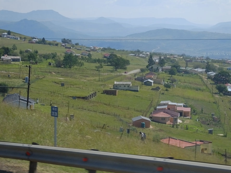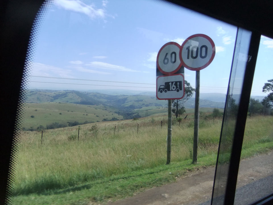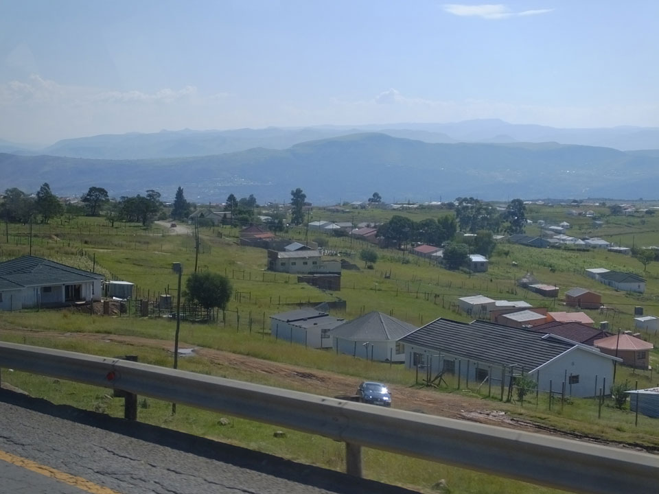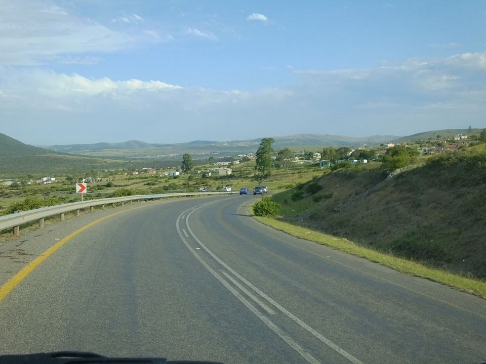 Die gute Aussicht auf die Straße nutzte ich mit der Camera. Wir mussten eine ganz andere Route durch die Berge fahren, weil es Straßenblockaden gibt und man da nicht durch kommt. Proteste bringen den Verkehr zu erliegen. So dauerte die Fahrt einige Stunden mehr, als gedacht. Man sah hier mal richtig das südafrikanische Dorfleben. Die Schüler sehen fein herausgeputzt aus und wandern wohl Kilometer von der Schule nach Hause. In einigen heruntergekommenen Pickups stapeln sich die Leute. Manch einer winkte und auch eine Junge fuhr außerhalb des Pickups mit.