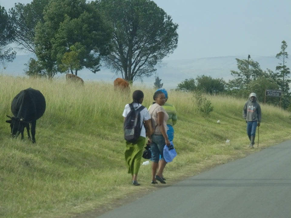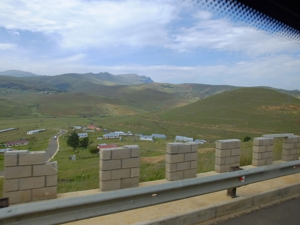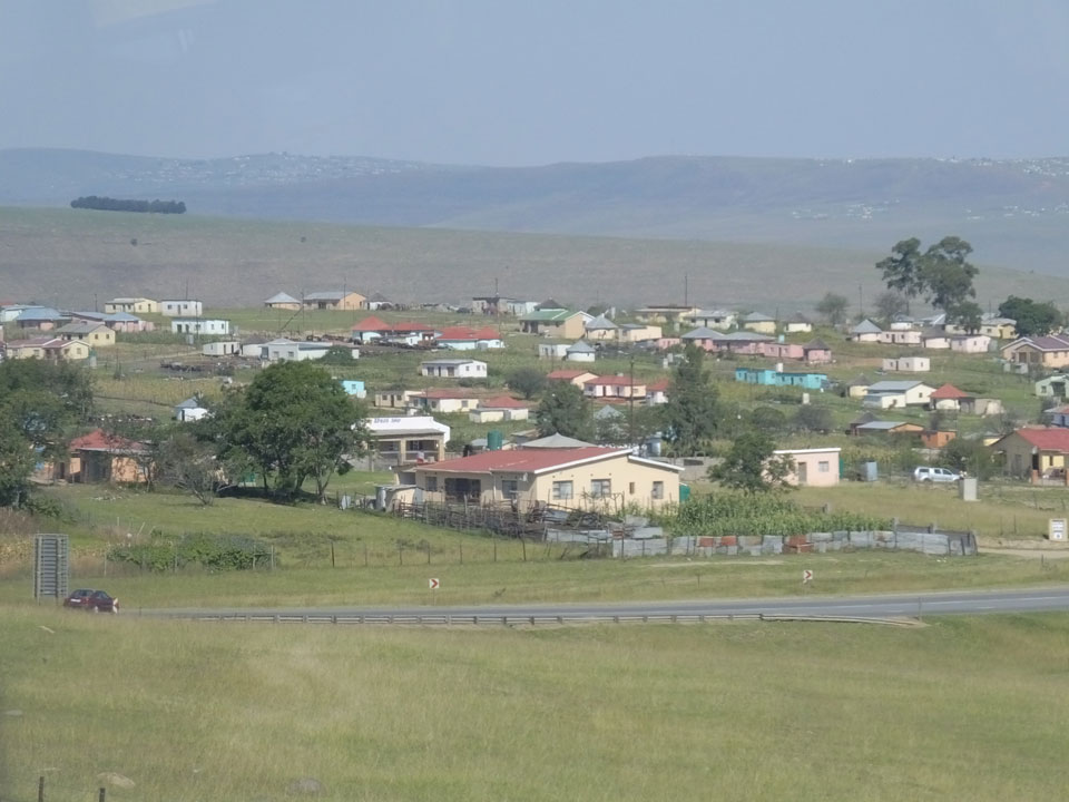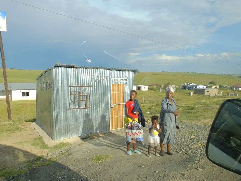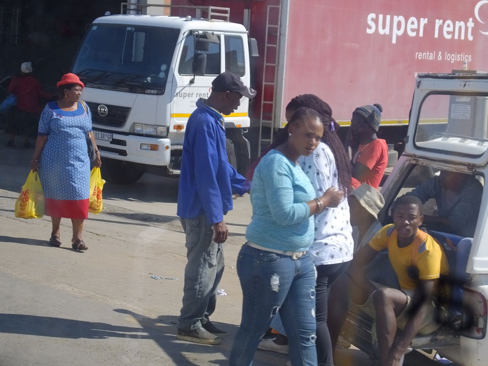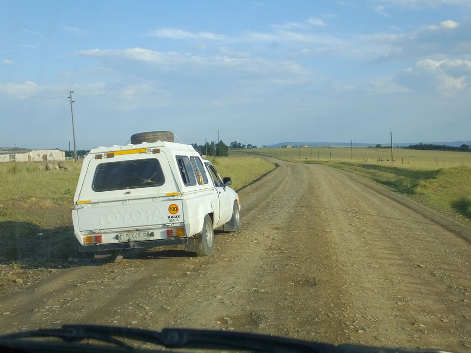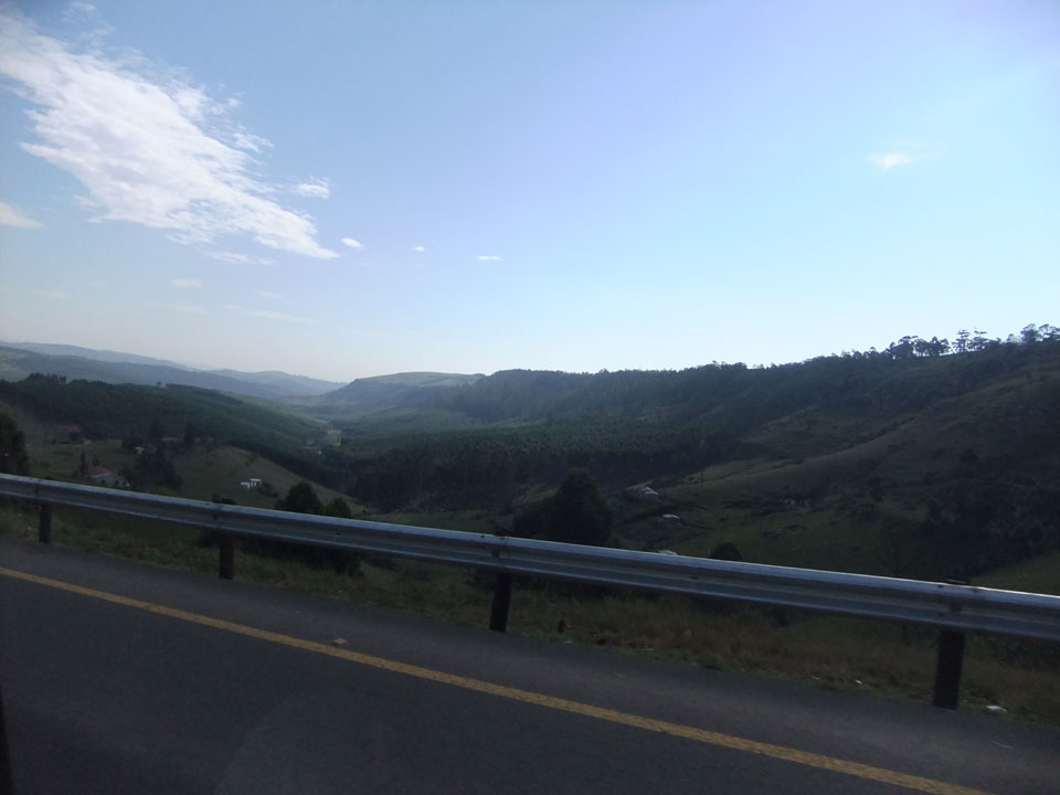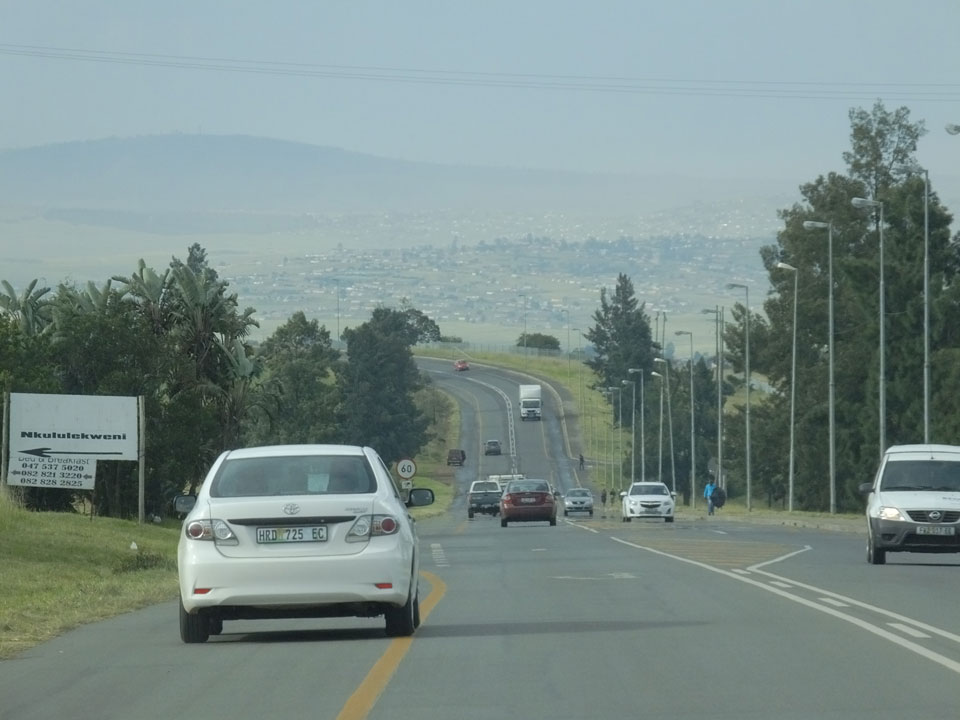 Die gute Aussicht auf die Straße nutzte ich mit der Camera. Wir mussten eine ganz andere Route durch die Berge fahren, weil es Straßenblockaden gibt und man da nicht durch kommt. Proteste bringen den Verkehr zu erliegen. So dauerte die Fahrt einige Stunden mehr, als gedacht. Man sah hier mal richtig das südafrikanische Dorfleben. Die Schüler sehen fein herausgeputzt aus und wandern wohl Kilometer von der Schule nach Hause. In einigen heruntergekommenen Pickups stapeln sich die Leute. Manch einer winkte und auch eine Junge fuhr außerhalb des Pickups mit.