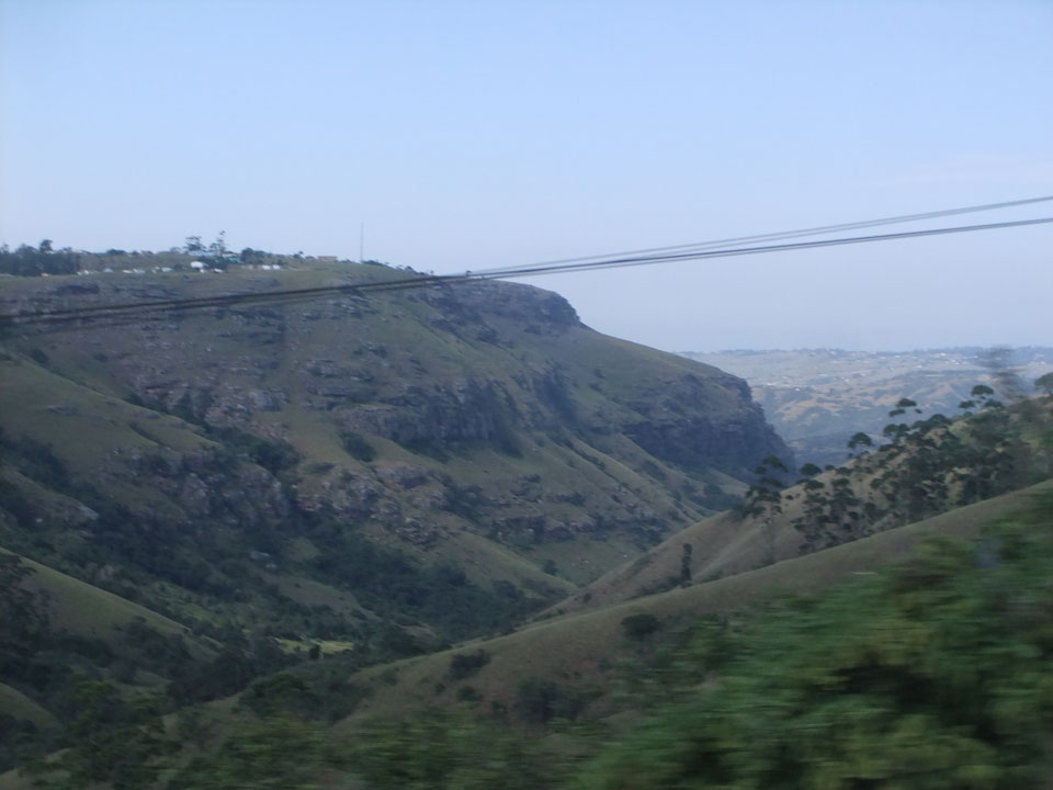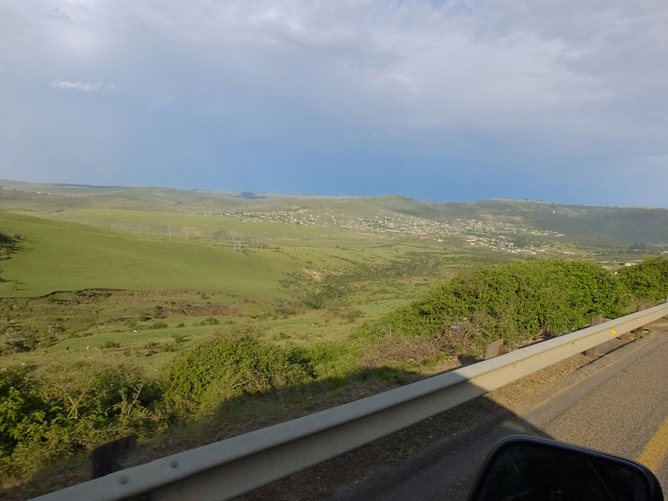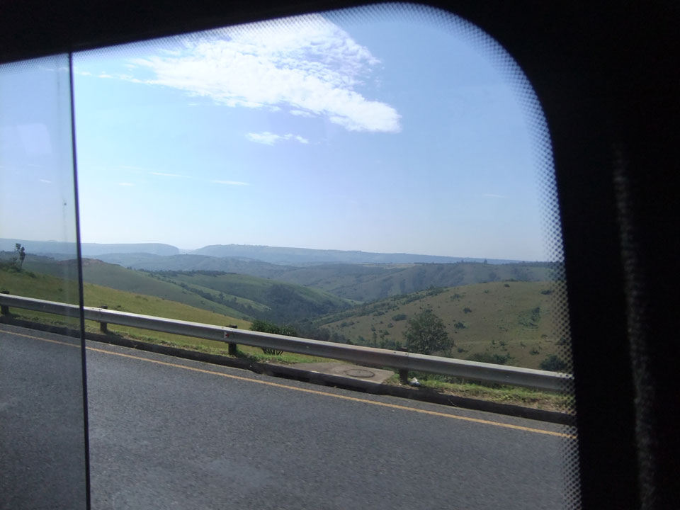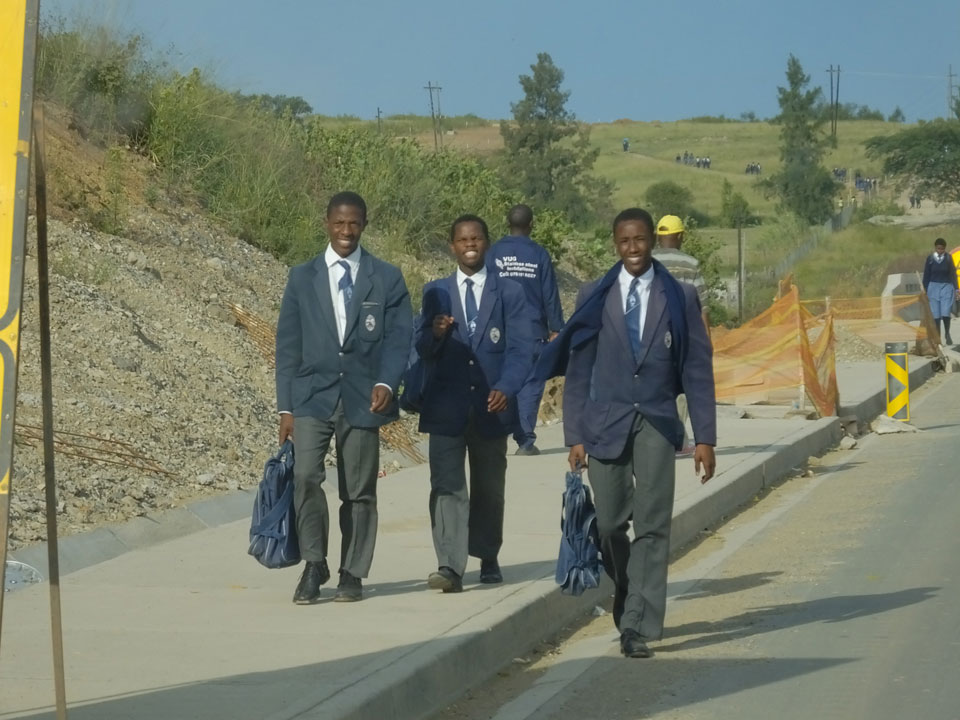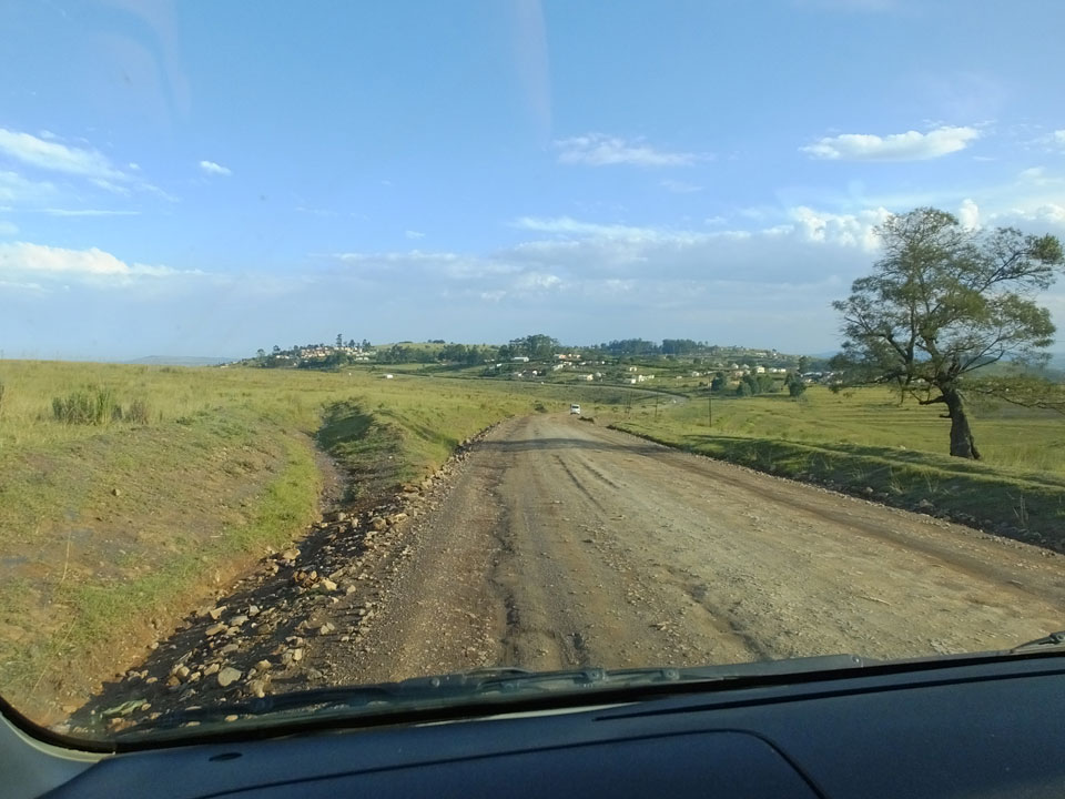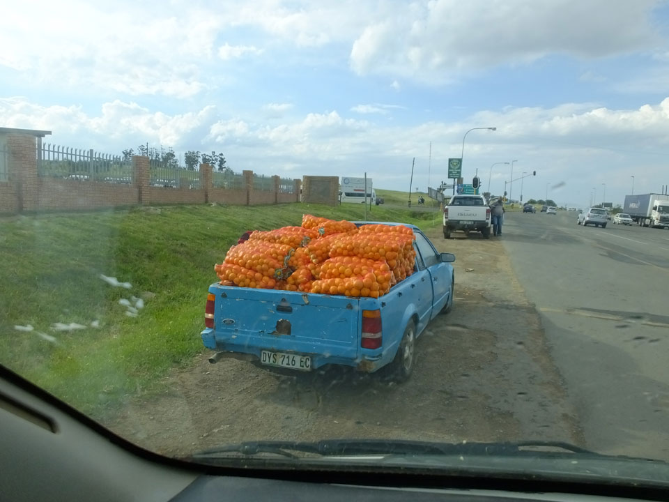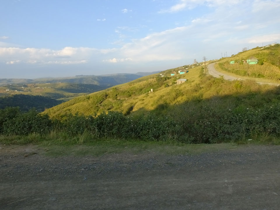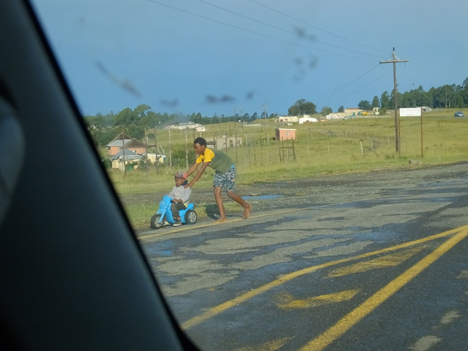 Die gute Aussicht auf die Straße nutzte ich mit der Camera. Wir mussten eine ganz andere Route durch die Berge fahren, weil es Straßenblockaden gibt und man da nicht durch kommt. Proteste bringen den Verkehr zu erliegen. So dauerte die Fahrt einige Stunden mehr, als gedacht. Man sah hier mal richtig das südafrikanische Dorfleben. Die Schüler sehen fein herausgeputzt aus und wandern wohl Kilometer von der Schule nach Hause. In einigen heruntergekommenen Pickups stapeln sich die Leute. Manch einer winkte und auch eine Junge fuhr außerhalb des Pickups mit.