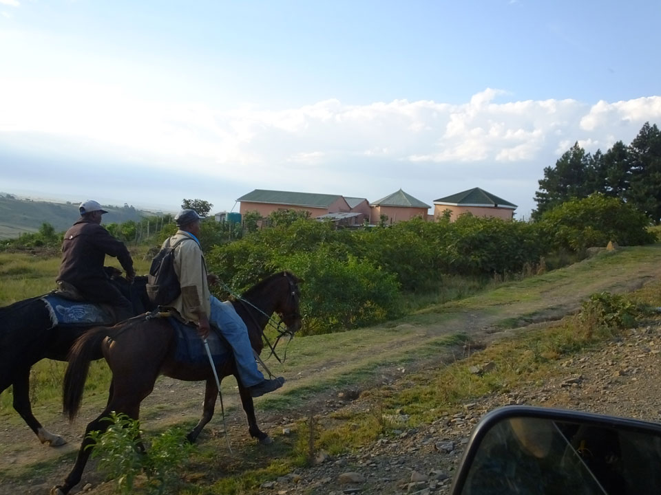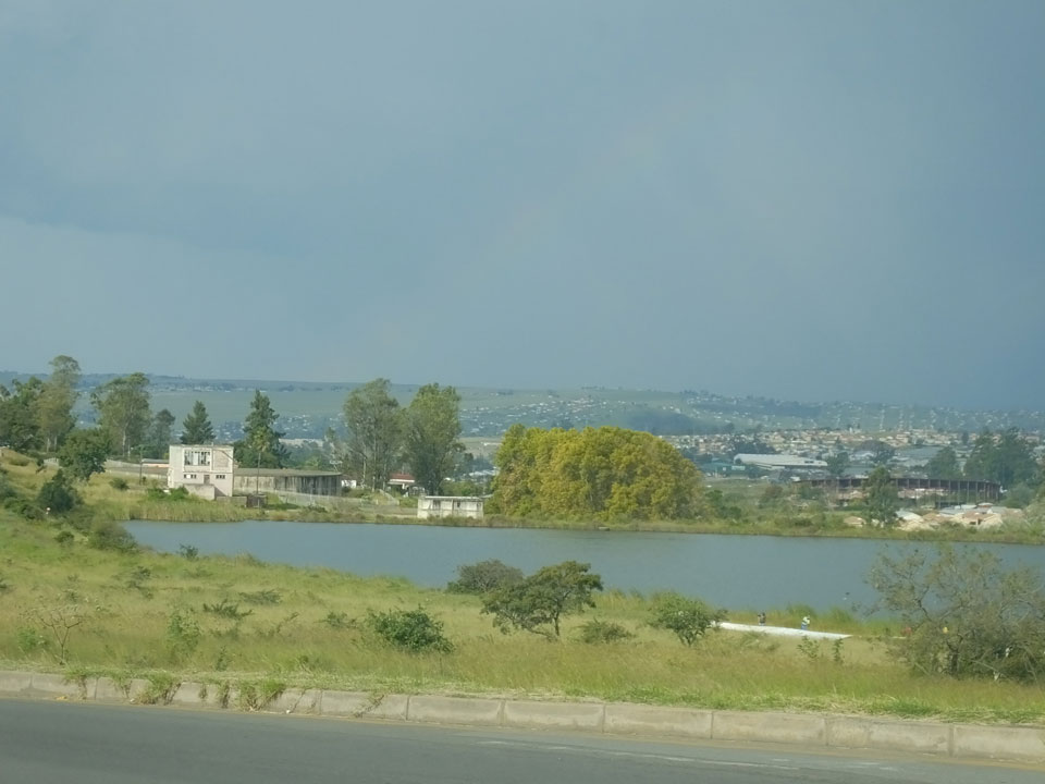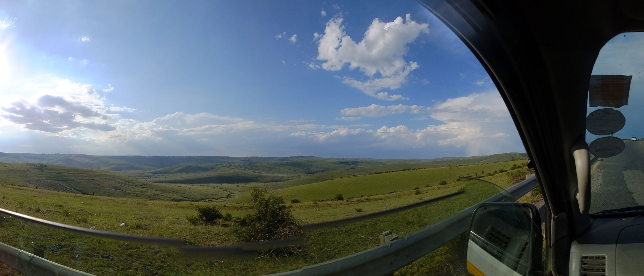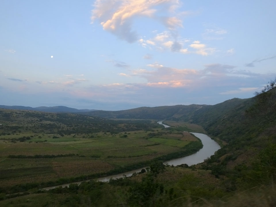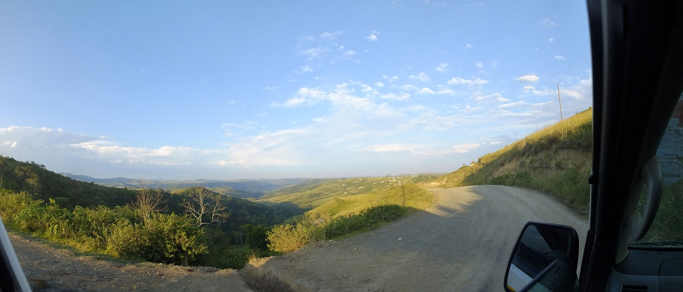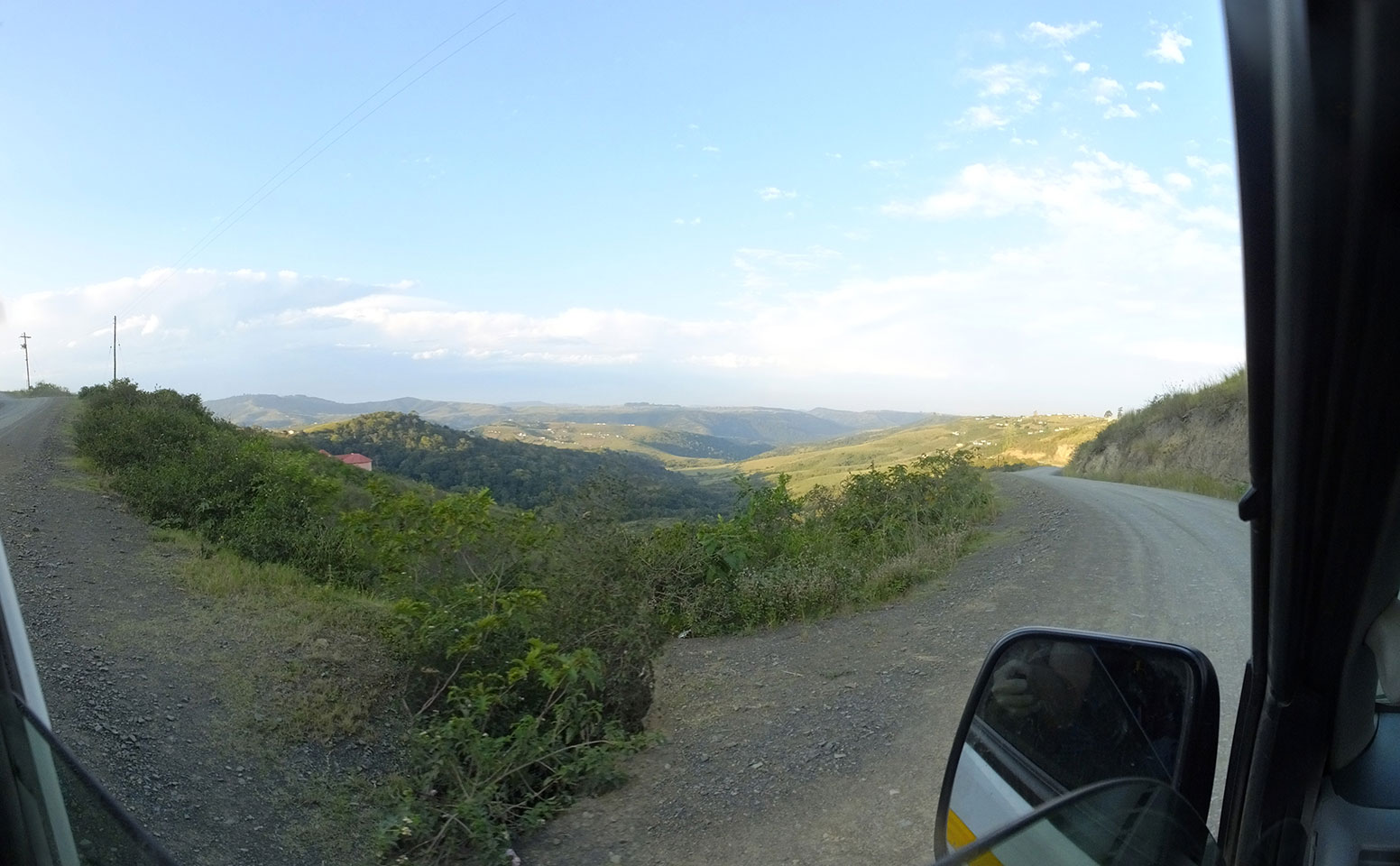 Die gute Aussicht auf die Straße nutzte ich mit der Camera. Wir mussten eine ganz andere Route durch die Berge fahren, weil es Straßenblockaden gibt und man da nicht durch kommt. Proteste bringen den Verkehr zu erliegen. So dauerte die Fahrt einige Stunden mehr, als gedacht. Man sah hier mal richtig das südafrikanische Dorfleben. Die Schüler sehen fein herausgeputzt aus und wandern wohl Kilometer von der Schule nach Hause. In einigen heruntergekommenen Pickups stapeln sich die Leute. Manch einer winkte und auch eine Junge fuhr außerhalb des Pickups mit.