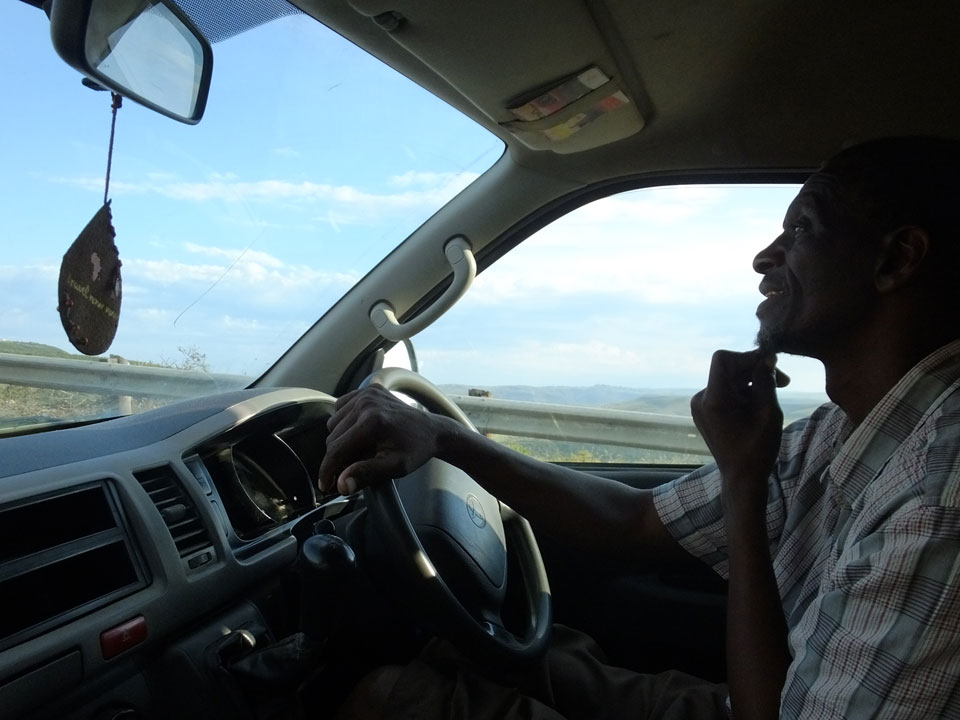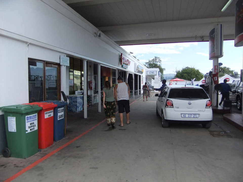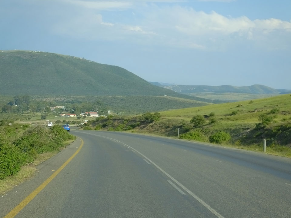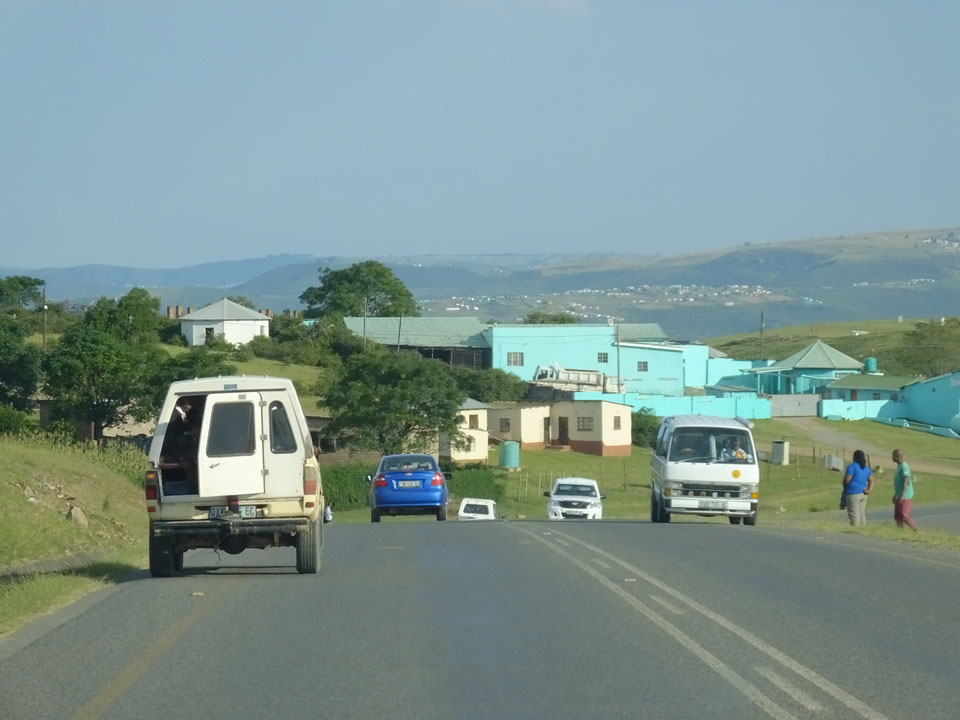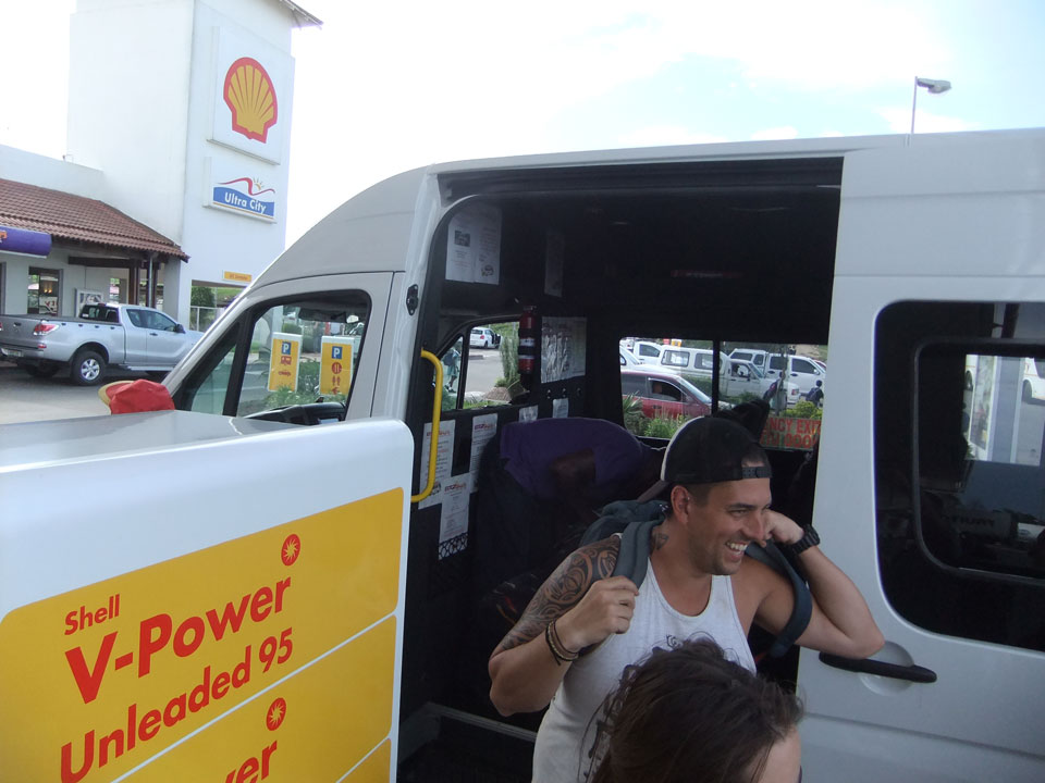 Wir machten wieder an der Shell Tanke Halt, wo die Busse Passagiere austauschen. Es dauerte eine Weile, bis der Minibus aus Coffee Bay auftauchte. Beim Aufzählen der Namen, fehlte meiner. Ich hatte halt nicht gebucht und jetzt war der 8er Bus mit 10 Leuten + Fahrer etwas überbelegt. Schließlich entschied sich der Fahrer, den Kofferraum mit den Behelfssitzen zu nutzen und die ganzen Rucksäcke auf die Vorderbank zu verfrachten. So hatte jeder Platz und ich komischerweise wieder einen super Sitz als Beifahrer.