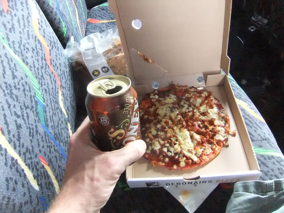 Die Fahrt ging dennoch ganz gut und zügig voran. Mittags machten wir an einer Tanke Rast. Ich hatte erst einen Meat Pie mit Ginger Beer und dann noch eine Pizza, wie der Rest.