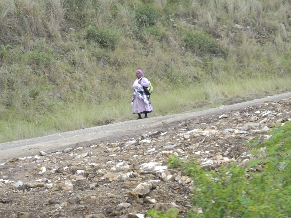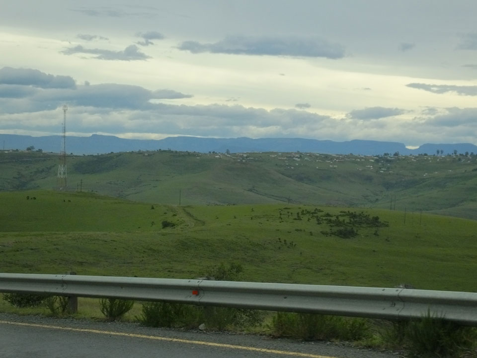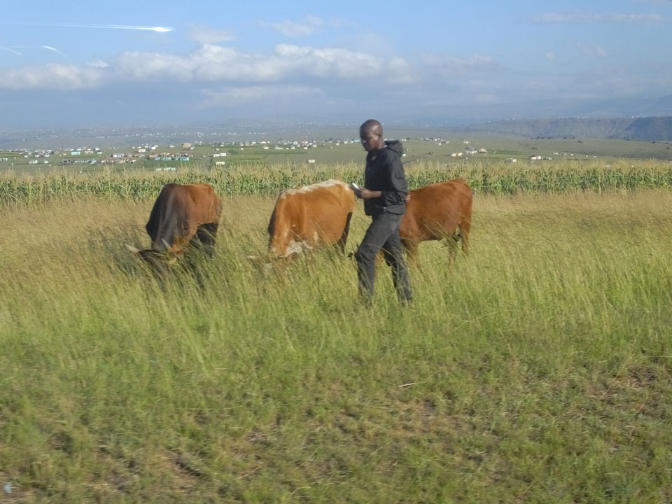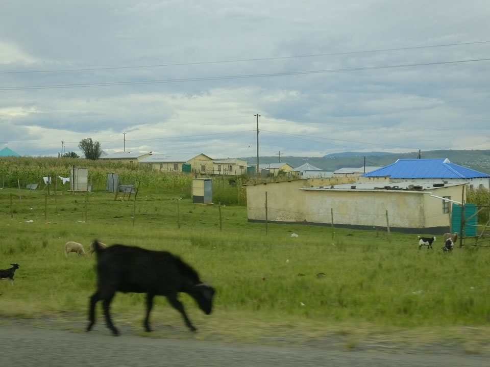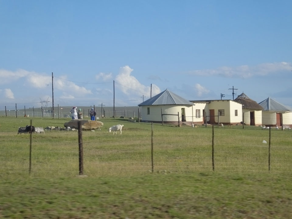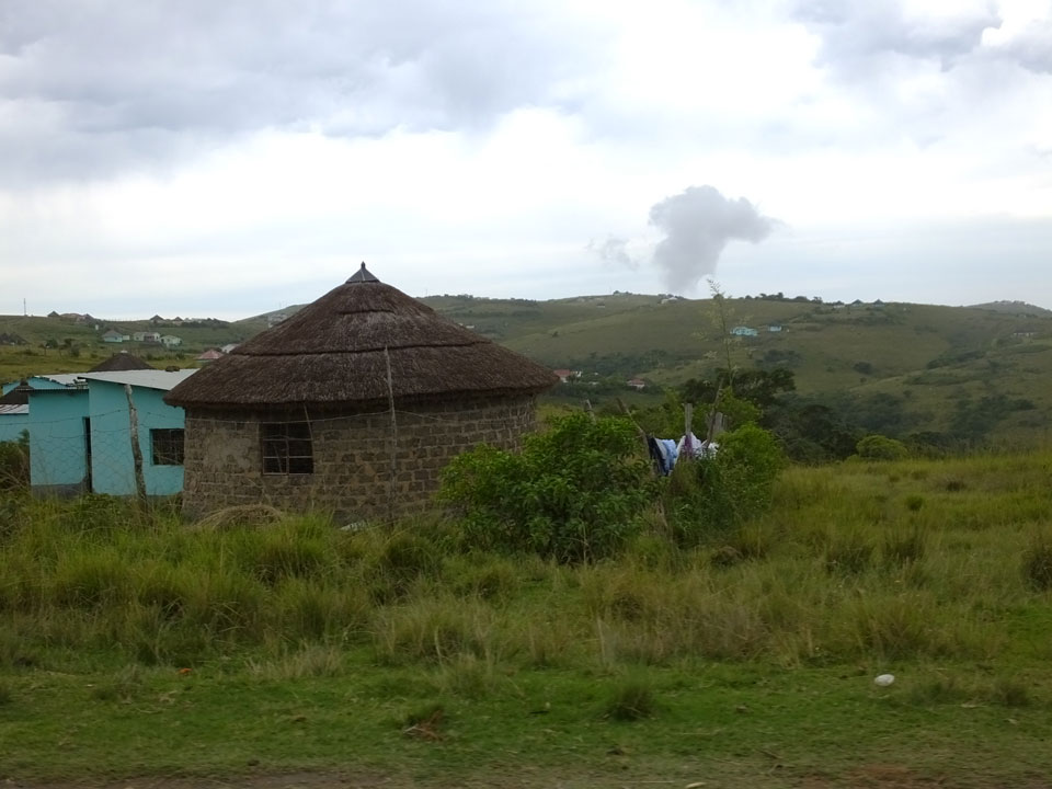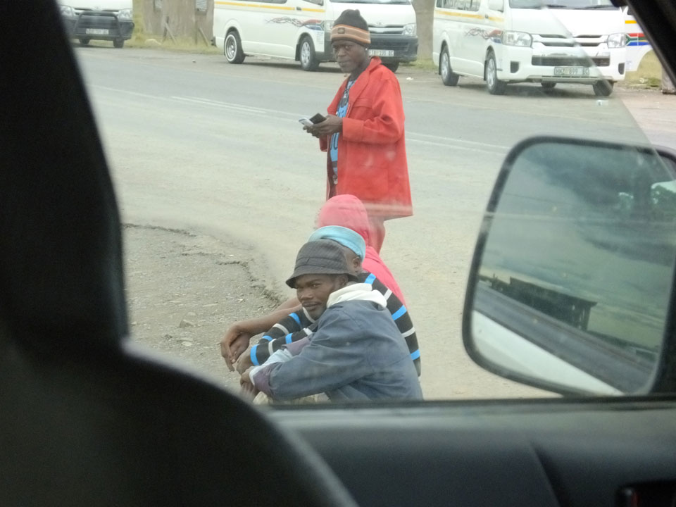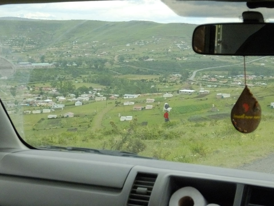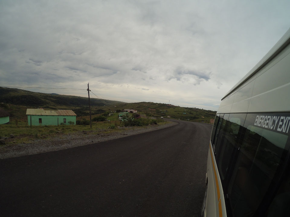Die Köchin kam an und sagte allen sagte allen Wartenden, dass es noch 7 Minuten dauert. Ich denke mal, das Gas war ausgegangen. Die Uhr rückte immer näher auf 11 vor – der Abreise. Wegen Straßenblockaden geht es eine Stunde früher los, doch das Frühstück kam nicht. Schließlich ließ ich es mir „to go“ geben und saß damit im Minibus. Heute nur 3 Passagiere incl. mir. Ein Weißer aus Lesotho, der Zulu sprach. Schon cool, das ganze mal zu sehen – mit Klick und Schmatz-Sounds.