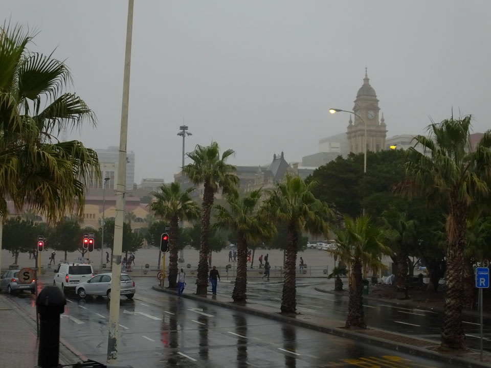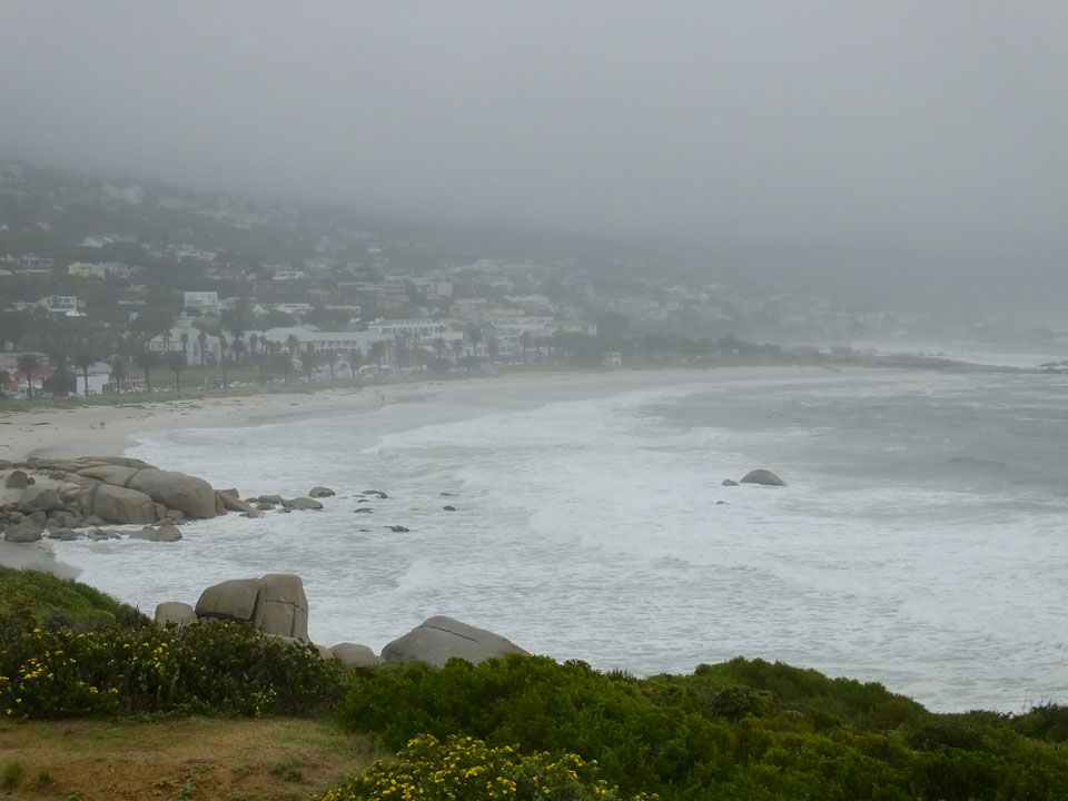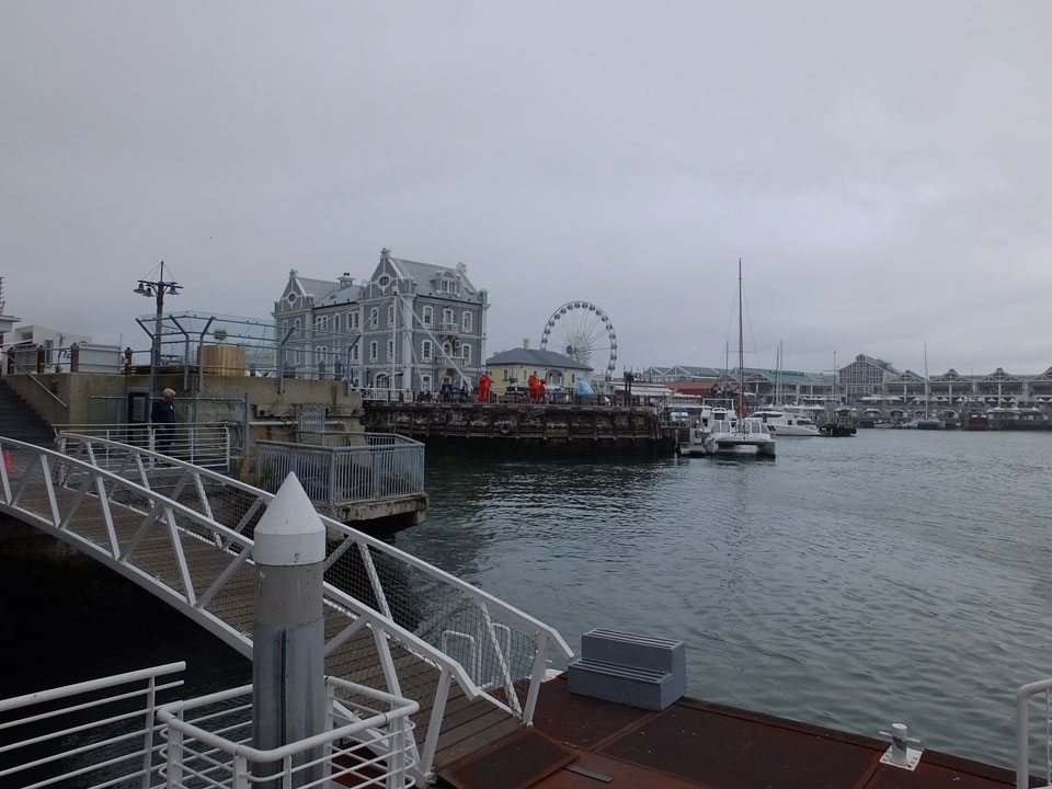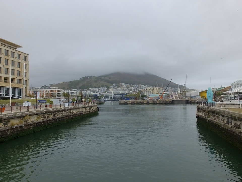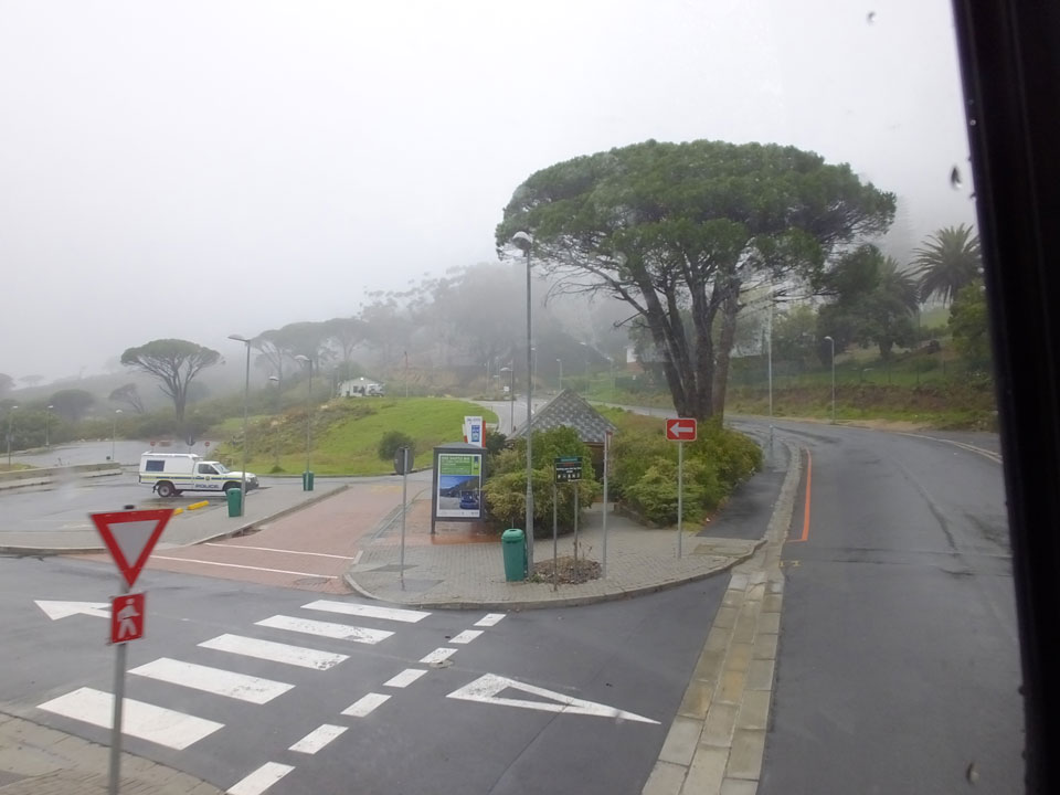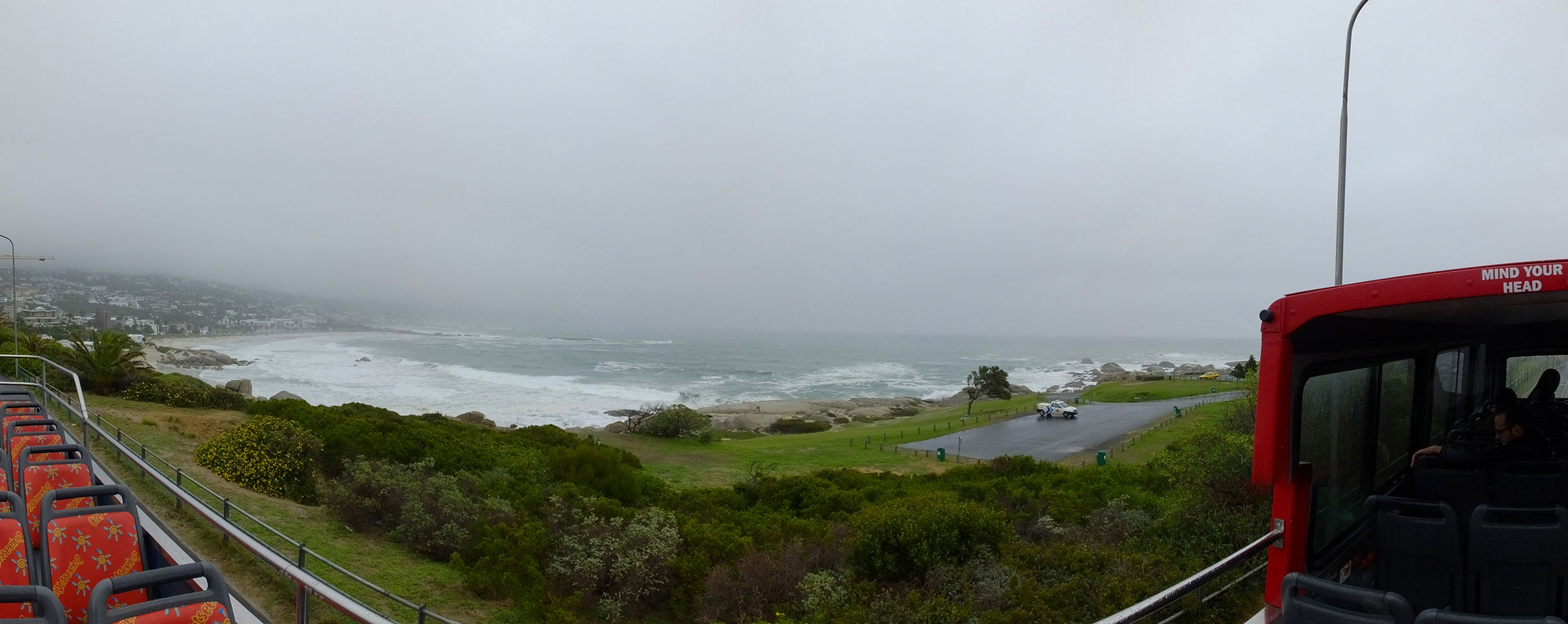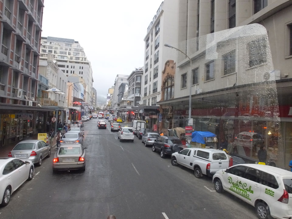 Auf dem Oberdeck waren die ersten Sitzreihen überdacht. Die rote Tour führte am Wasser entlang durch eine echt schöne Gegend mit teuren Häusern. Kapstadt ist auch im Regenwetter wunderbar. Die Wolken hingen tief, sodass man an der Drahtseilbahn hoch zum Tafelberg nichts sah. Sie war auch abgestellt. Ein paar asiatische Touristen kamen dennoch mit Ponchos von einer Wandertour zurück, der Tafelberg war wohl im Programm.