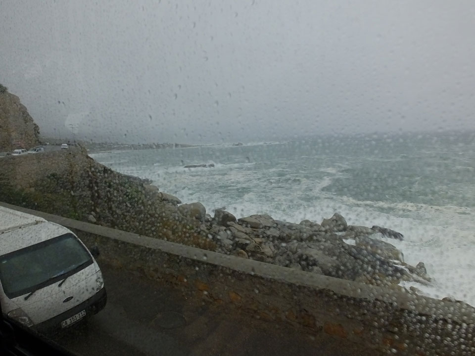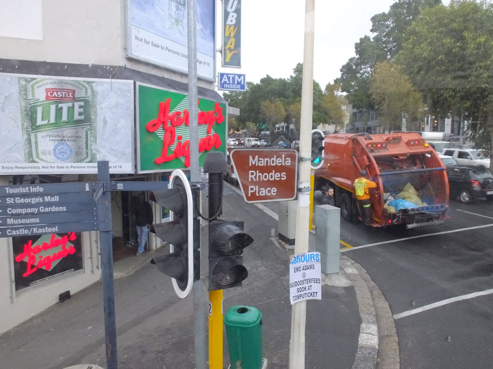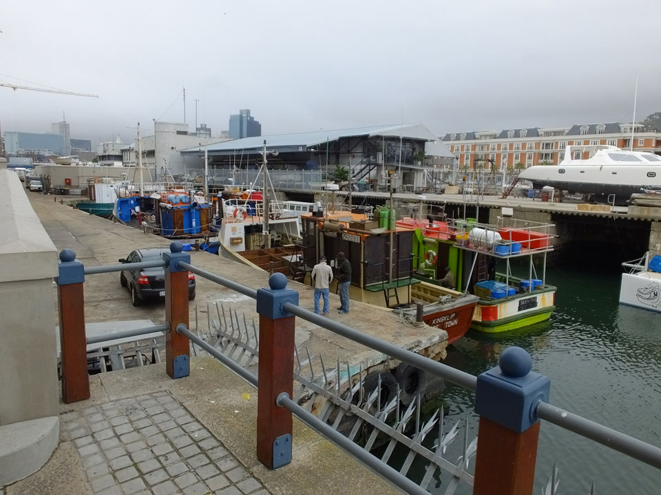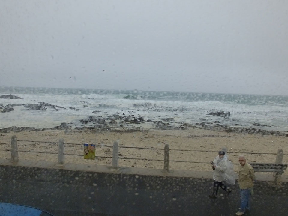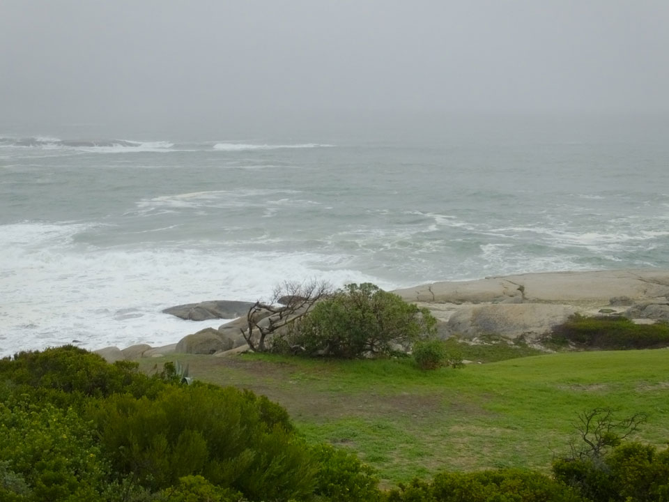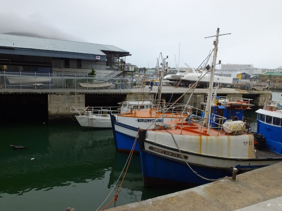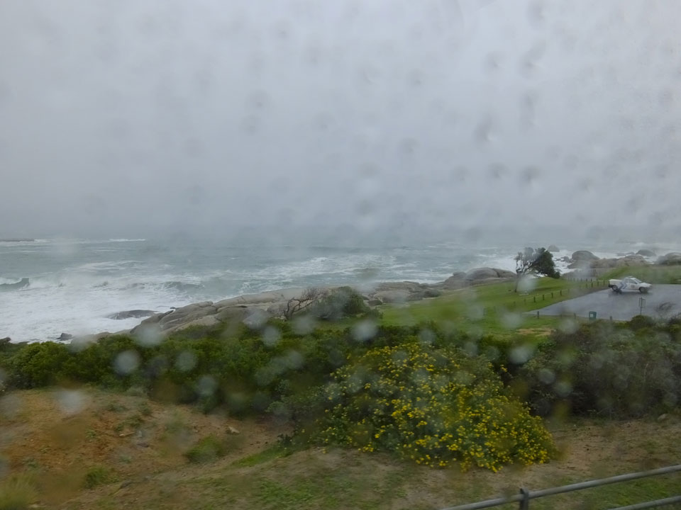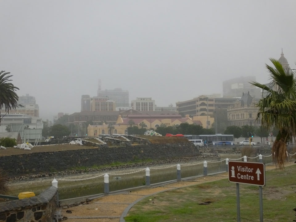 Auf dem Oberdeck waren die ersten Sitzreihen überdacht. Die rote Tour führte am Wasser entlang durch eine echt schöne Gegend mit teuren Häusern. Kapstadt ist auch im Regenwetter wunderbar. Die Wolken hingen tief, sodass man an der Drahtseilbahn hoch zum Tafelberg nichts sah. Sie war auch abgestellt. Ein paar asiatische Touristen kamen dennoch mit Ponchos von einer Wandertour zurück, der Tafelberg war wohl im Programm.