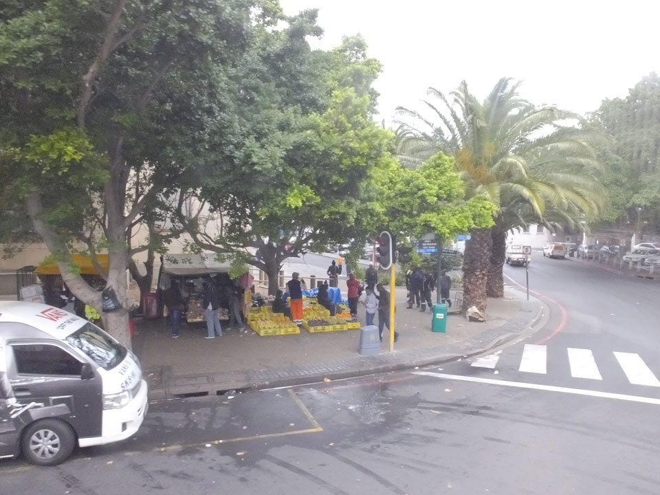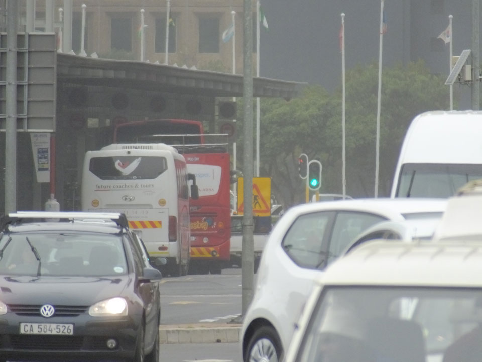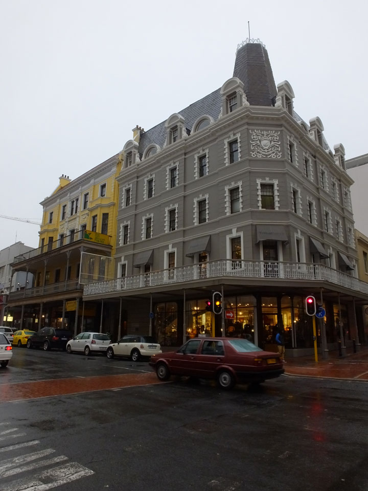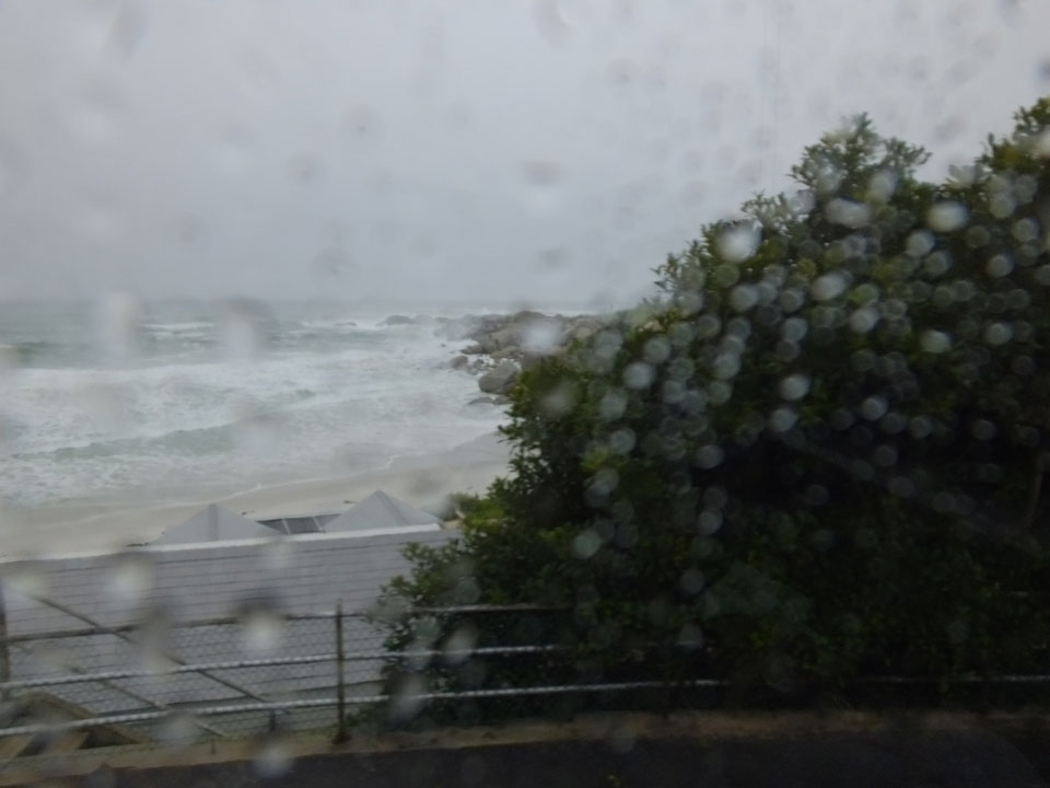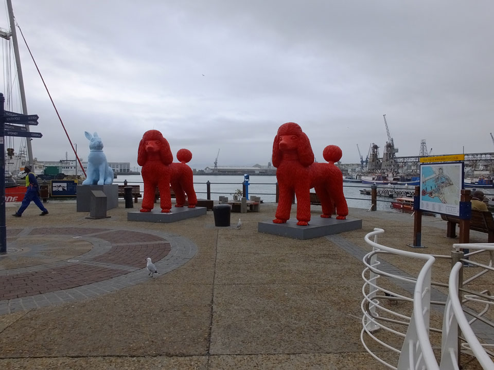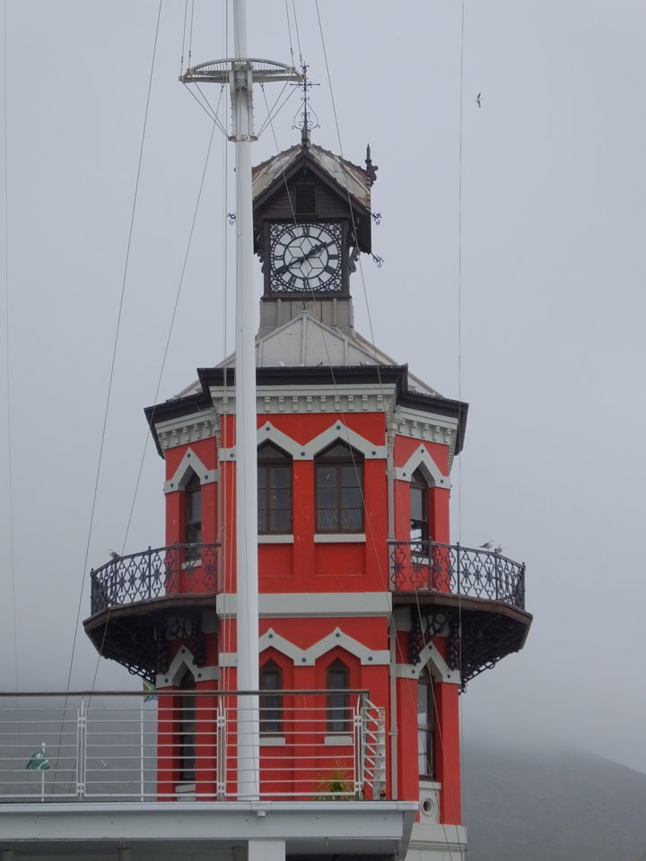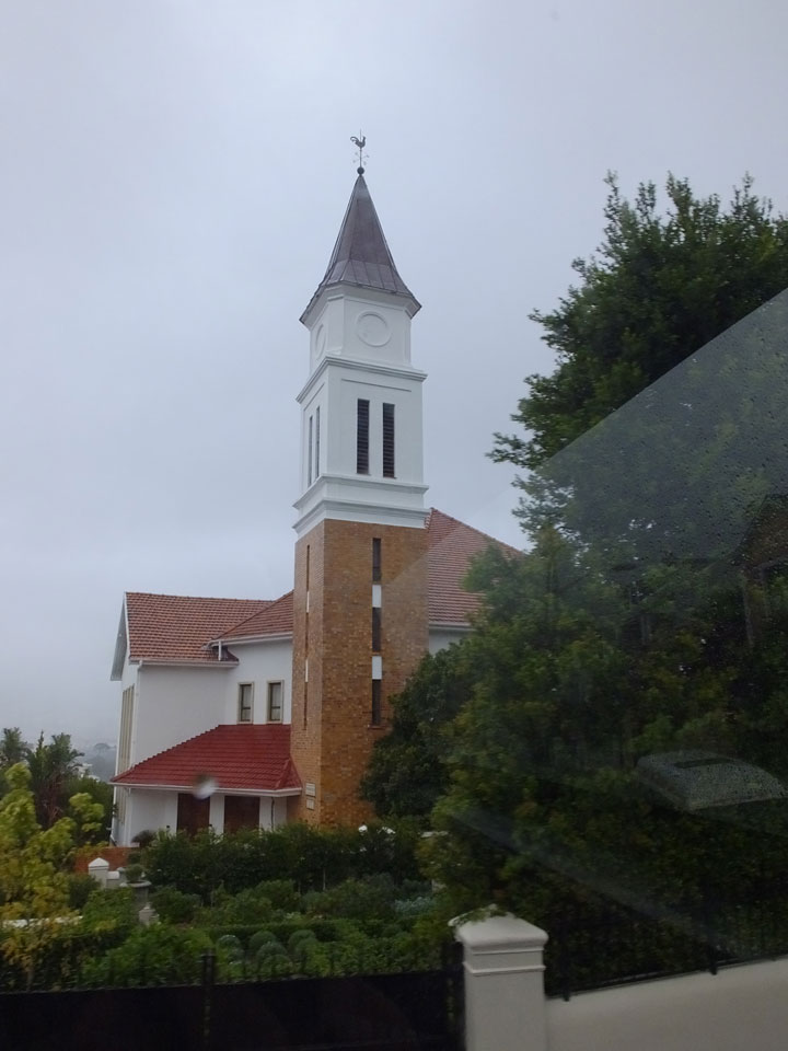 Auf dem Oberdeck waren die ersten Sitzreihen überdacht. Die rote Tour führte am Wasser entlang durch eine echt schöne Gegend mit teuren Häusern. Kapstadt ist auch im Regenwetter wunderbar. Die Wolken hingen tief, sodass man an der Drahtseilbahn hoch zum Tafelberg nichts sah. Sie war auch abgestellt. Ein paar asiatische Touristen kamen dennoch mit Ponchos von einer Wandertour zurück, der Tafelberg war wohl im Programm.
