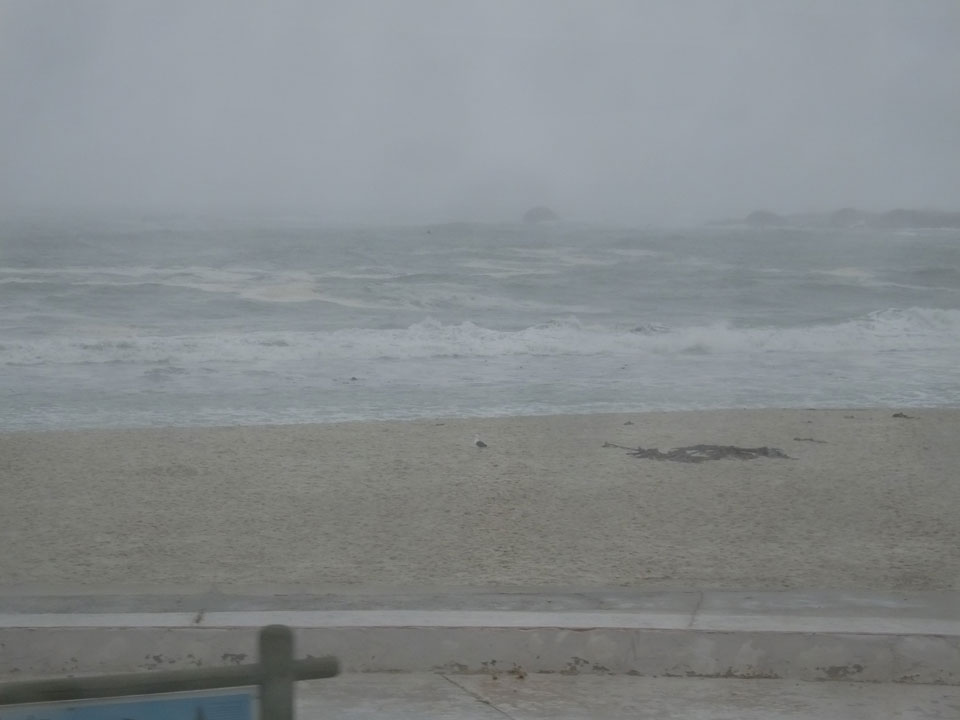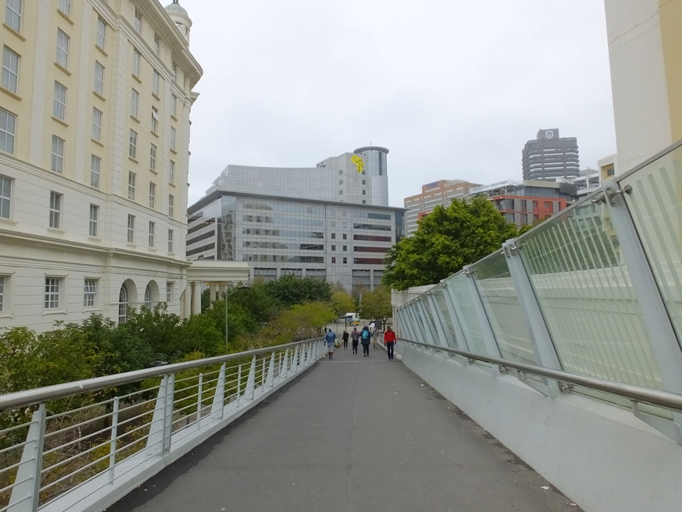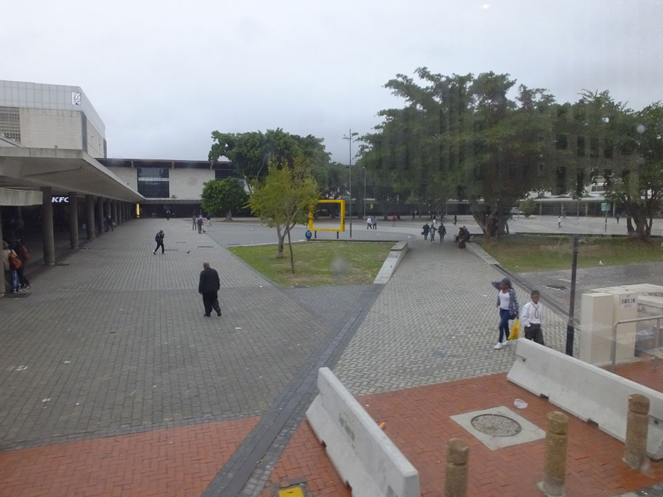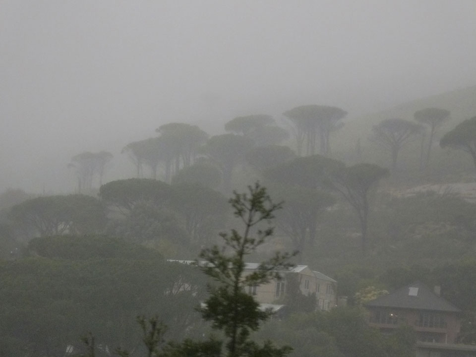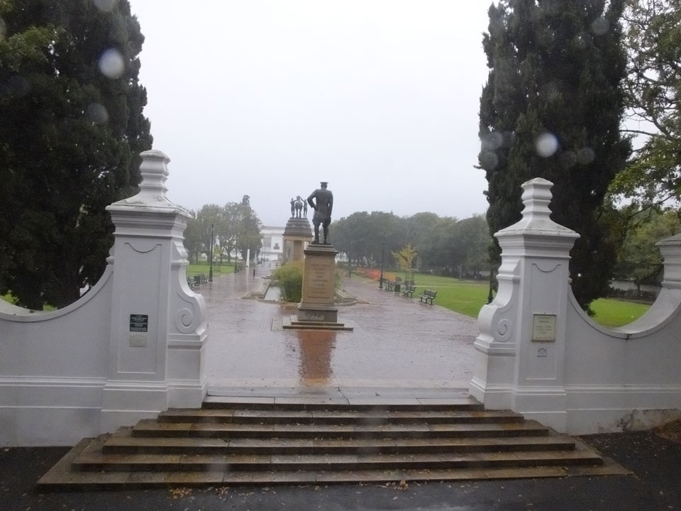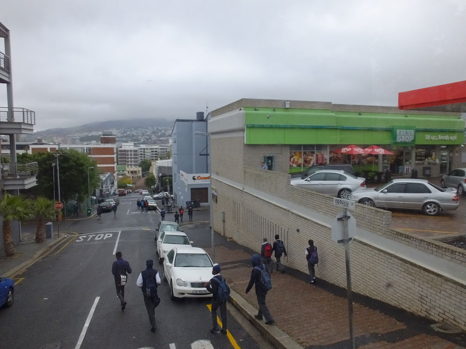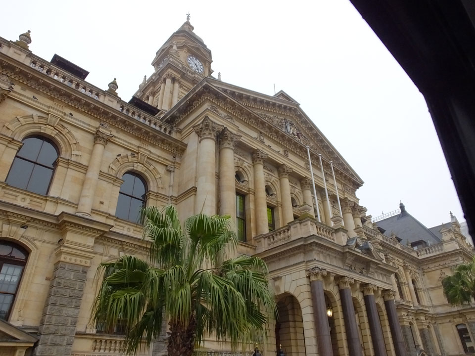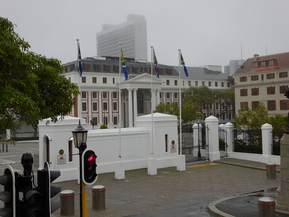 Auf dem Oberdeck waren die ersten Sitzreihen überdacht. Die rote Tour führte am Wasser entlang durch eine echt schöne Gegend mit teuren Häusern. Kapstadt ist auch im Regenwetter wunderbar. Die Wolken hingen tief, sodass man an der Drahtseilbahn hoch zum Tafelberg nichts sah. Sie war auch abgestellt. Ein paar asiatische Touristen kamen dennoch mit Ponchos von einer Wandertour zurück, der Tafelberg war wohl im Programm.