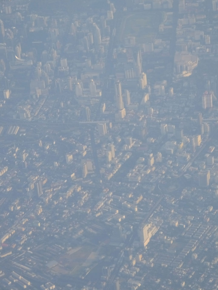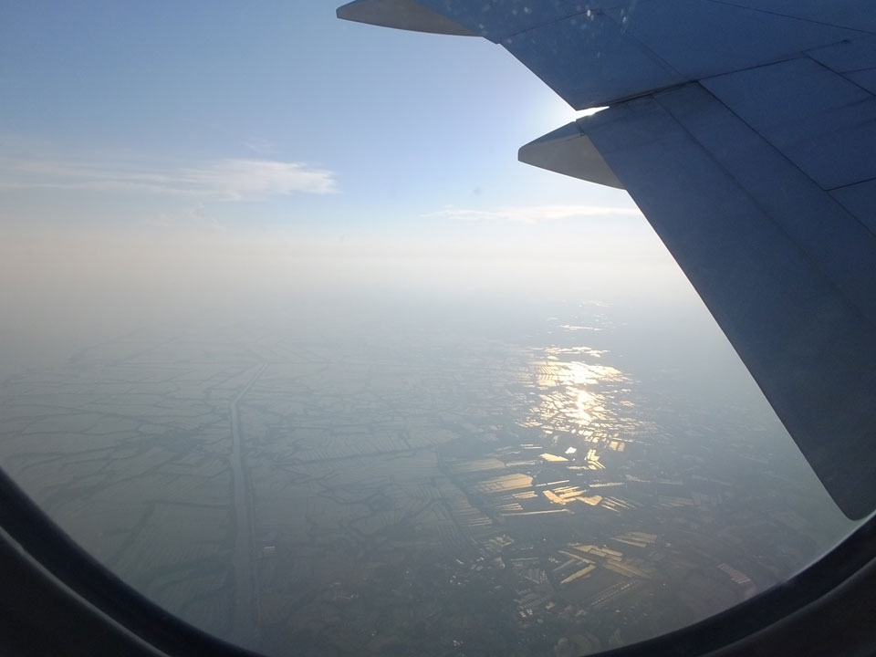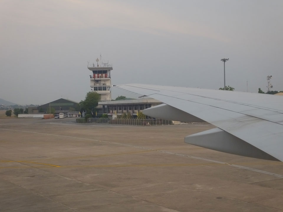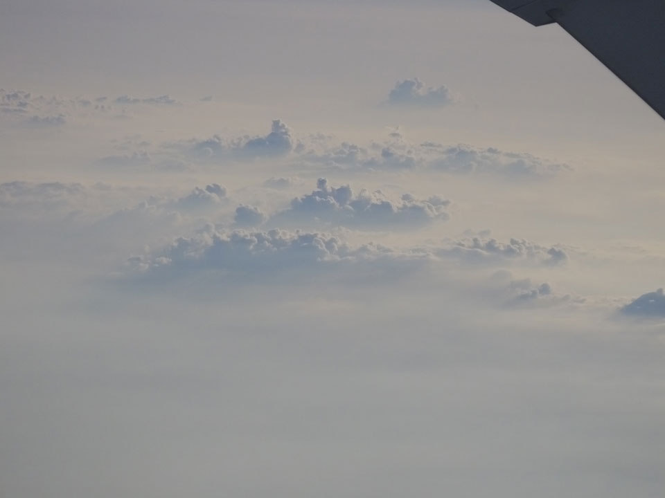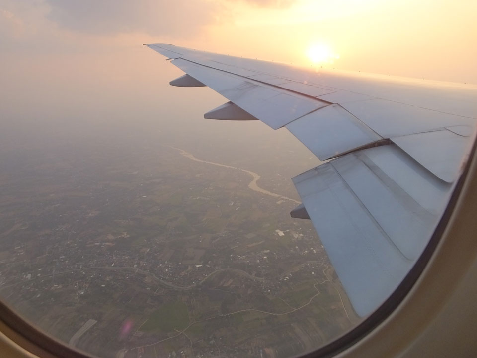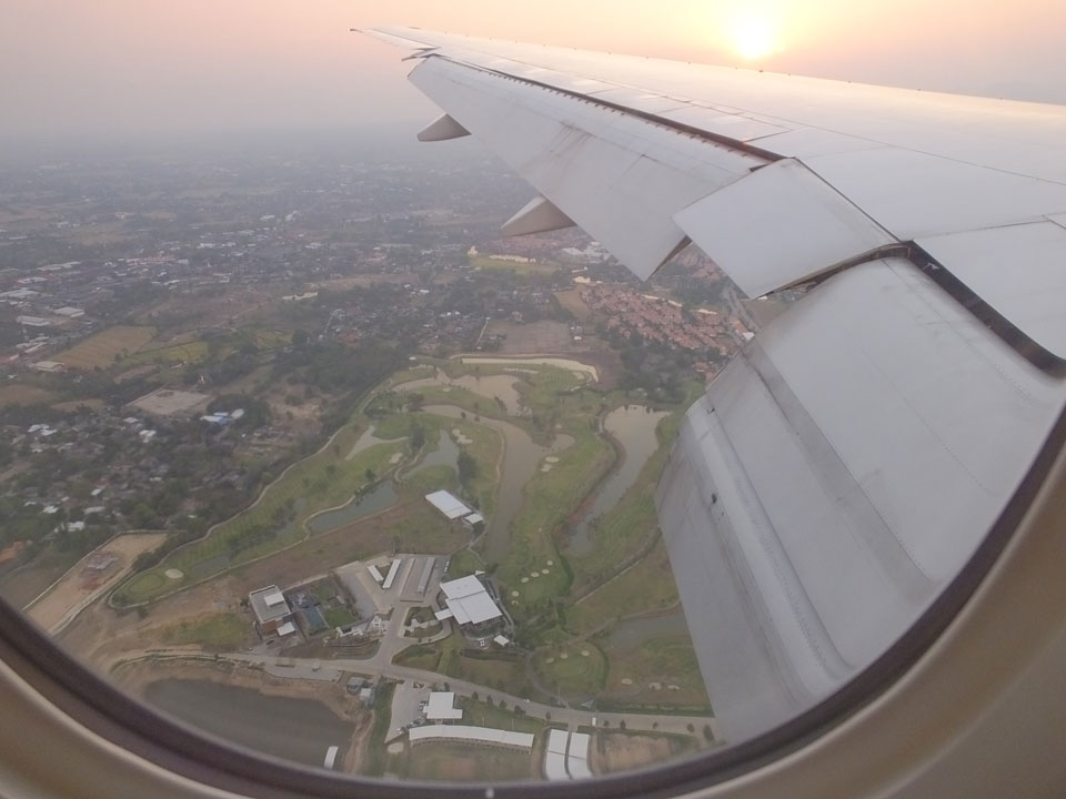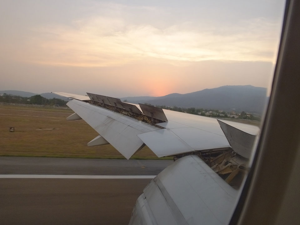 Der Flug war auch angenehm mit Sonne durch die Wolken. Zum Sonnenuntergang in Chiang Mai, dann mit dem Pick up Taxi für 50 THB zum Hotel. Dort will man direkt einen Van für mich nach Pai bestellen – 160 THB soll das nur kosten. Das Zimmer viel besser als in Bangkok. Hier oben im Norden ist eben alles nochmal biliger.
