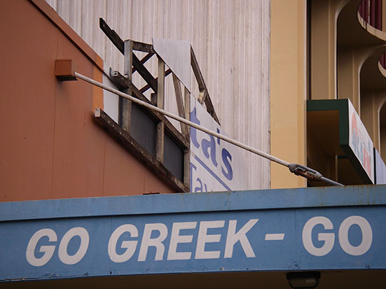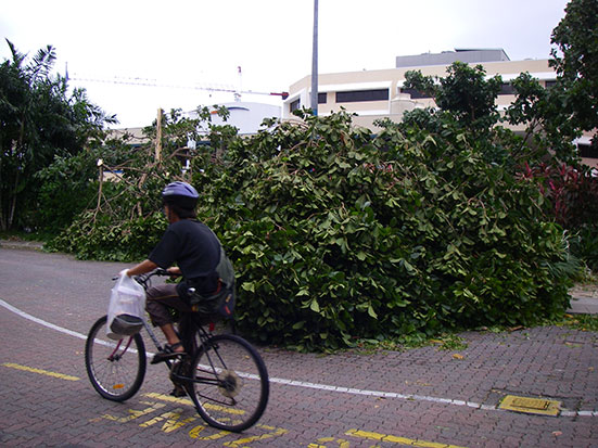 Erst um 16:45 machte ich mit dem Amerikaner nochmal los. Er wollte seinen iPod in einem Mac Laden fixen lassen. Draussen wurde das Ausmaß des Sturms auf einmal viel klarer. Schilder und Leuchtreklame hingen halbzerstört herum. Viele Bäume verloren Äste, Laub bedeckte die Straßen.