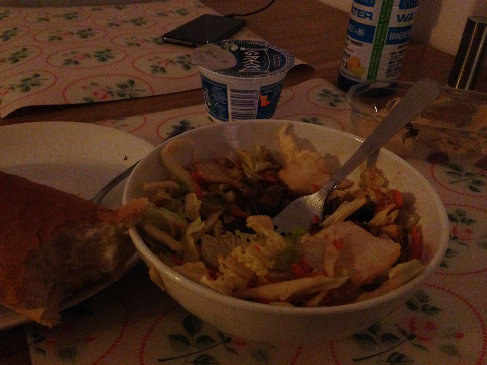 Das gleiche Abendessen dann aus dem Zabka – Salat, Sandwich und heute noch einen Joghurt hinterher. Ich lebe recht gesund und kann die aufziehende Erkältung wohl in Schach halten. Nur sind die Zweifel dumm, ob ich ich hier wirklich 2 Monate bleiben will.