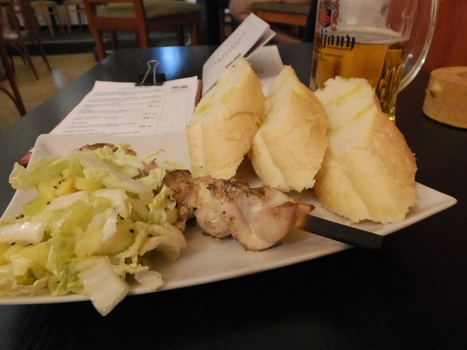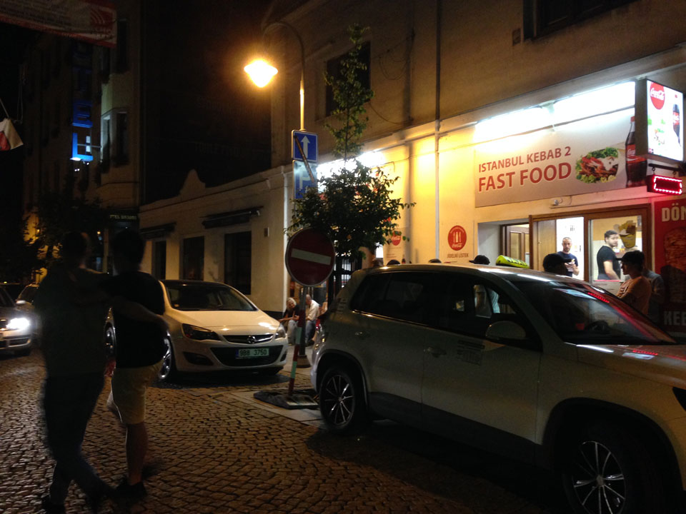 Mit der Dunkelheit richtete ich meinen Weg wieder Richtung Hotel aus, aß einen Fleischspieß brasilianischer Art – angeblich. Mit Mango und so war das alles OK – mit Tip 180 CZK – (€6,75), nicht ganz billig.