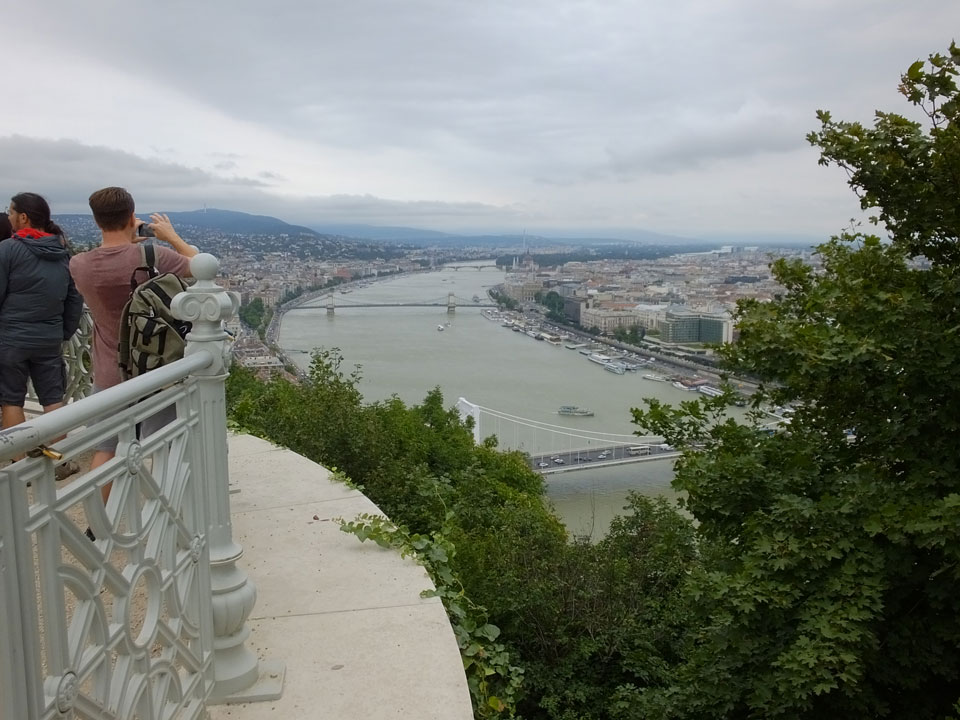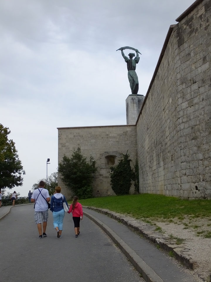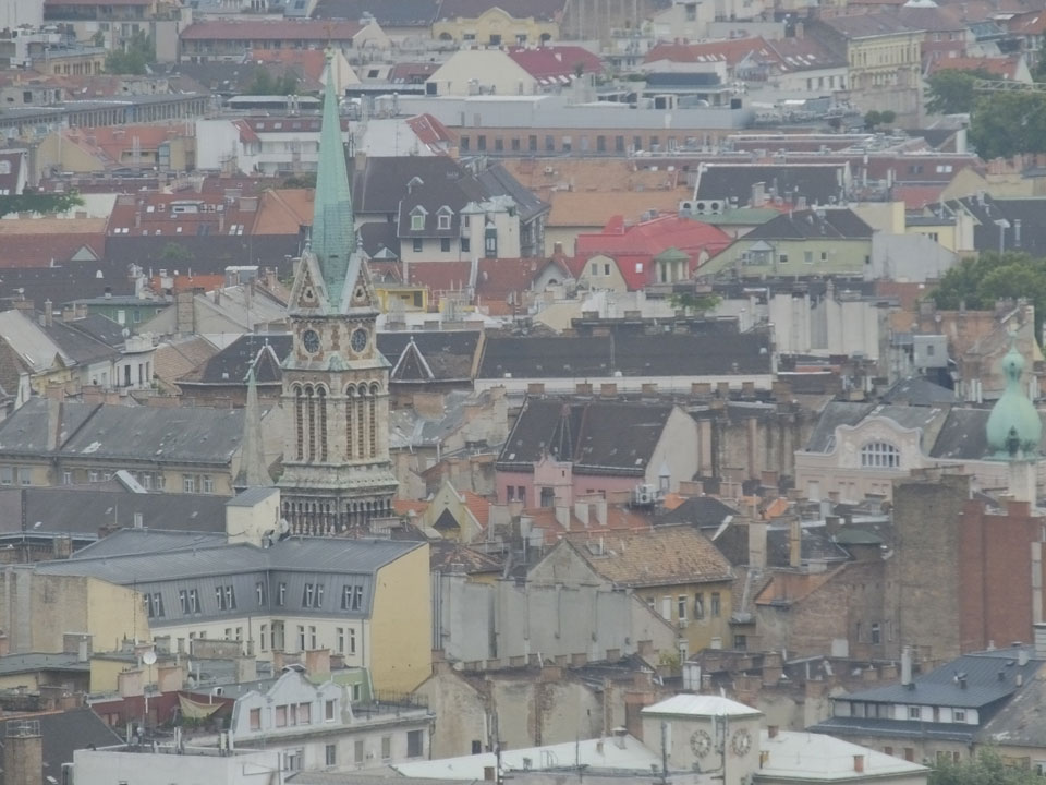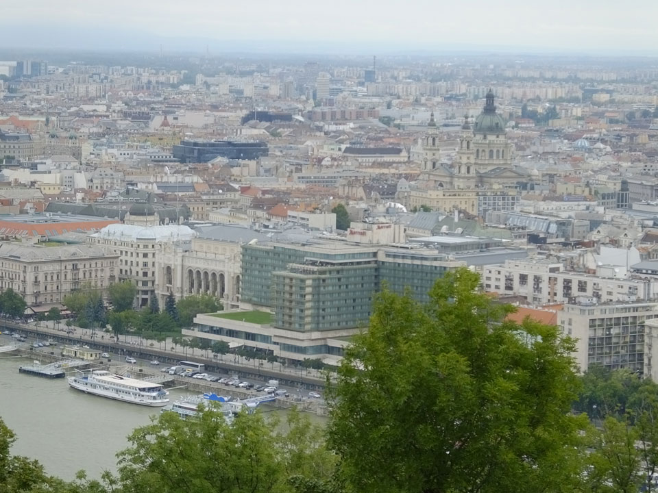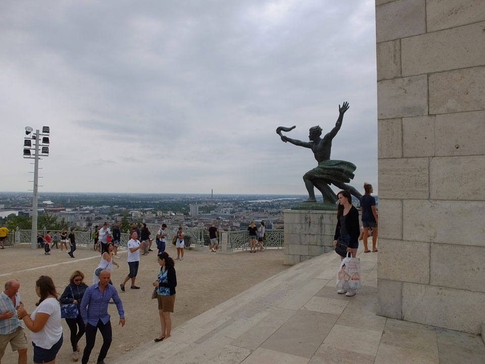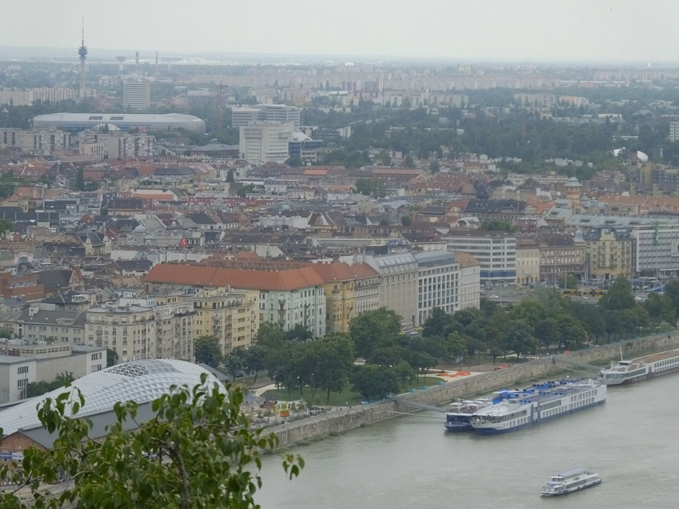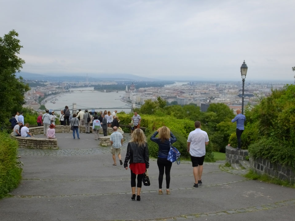 Vorbei an gestrigen Attraktionen kamen wir schließlich Nähe des Westbahnhofs an einen Umstiegspunkt auf die rote Route. Ichhatte mcih erst etwas in der Haltestelle geirrt, dann ging’s aber los. Um die 3 Hop On Hop Off Firmen fahren in Budapest. Wir fuhren auf die Citadelle. Da oben in 235m Höhe war es noch frischer. Ich knipste ein paar Bilder und wollte dann doch nicht groß herumlaufen. Mein Haus und die Kirche sah ich aber da oben, der Balkon ist auf der anderen Seite.