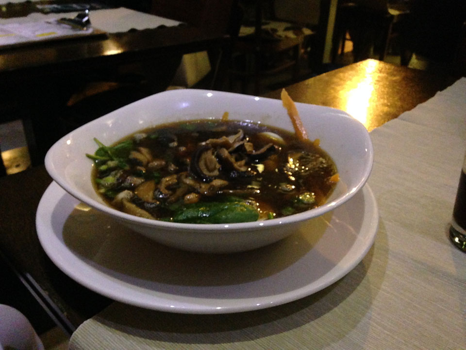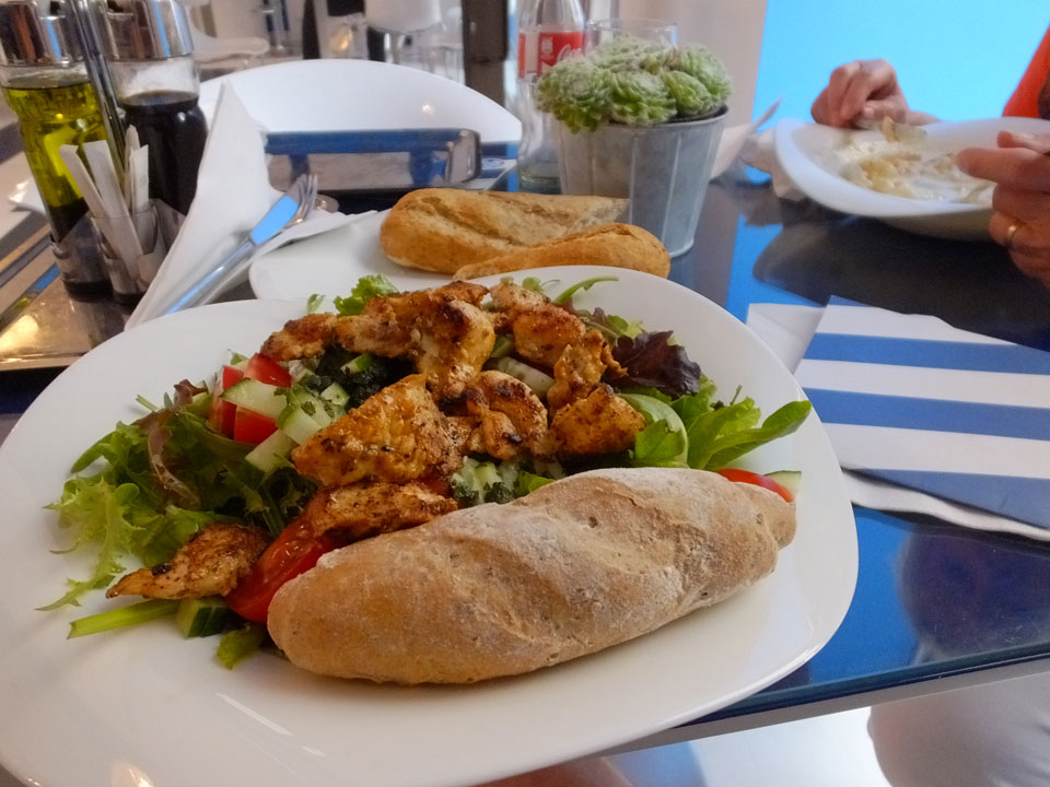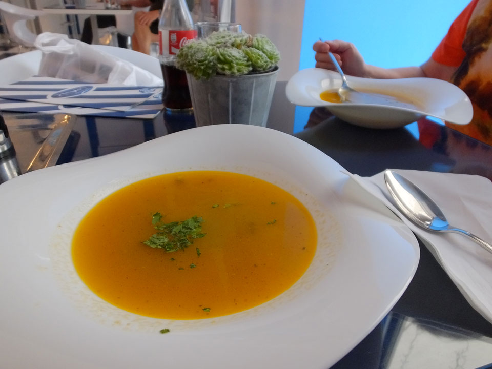 Zwei Mal die Suppe des Tages (400 HUF) – das waren normale Preise. Ich bestellte mir Fitness Brot, das aber mit nüscht kam. Also dann auch noch einen Salat.